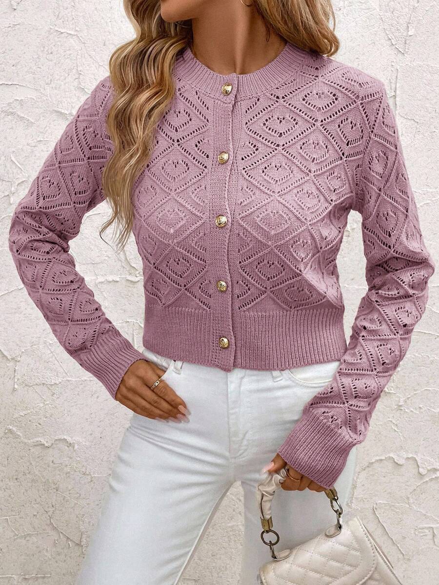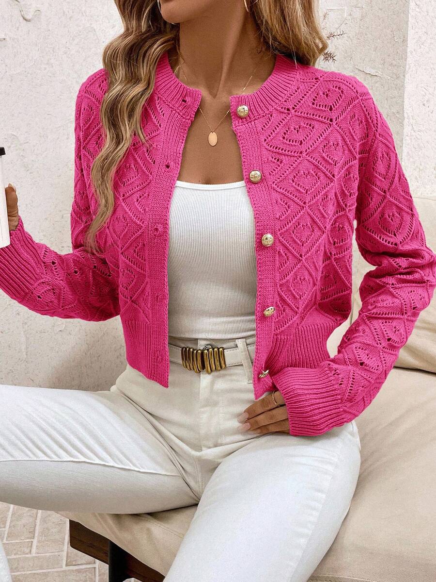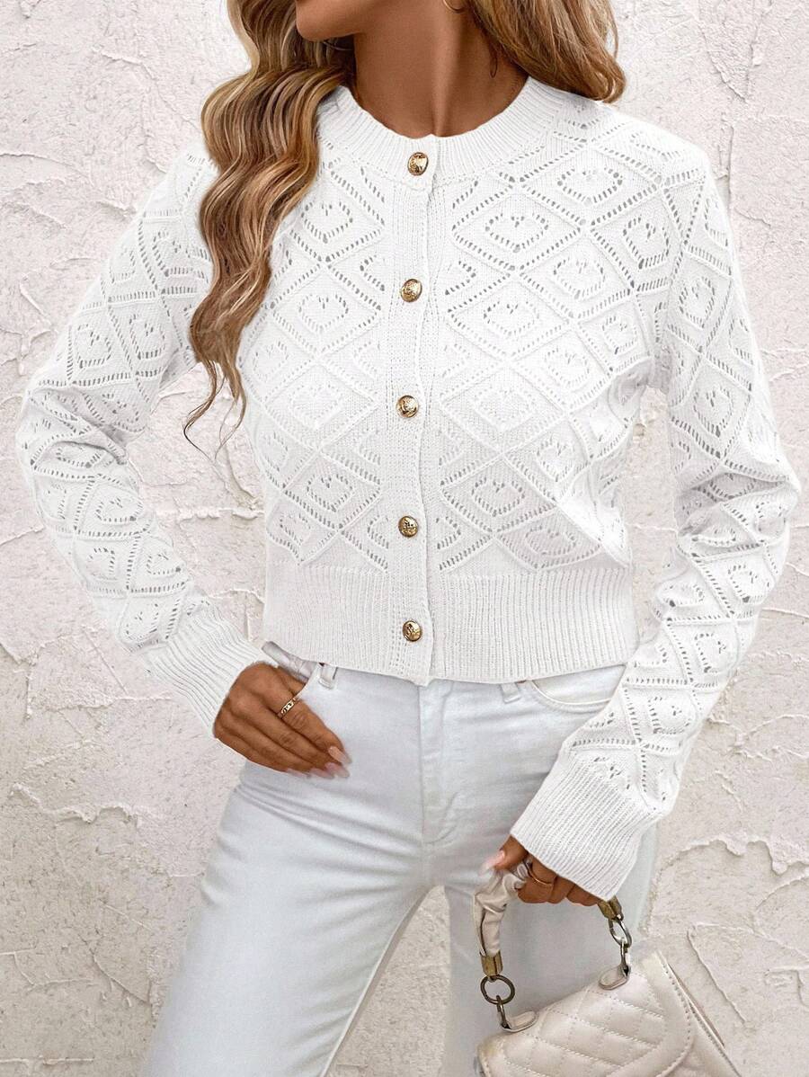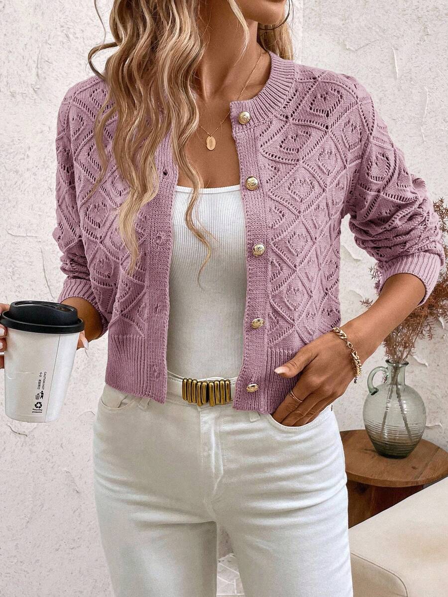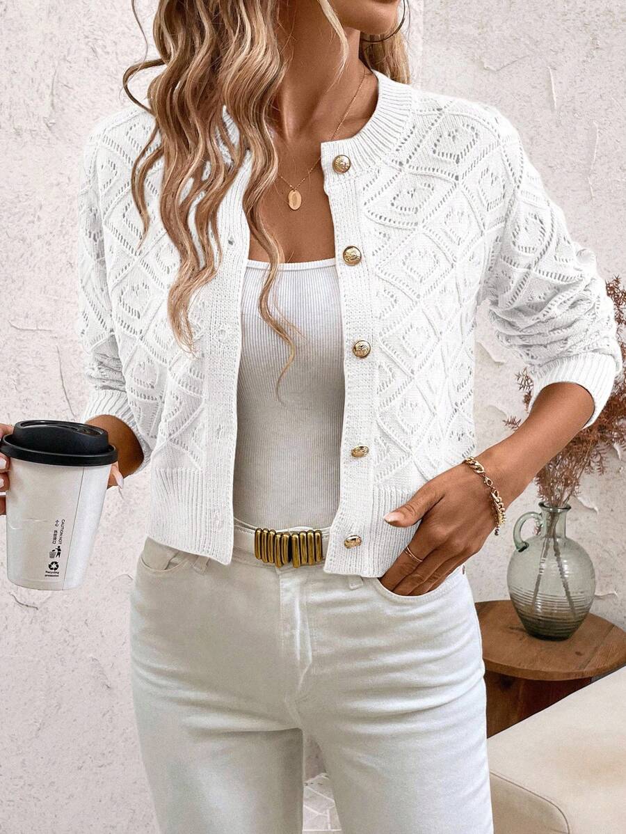Cardigan a maglia tinta unita con scollo rotondo, spalle a caduta e lavorazione traforata