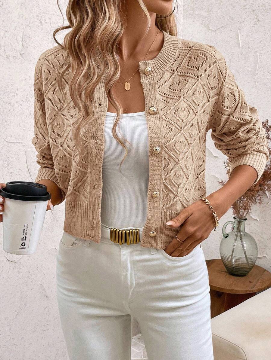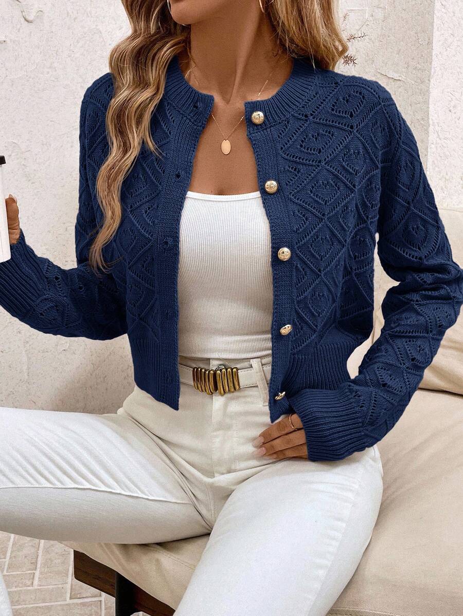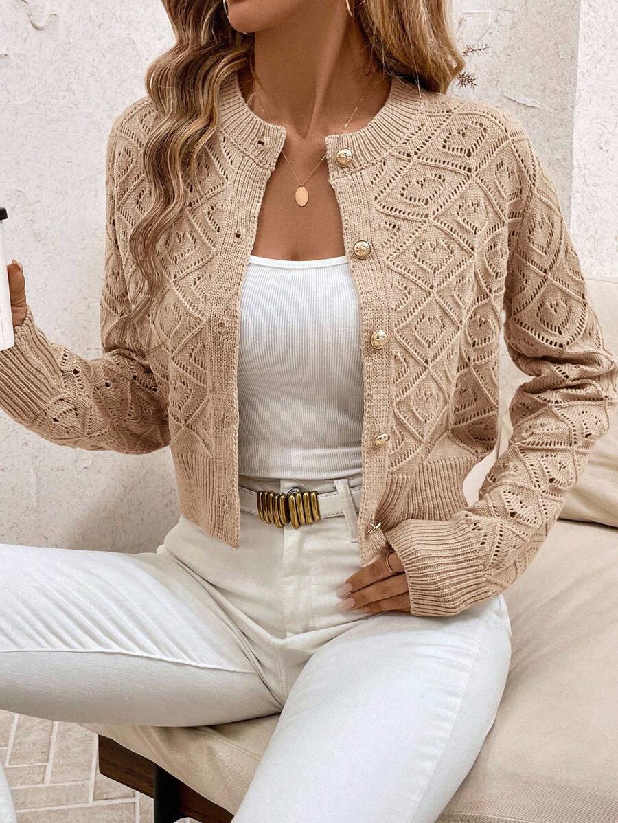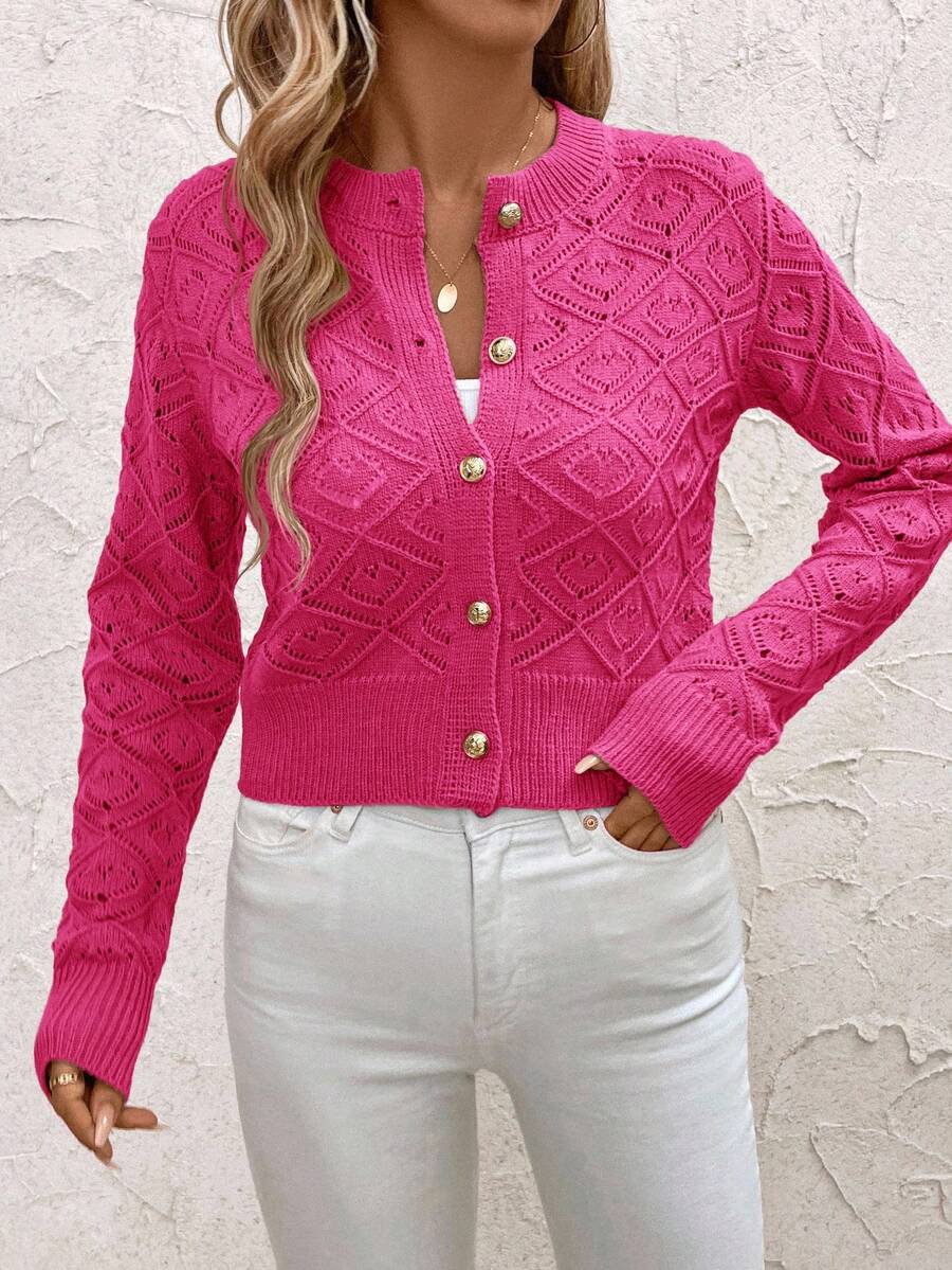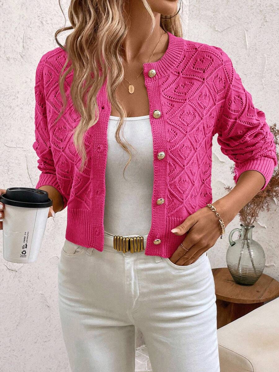 Cardigan a maglia tinta unita con scollo rotondo, spalle a caduta e lavorazione traforata