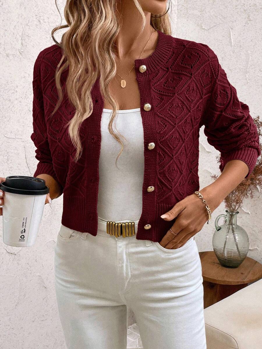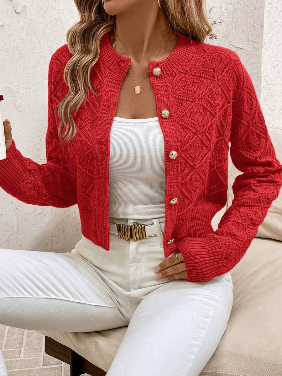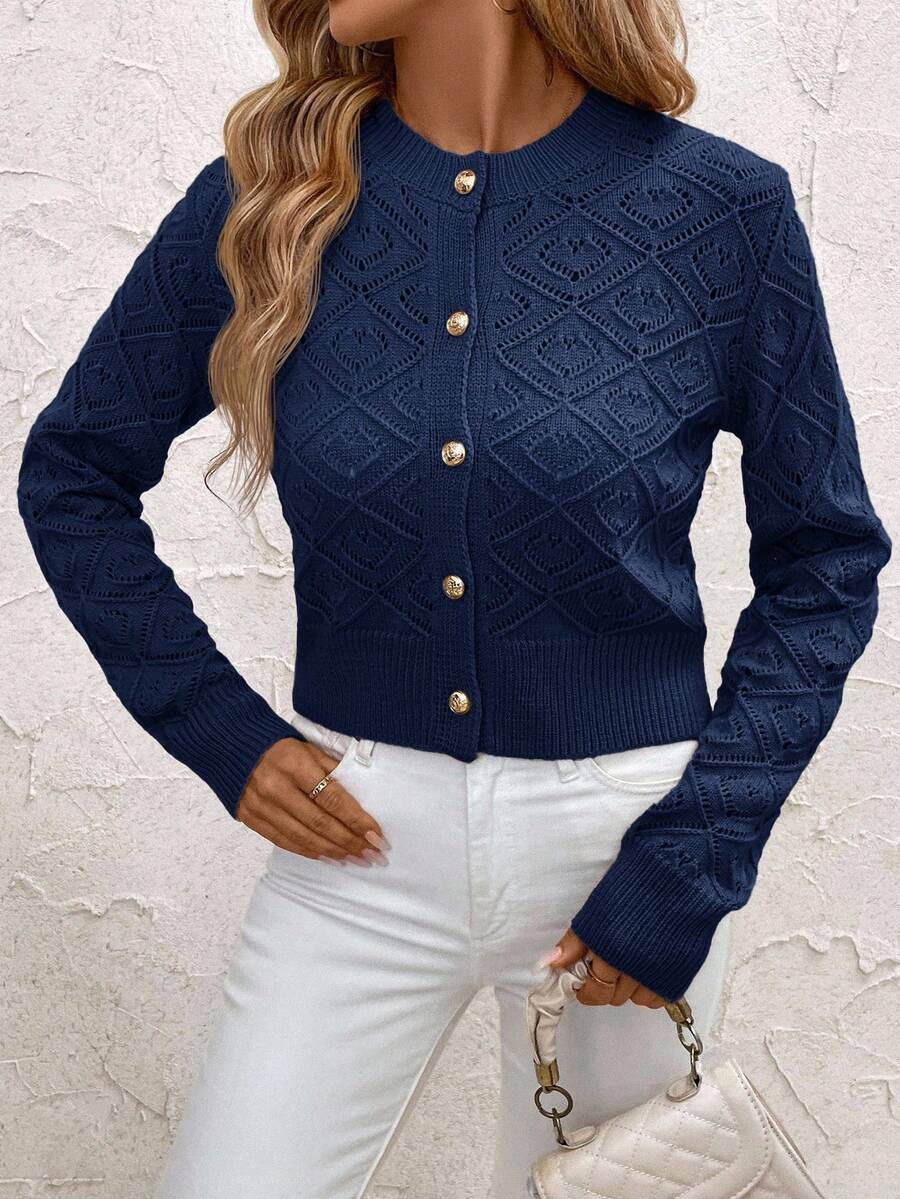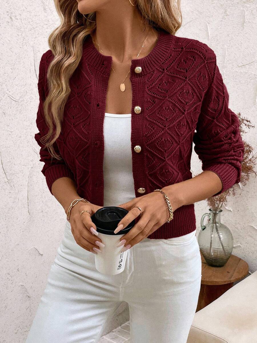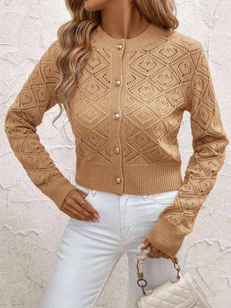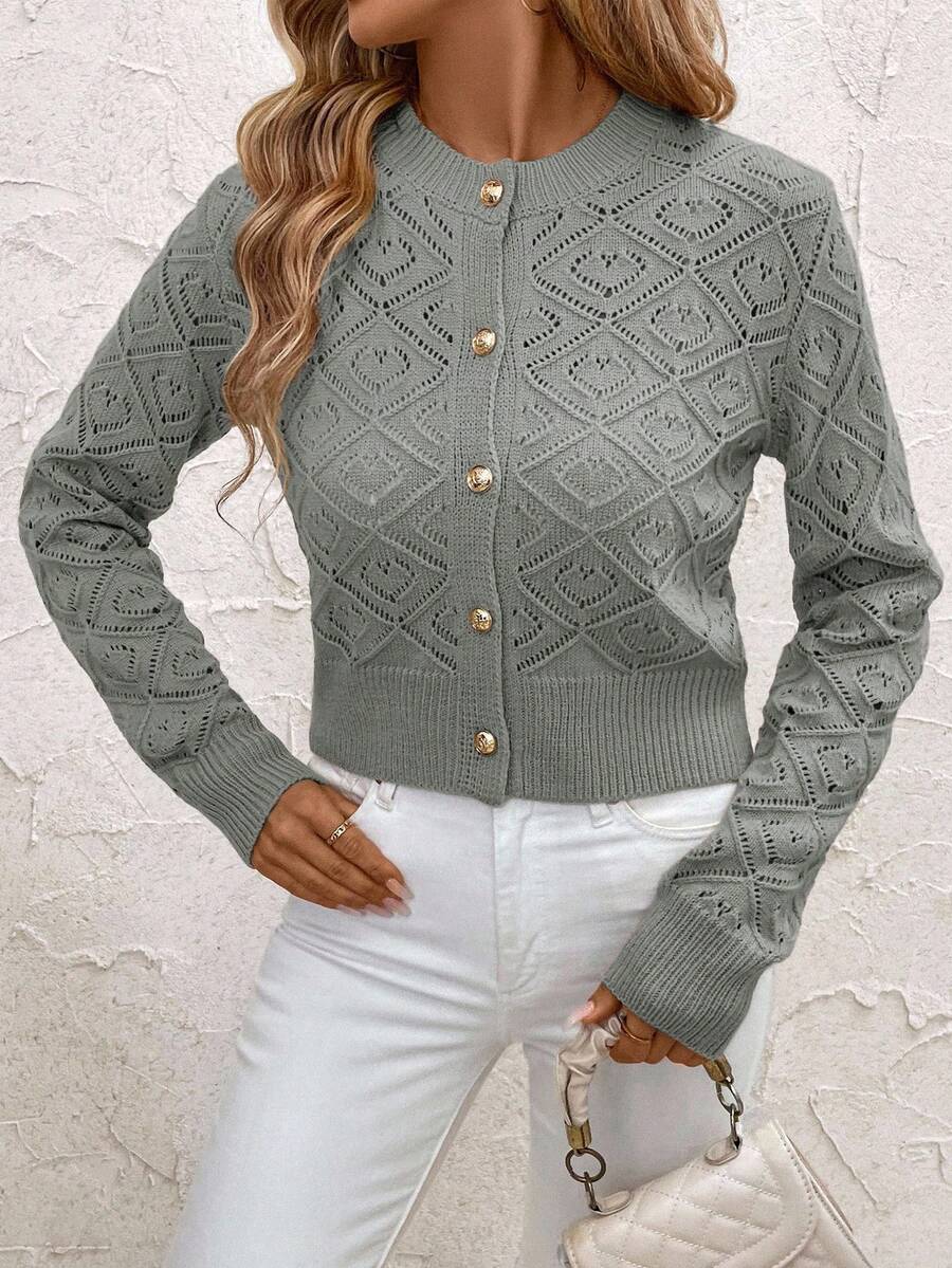 Cardigan a maglia tinta unita con scollo rotondo, spalle a caduta e lavorazione traforata