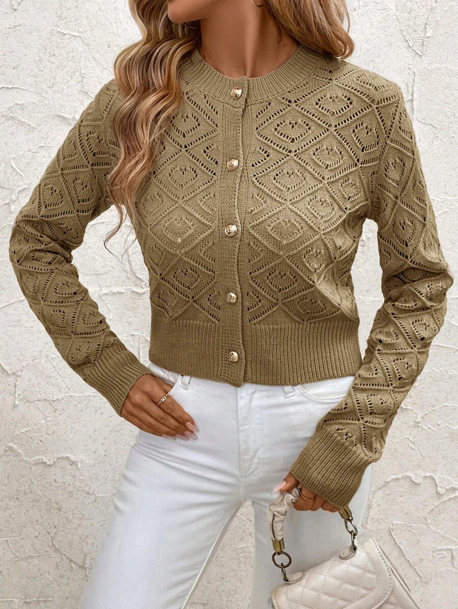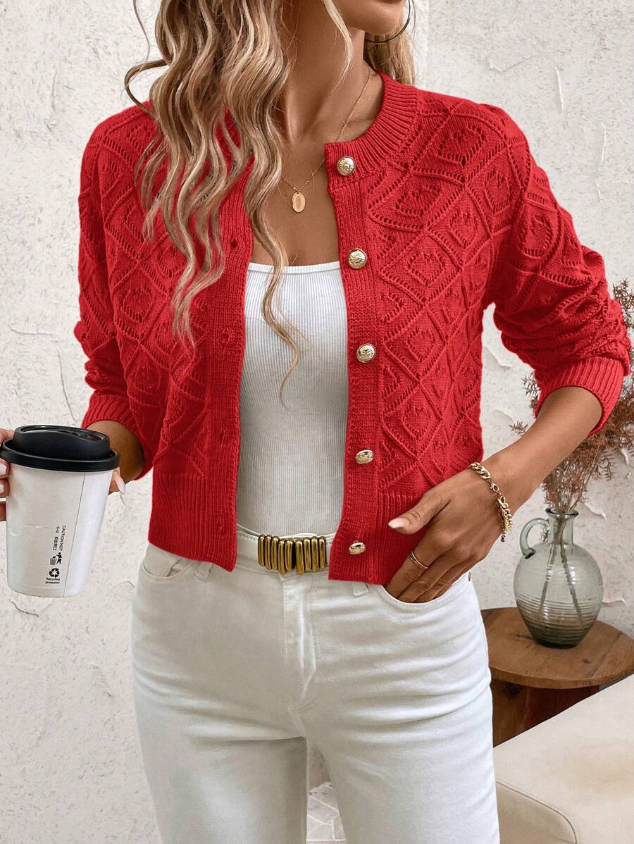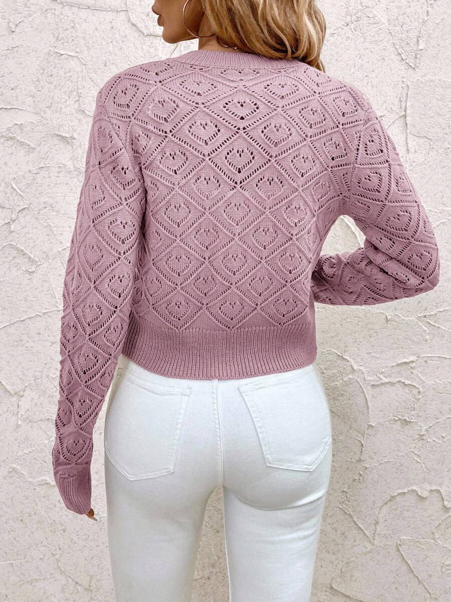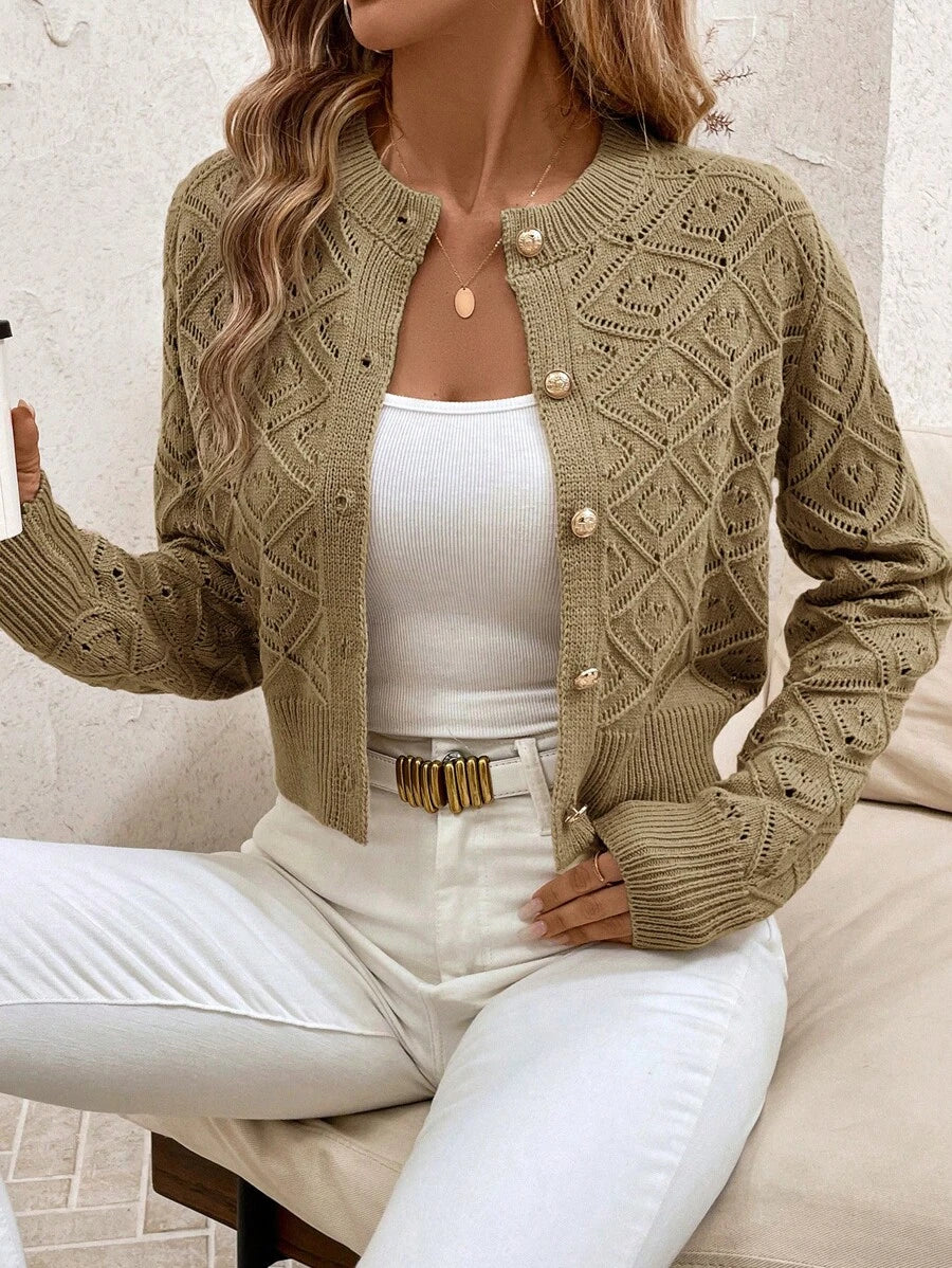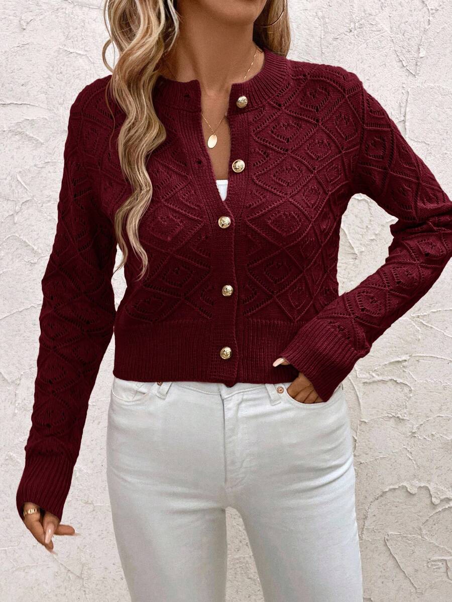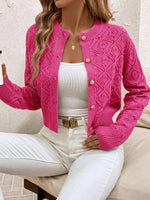 Cardigan a maglia tinta unita con scollo rotondo, spalle a caduta e lavorazione traforata