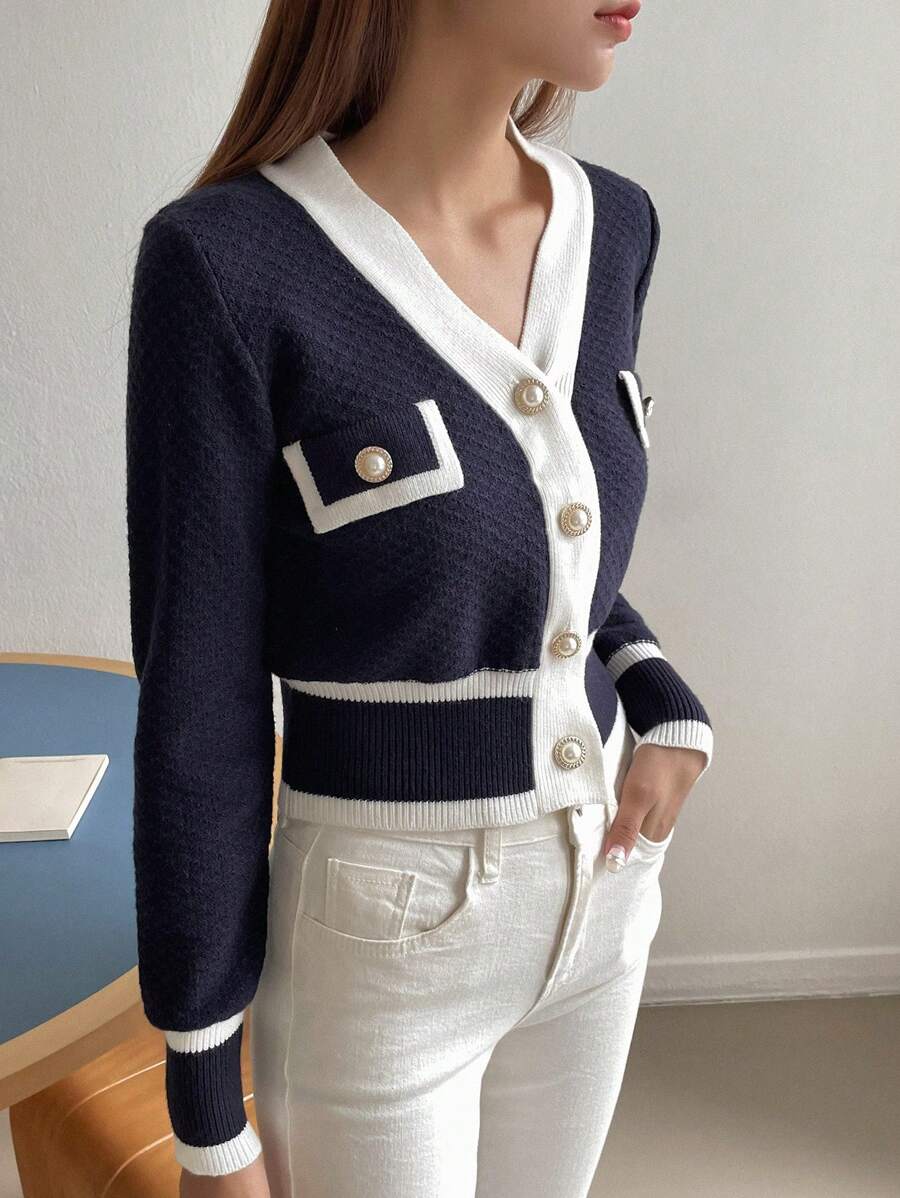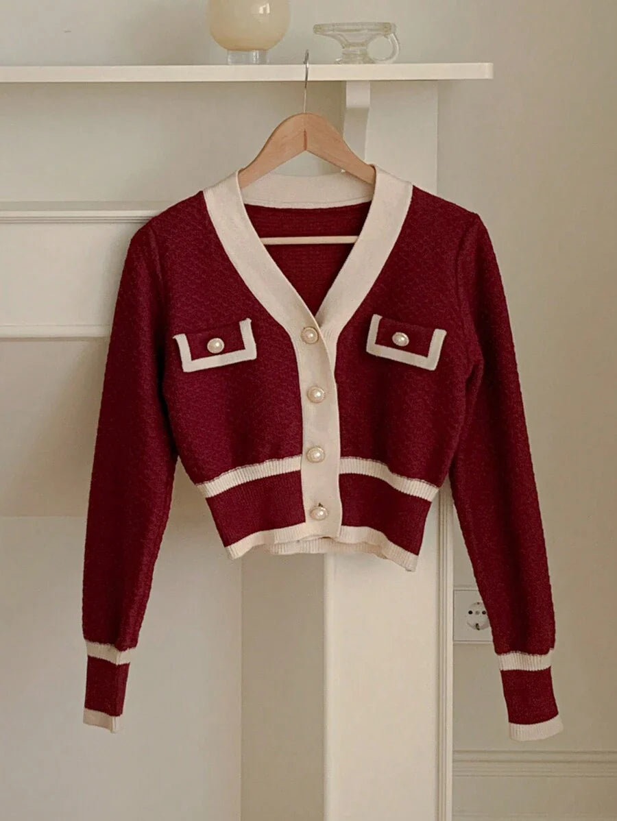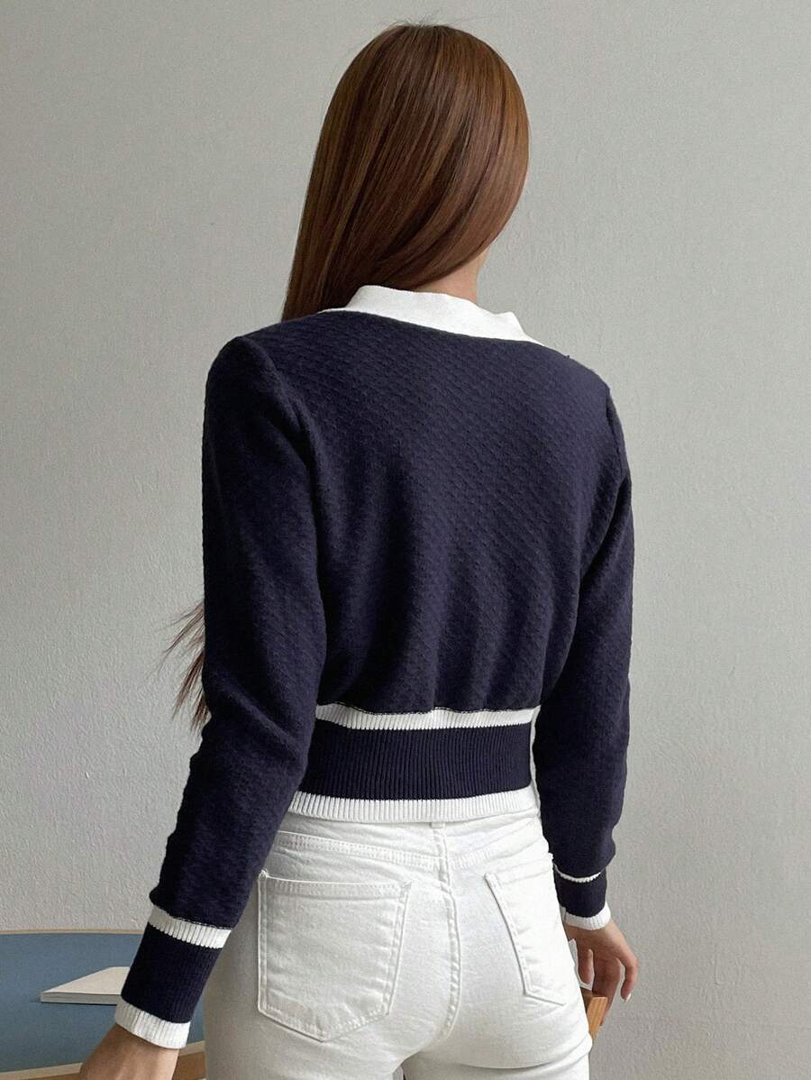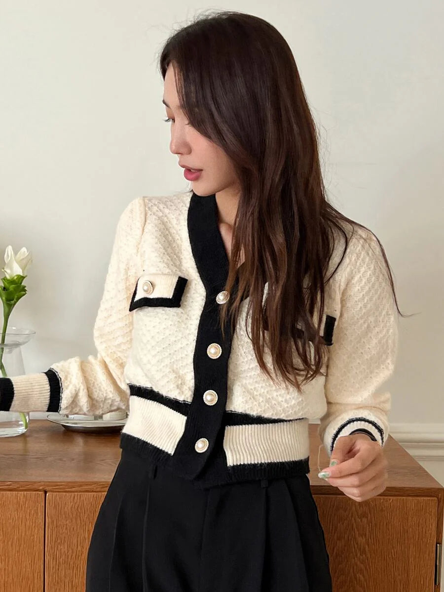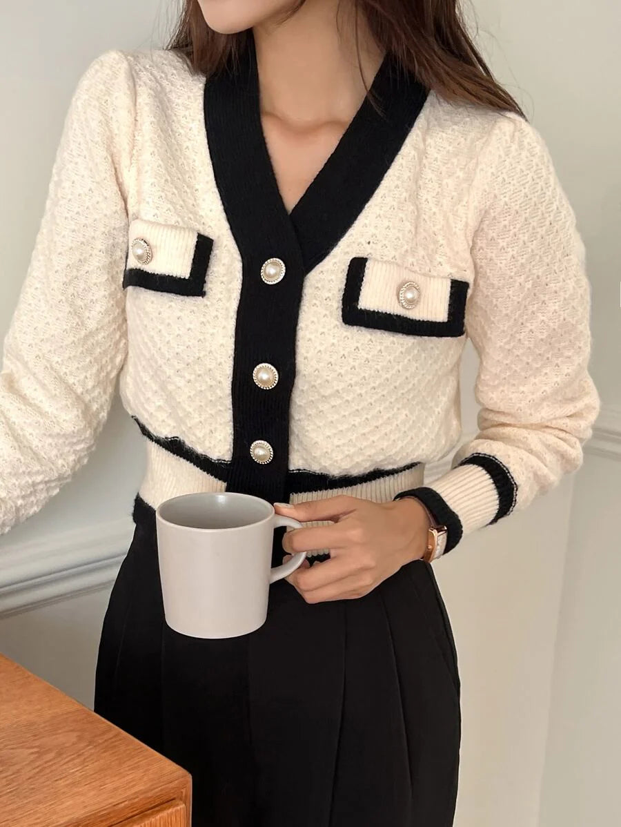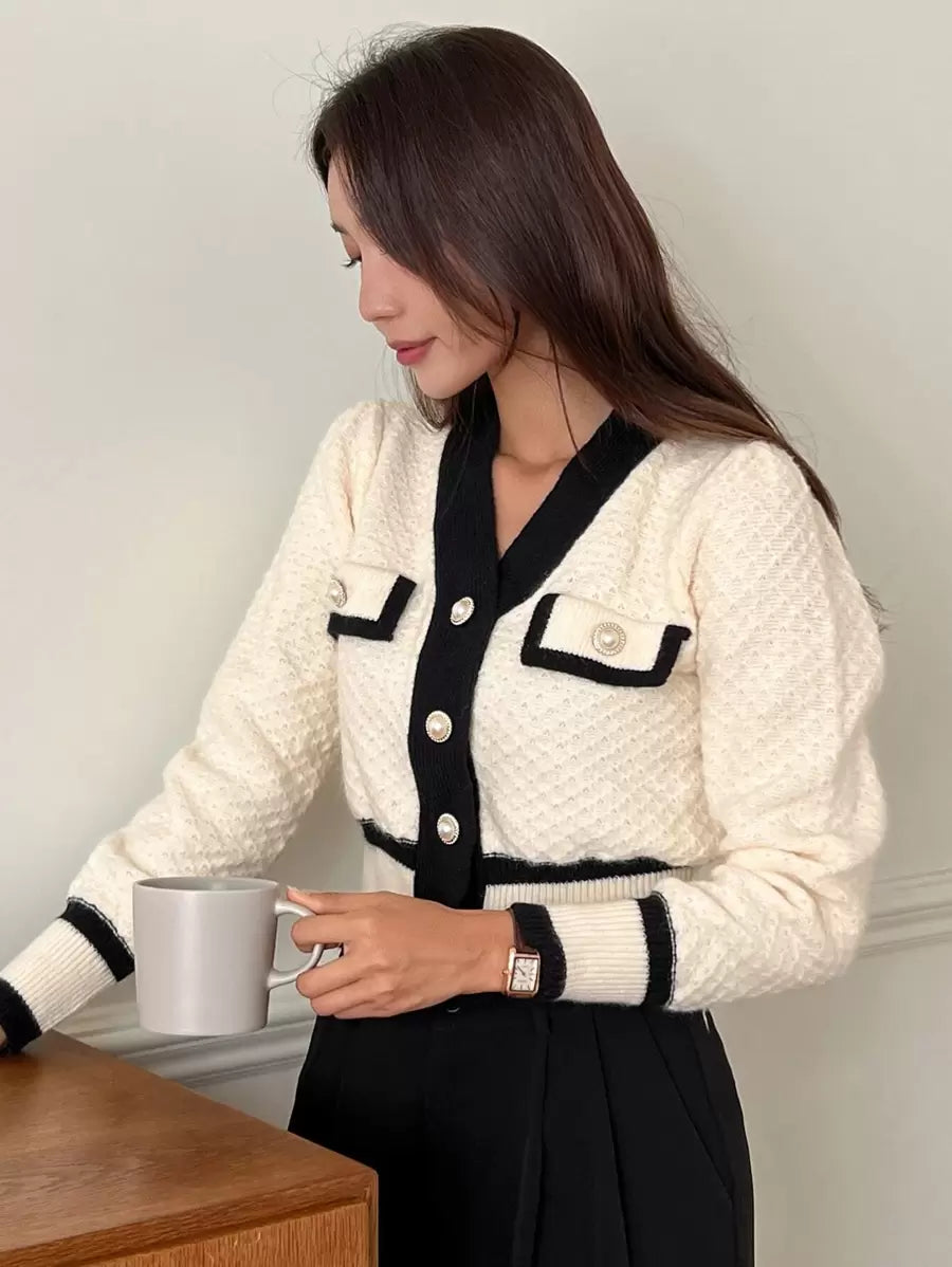 Cardigan con bottoni e bordi a contrasto, top a maniche lunghe