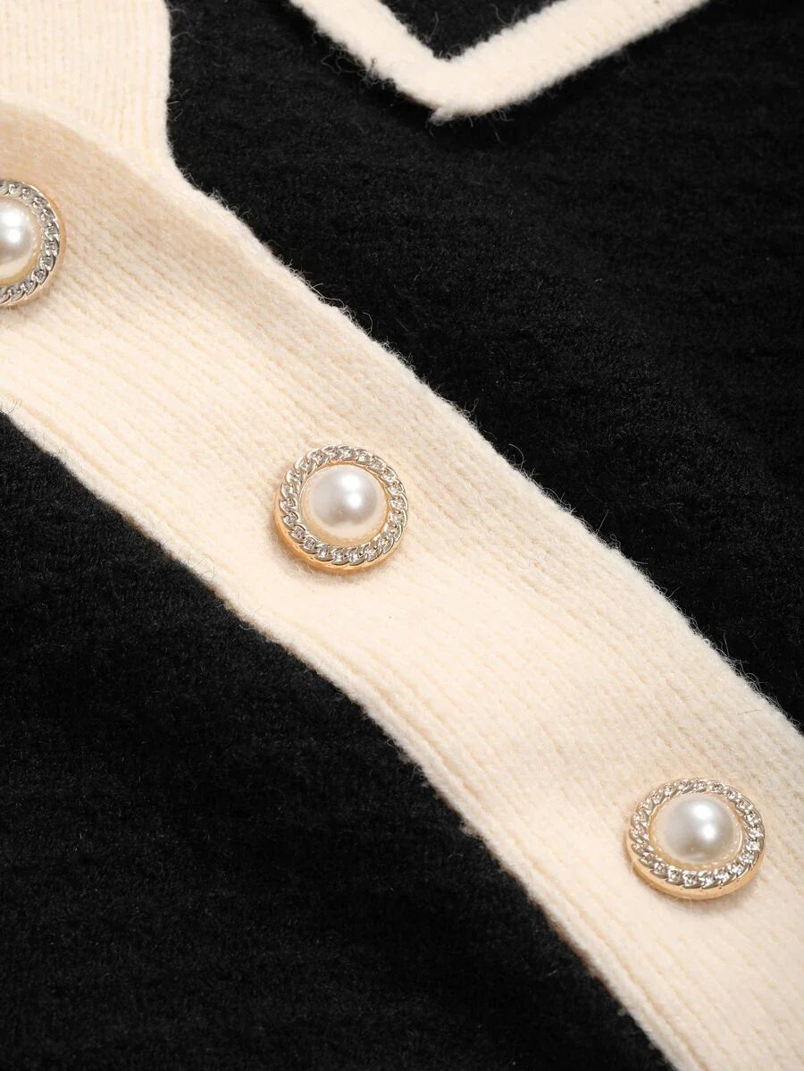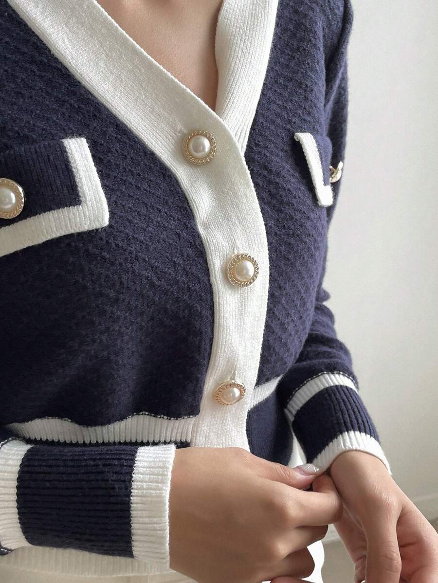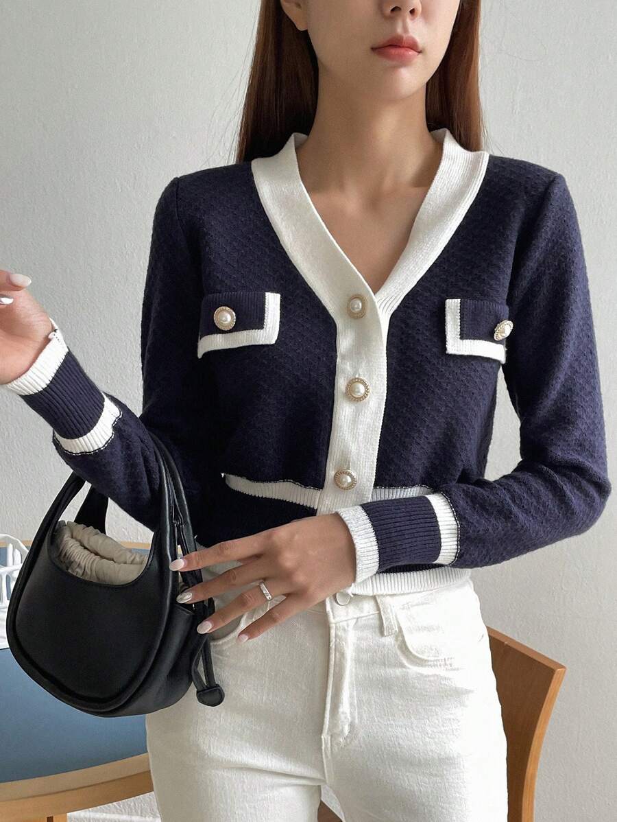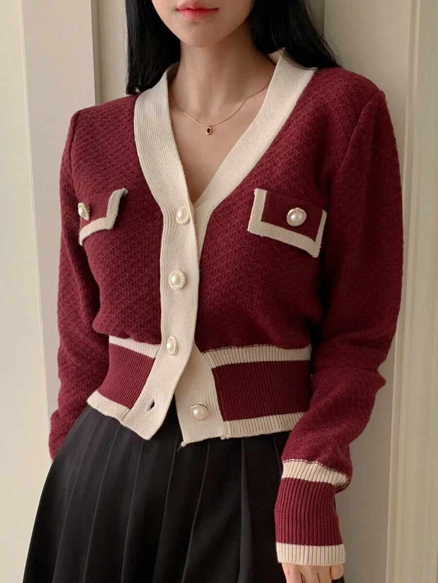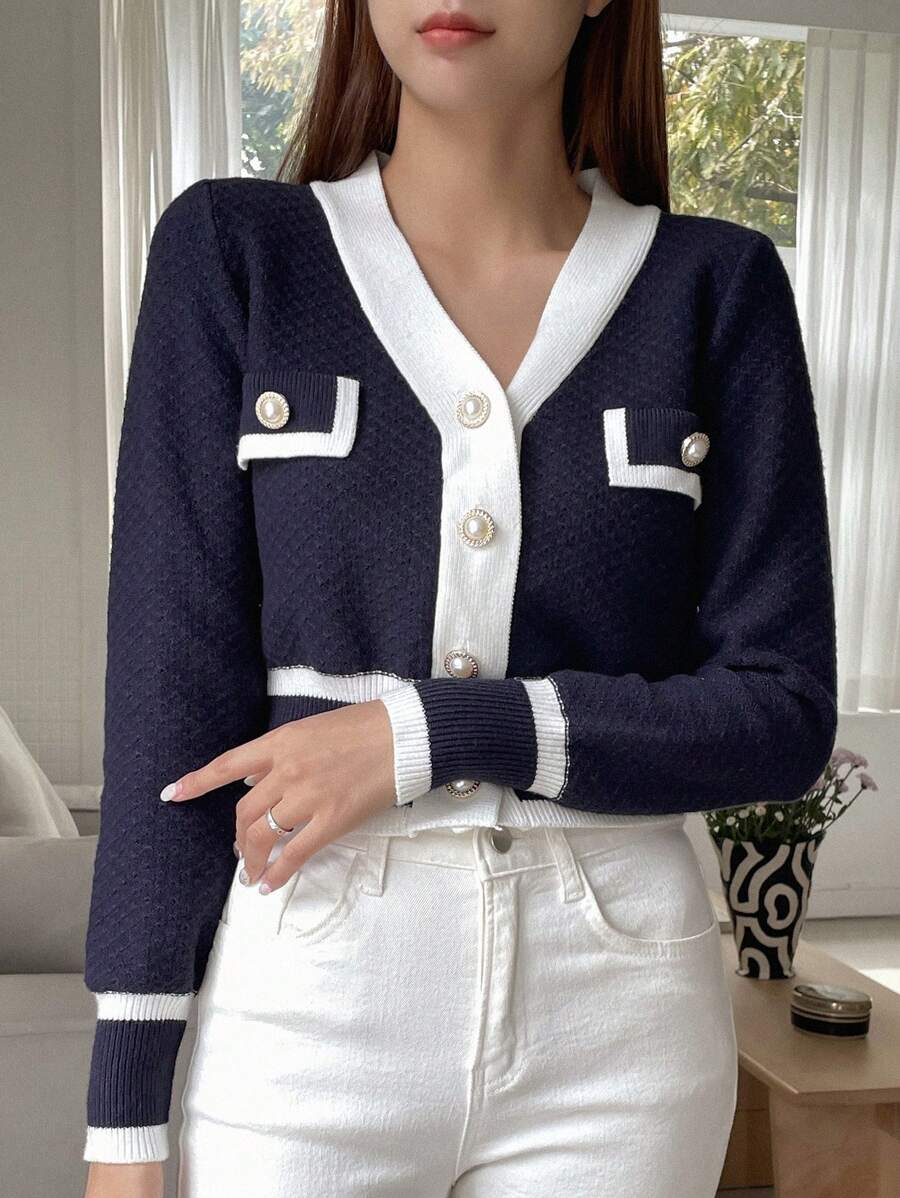 Cardigan con bottoni e bordi a contrasto, top a maniche lunghe