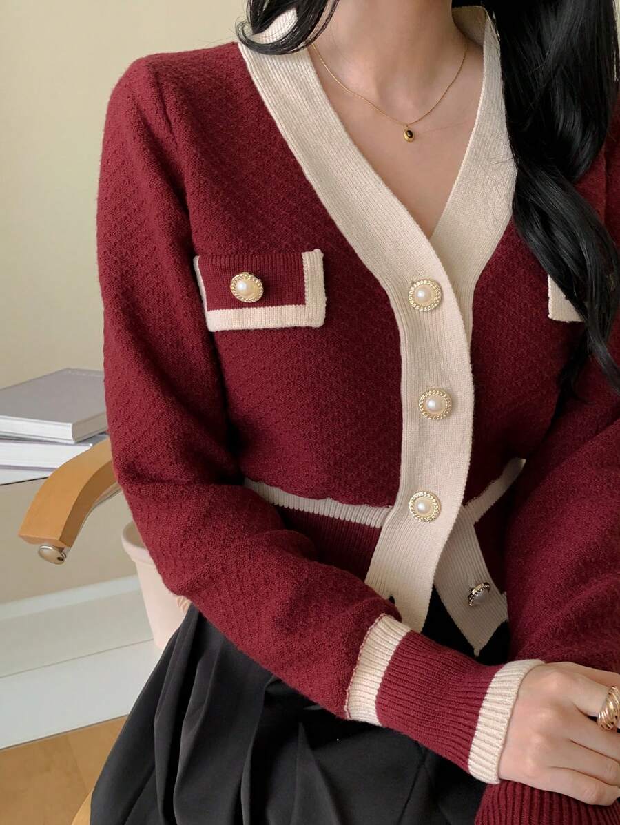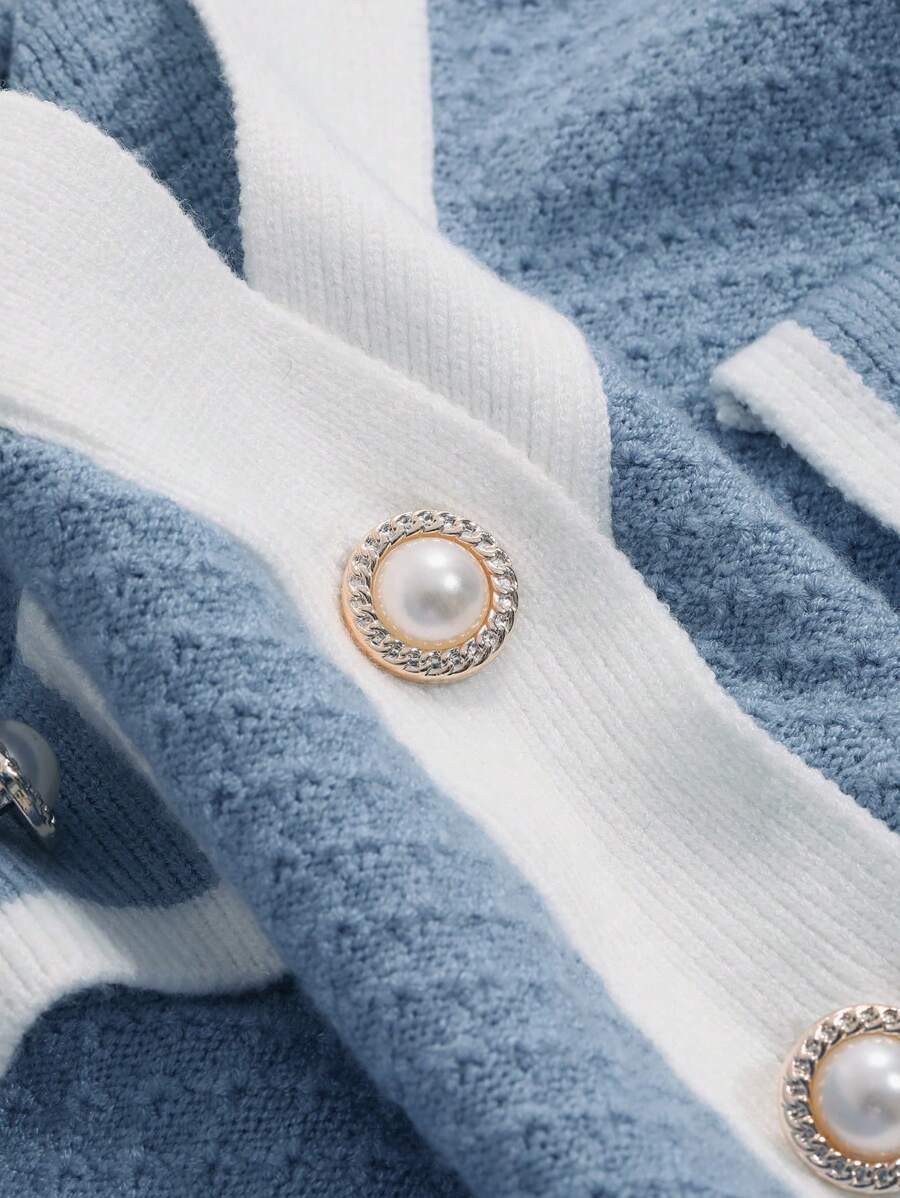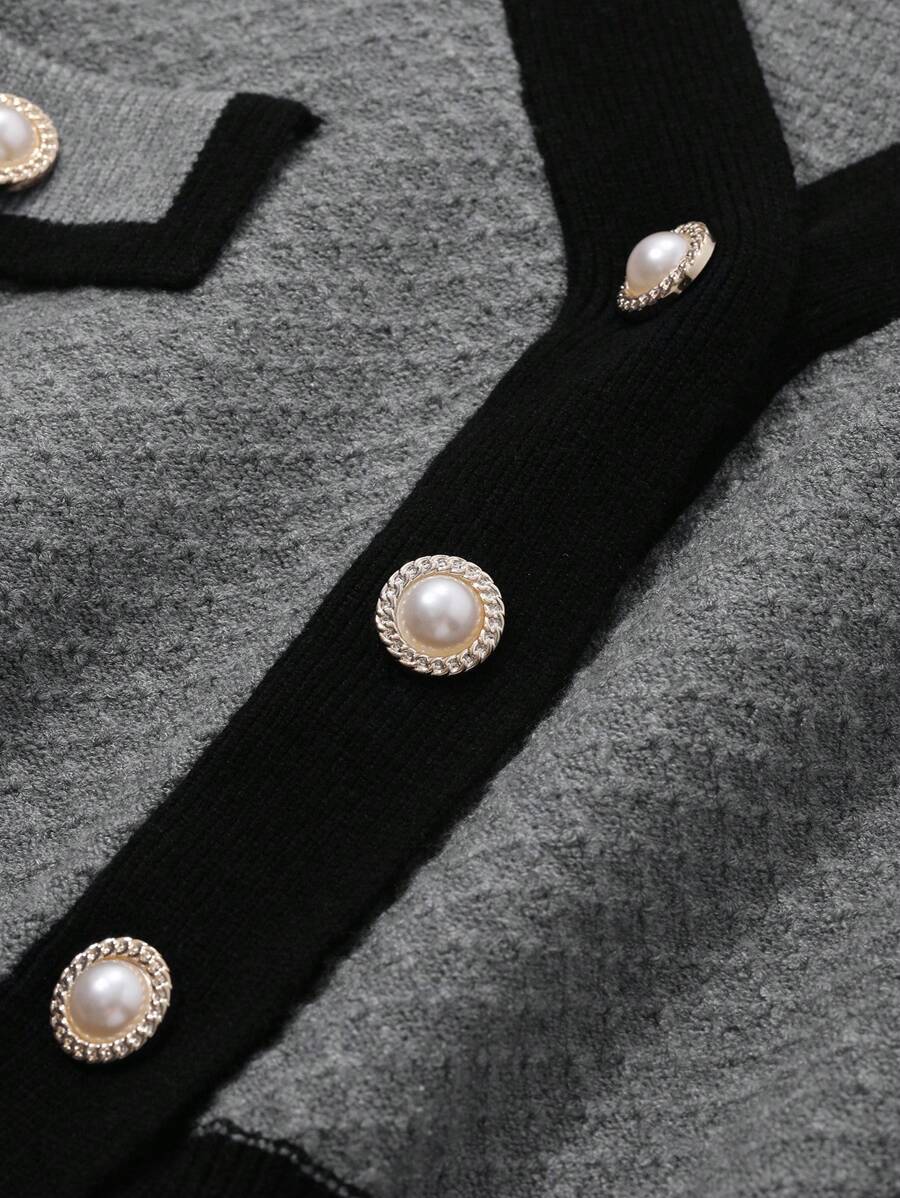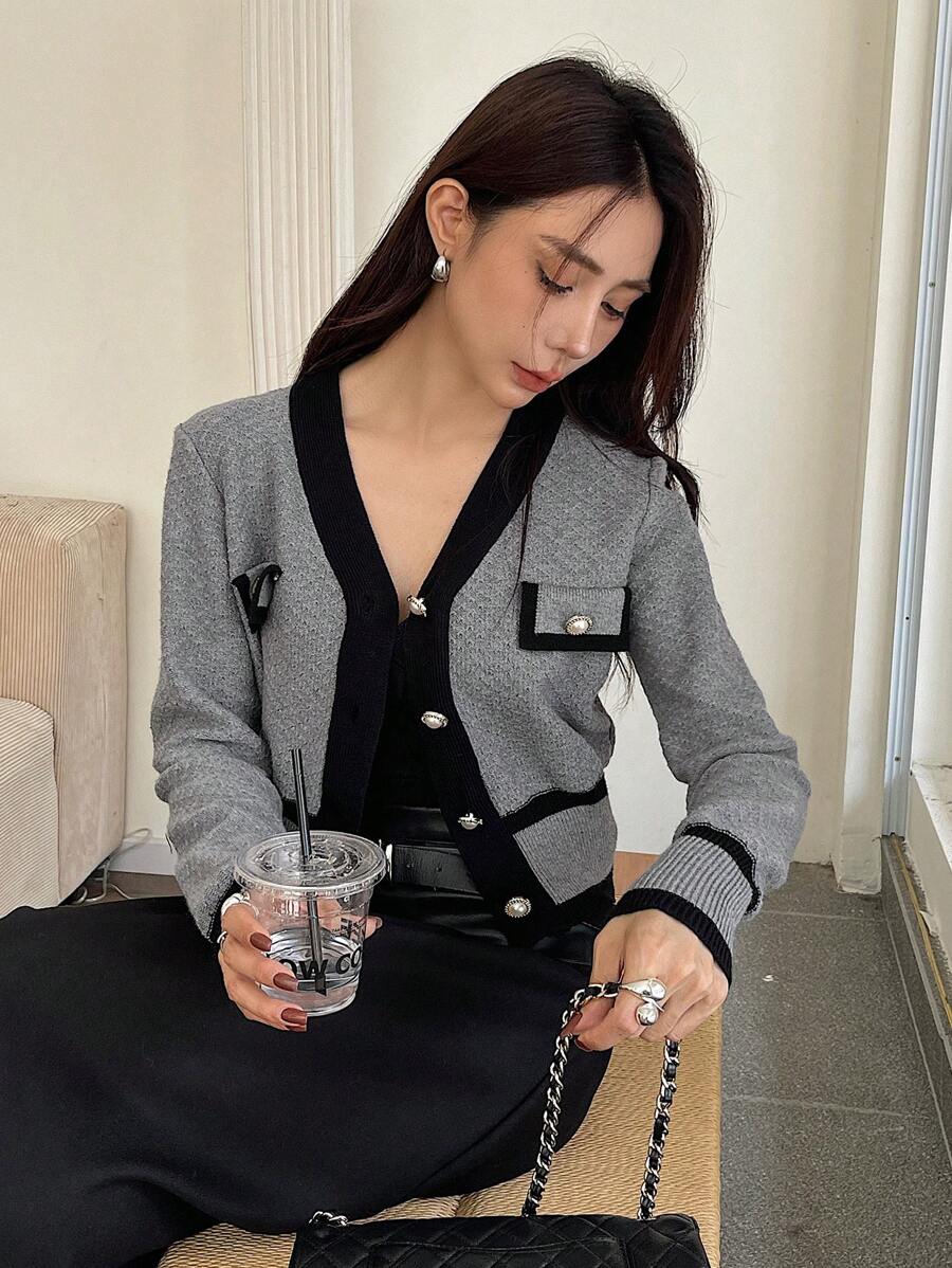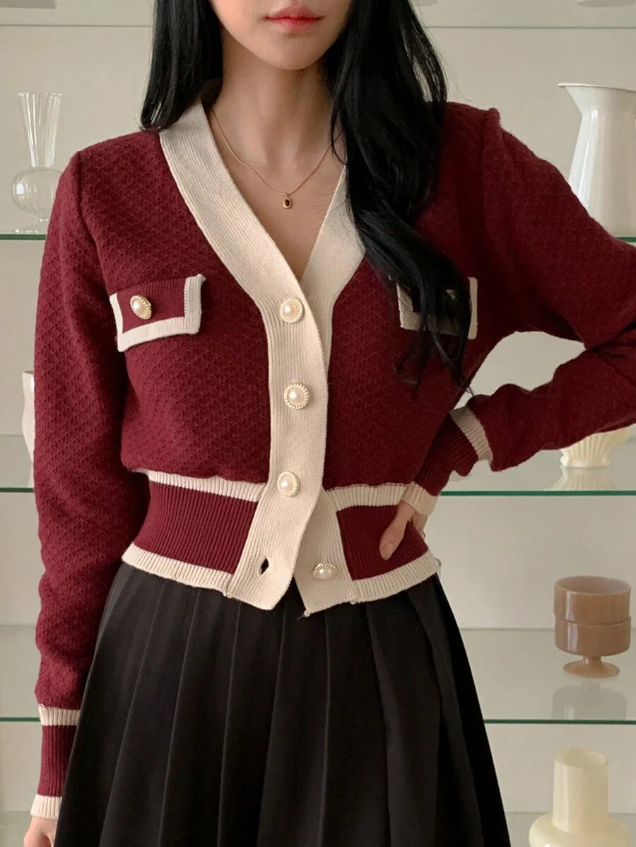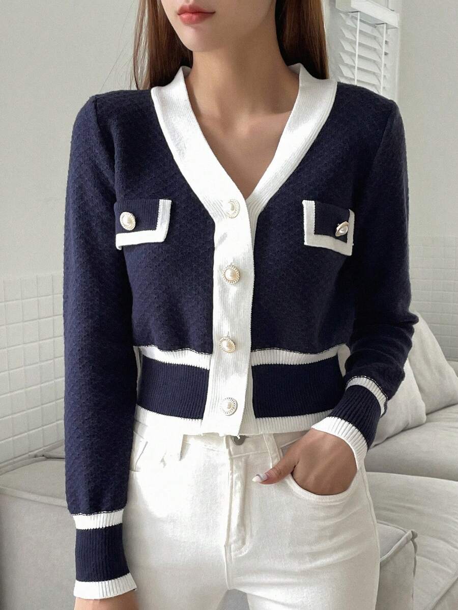 Cardigan con bottoni e bordi a contrasto, top a maniche lunghe