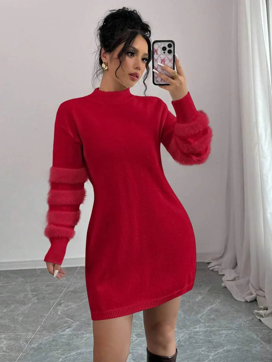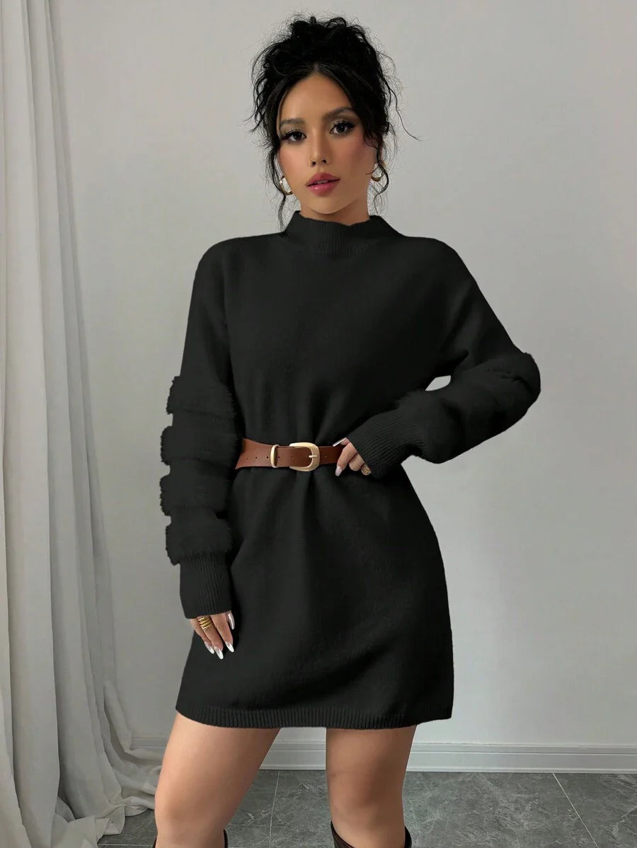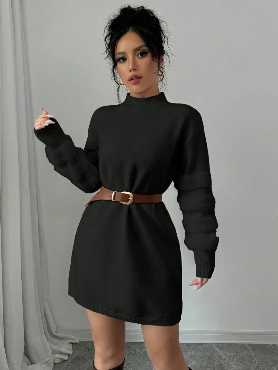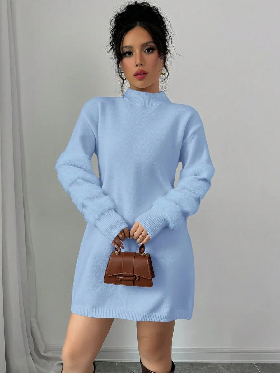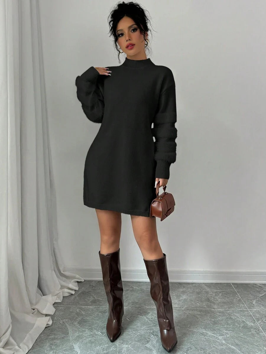 Abito maglione corto a maniche lunghe in maglia a collo alto, in tinta unita