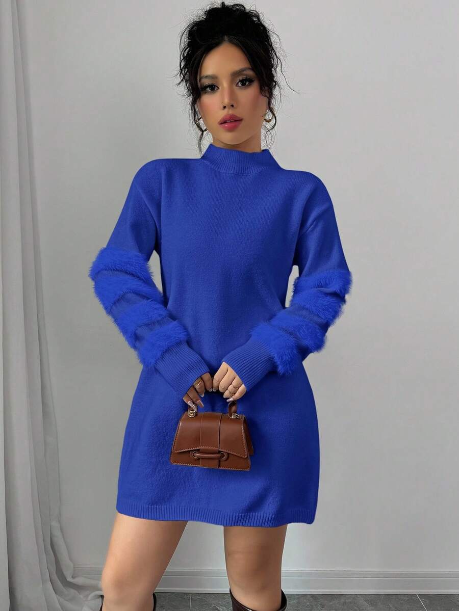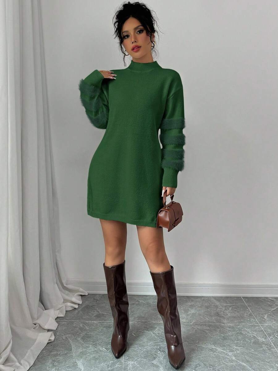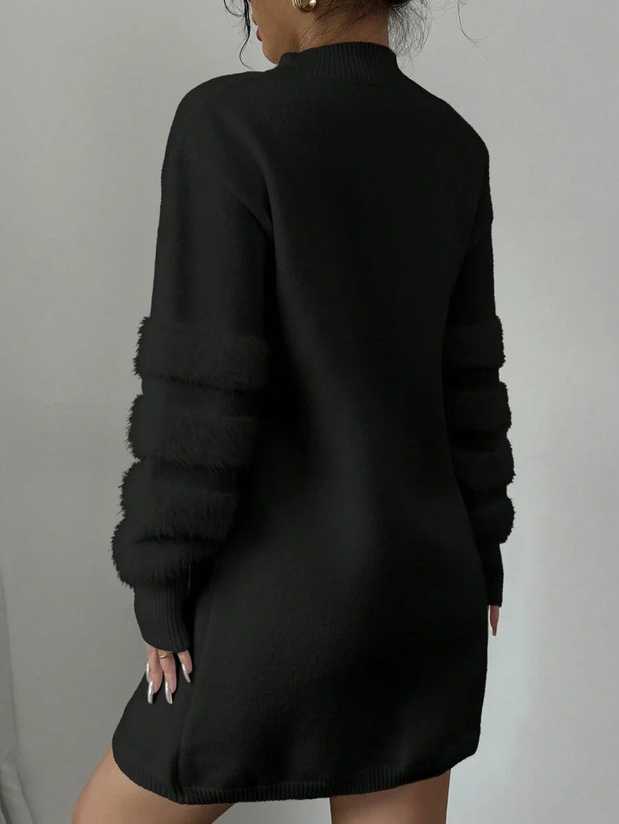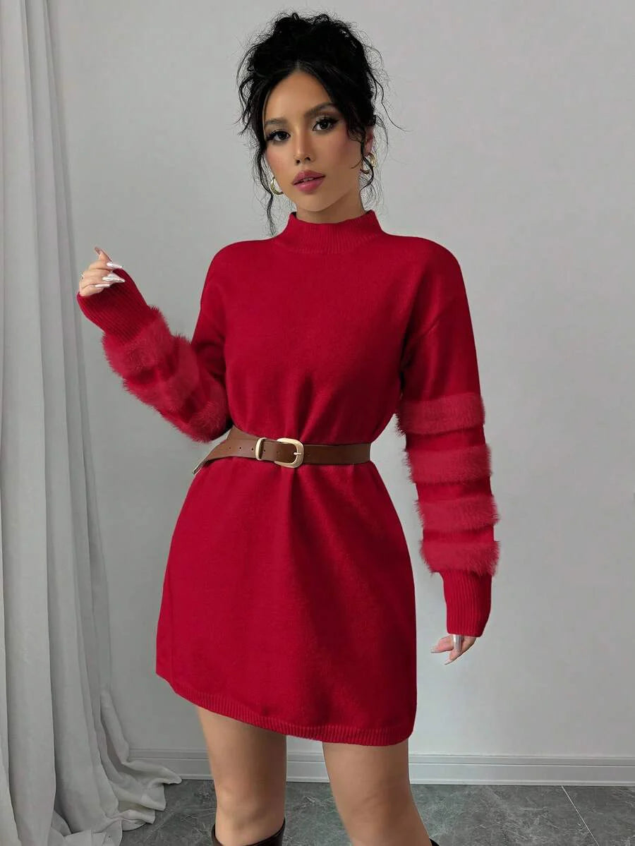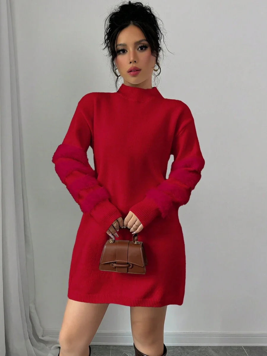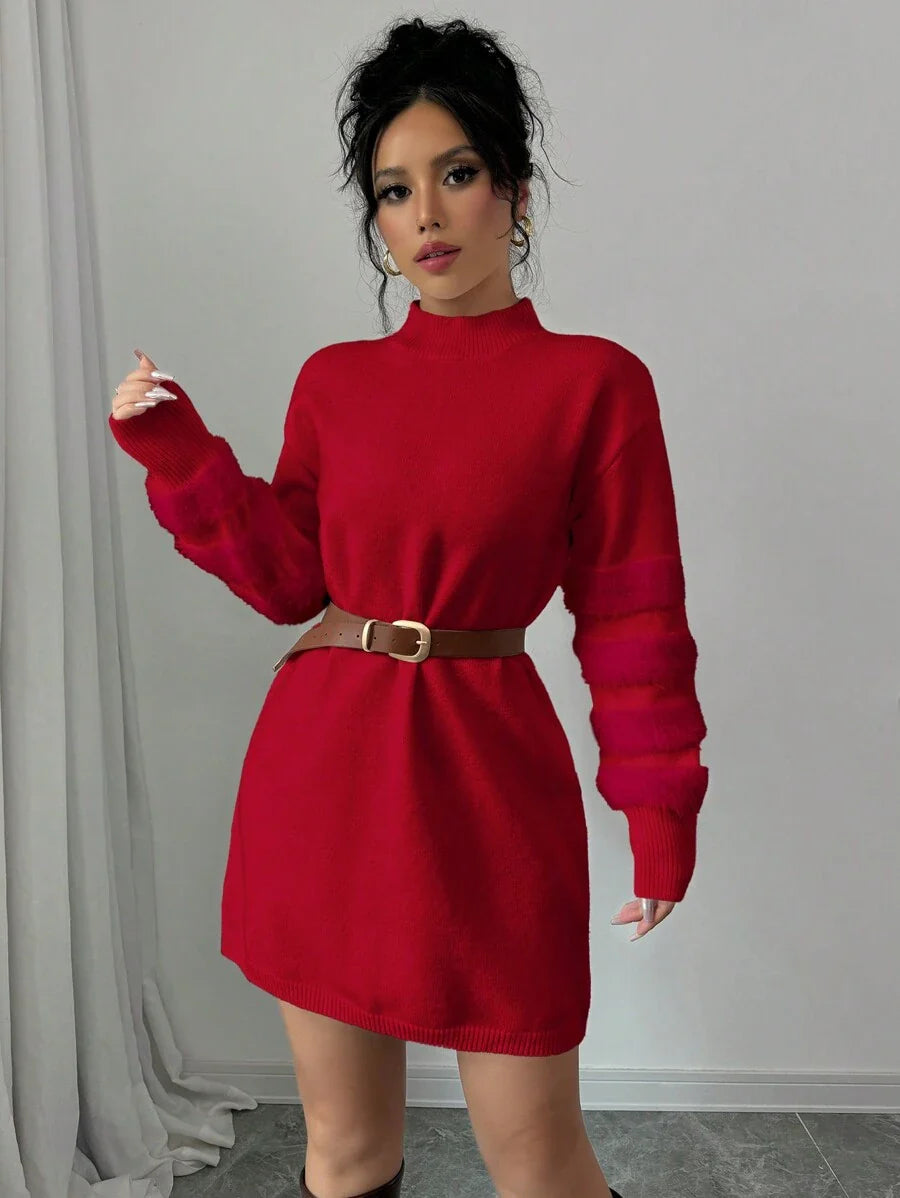 Abito maglione corto a maniche lunghe in maglia a collo alto, in tinta unita