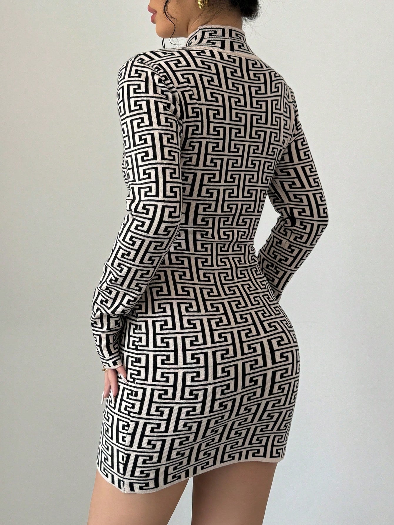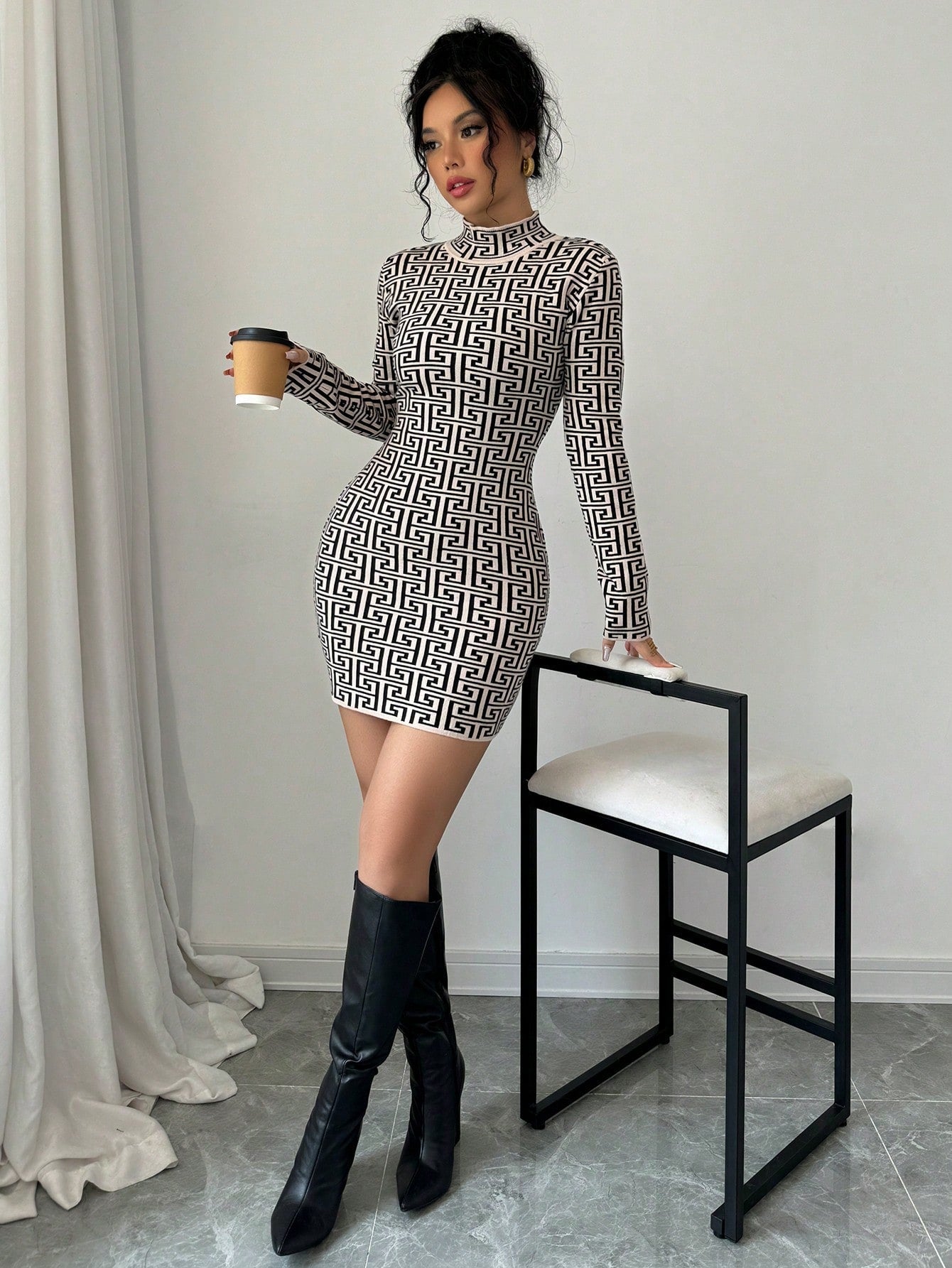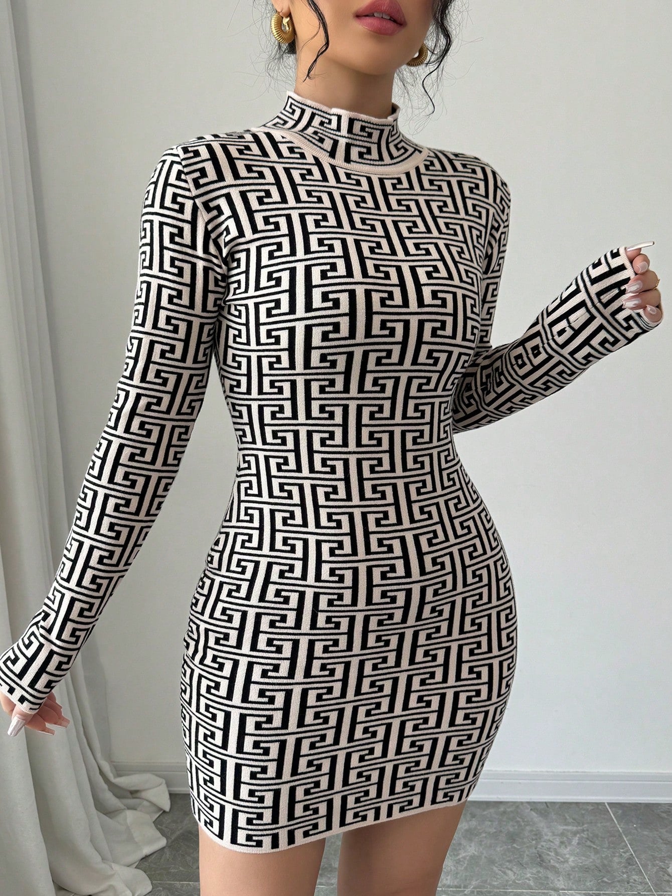 Abito maglione elegante aderente a maniche lunghe con colletto alto e motivo geometrico