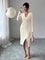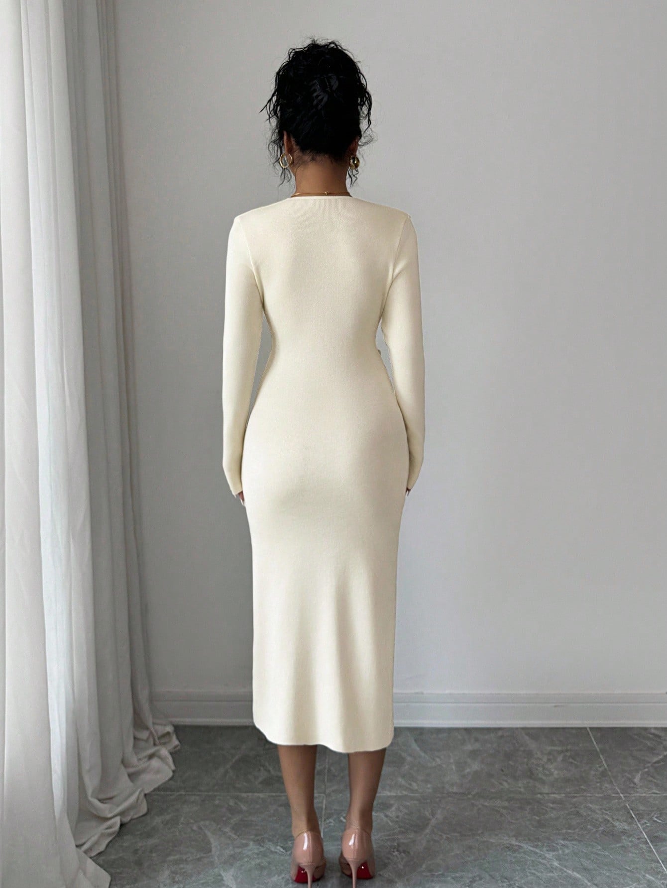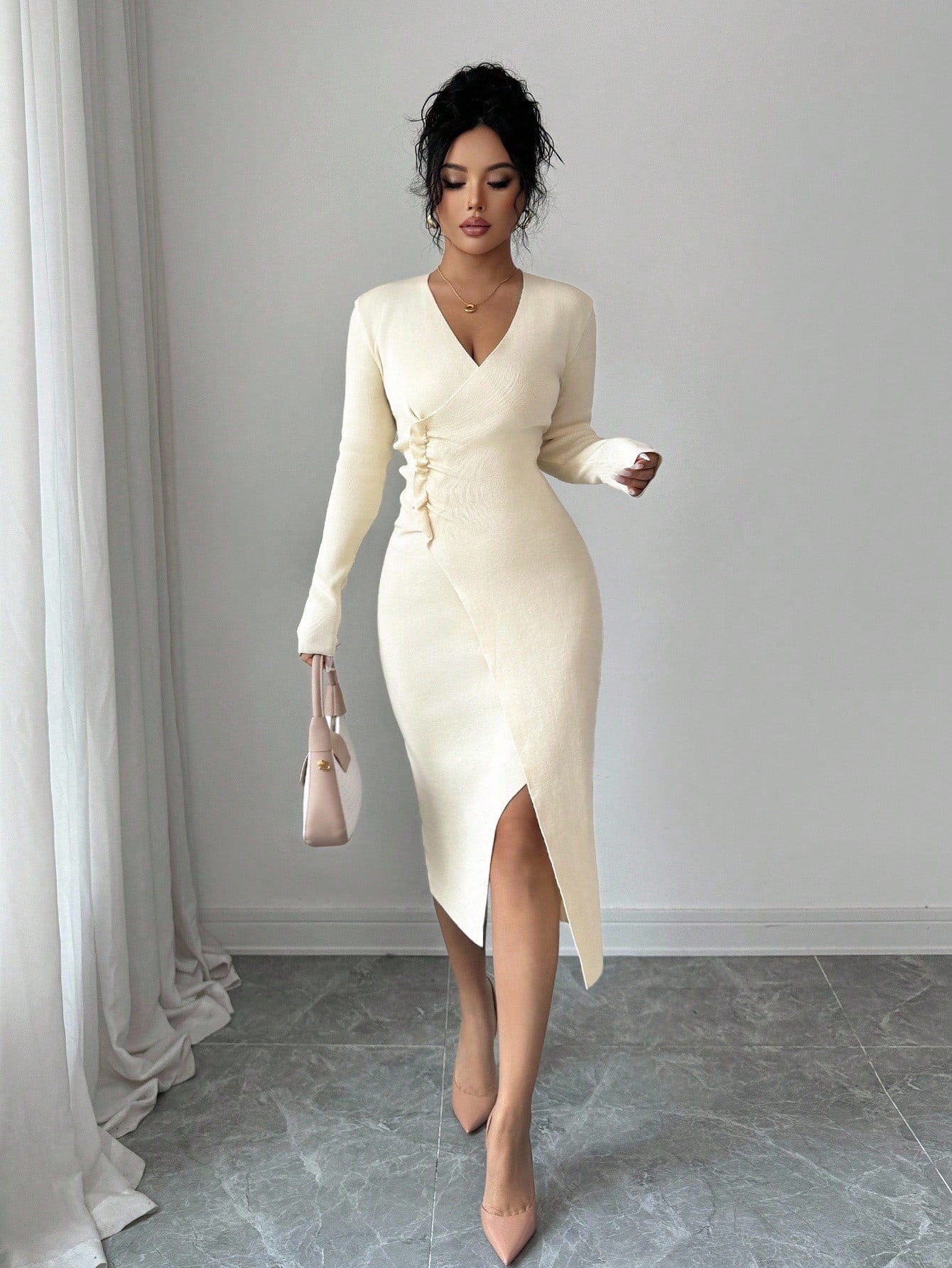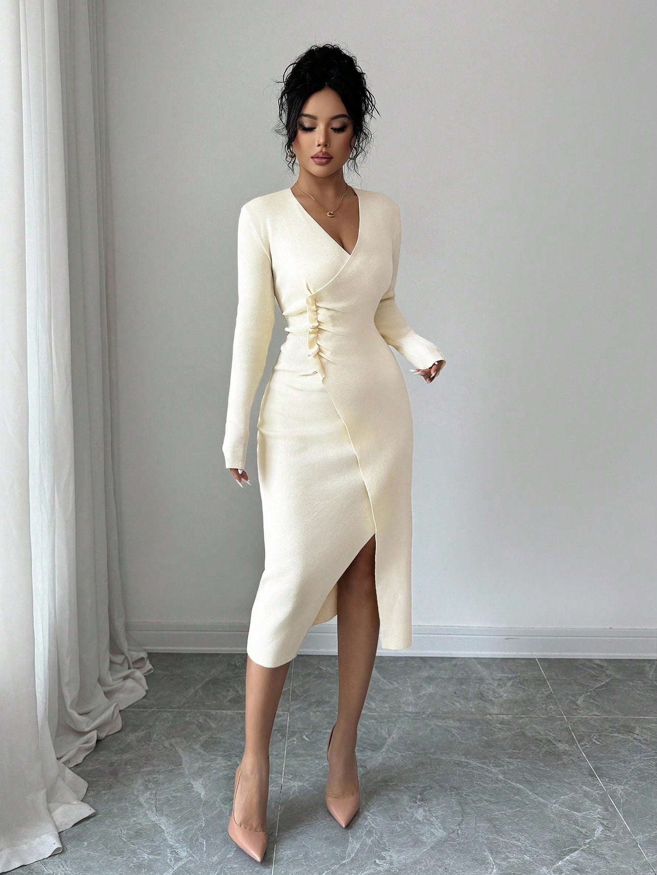 Abito maglione elegante da donna a maniche lunghe, con scollo a V, arricciatura laterale e spacco alto, aderente