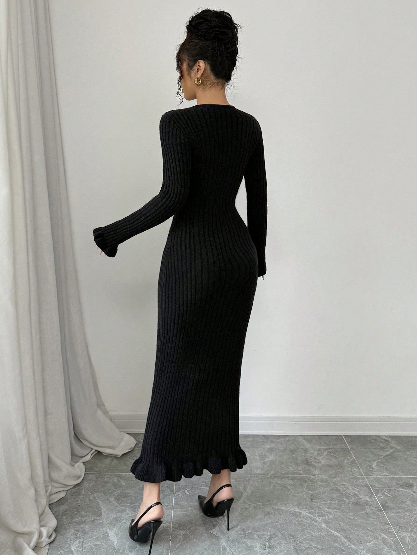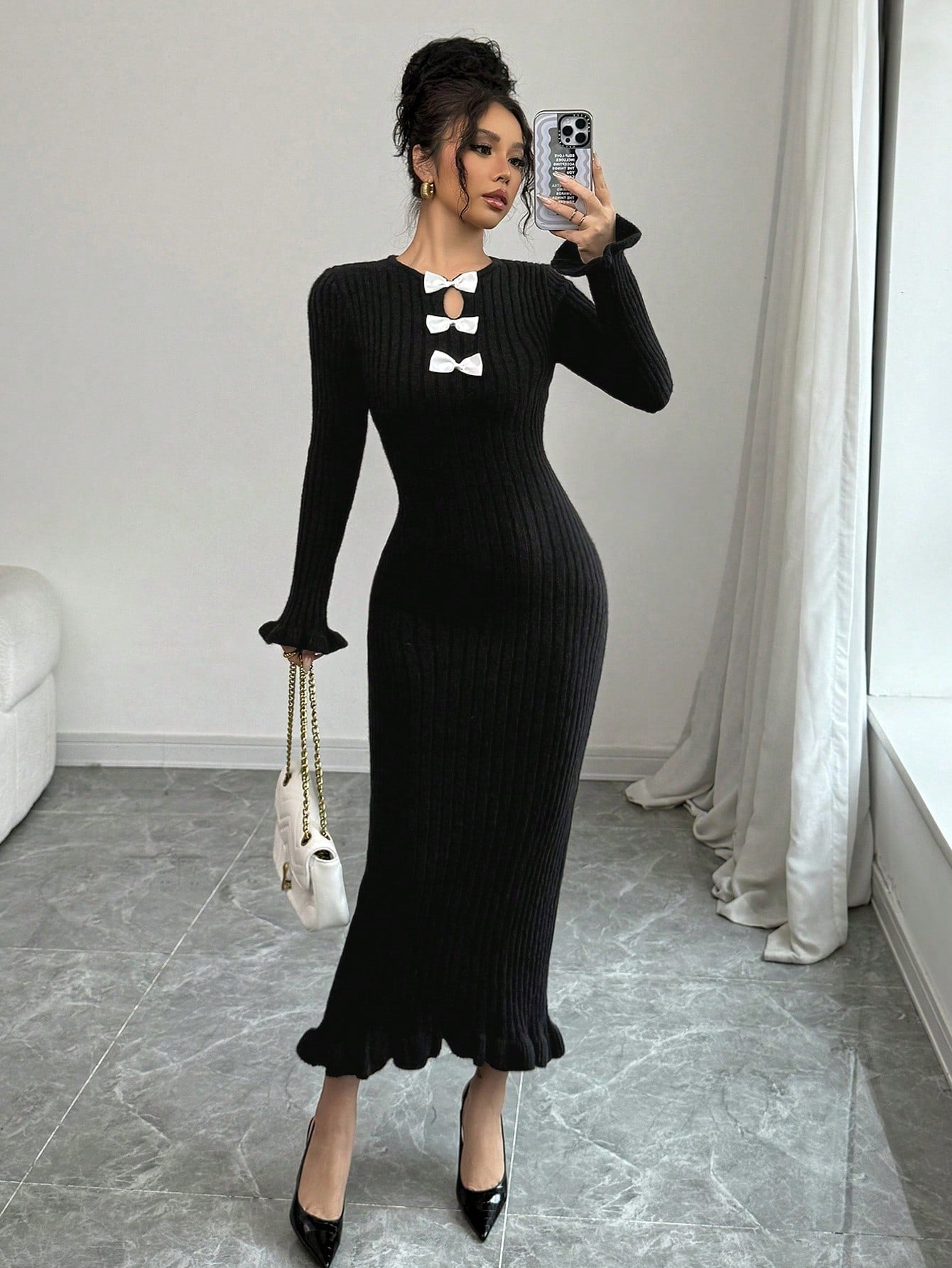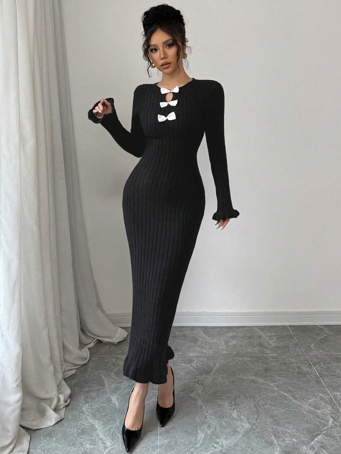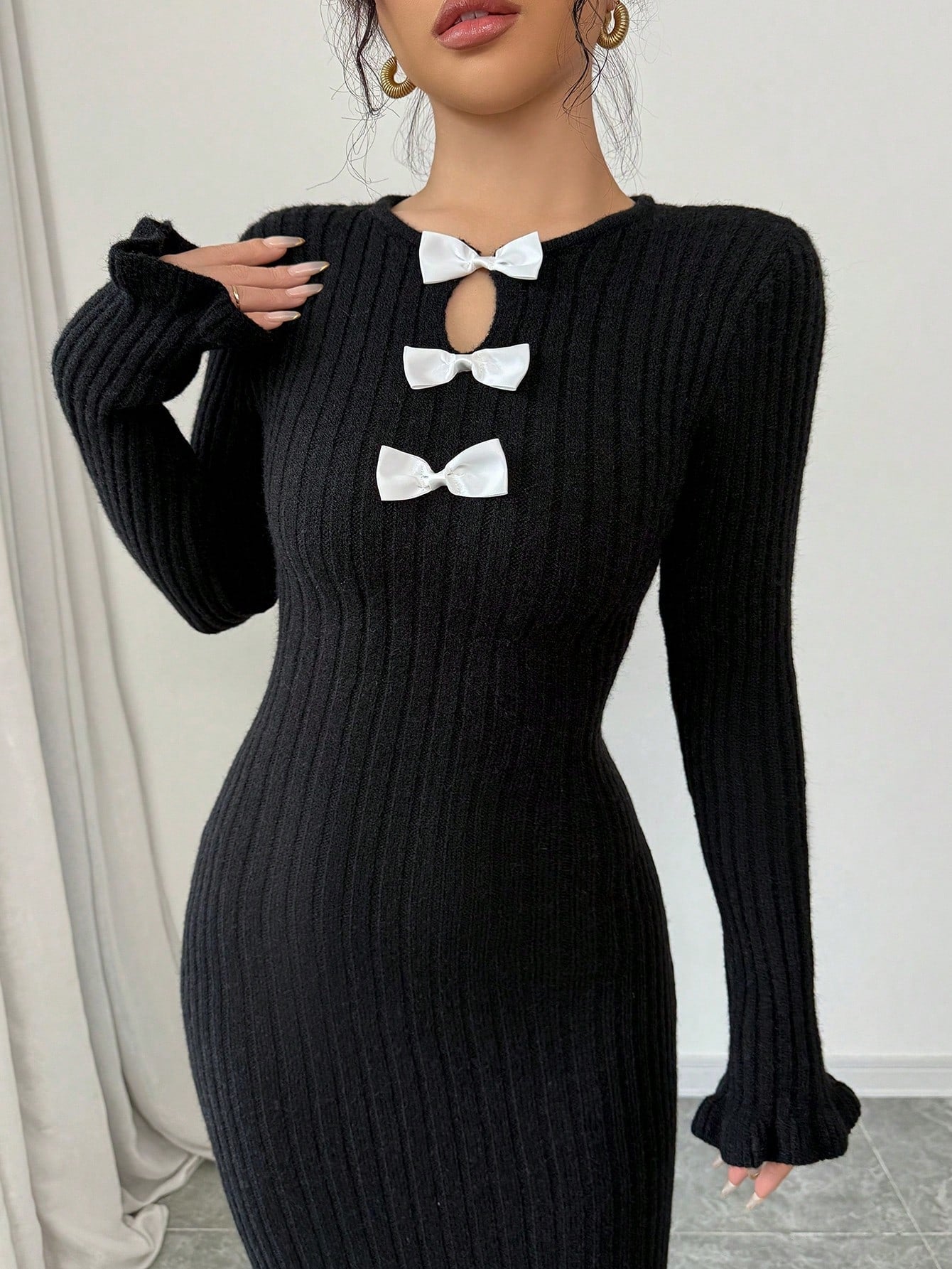 Abito maglione lavorato a maglia con scollo a ciambella, maniche lunghe ed elegante fiocco decorativo