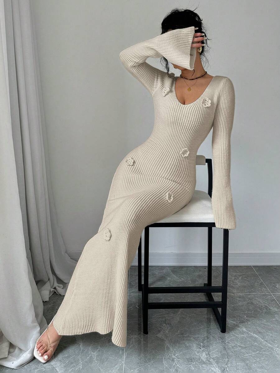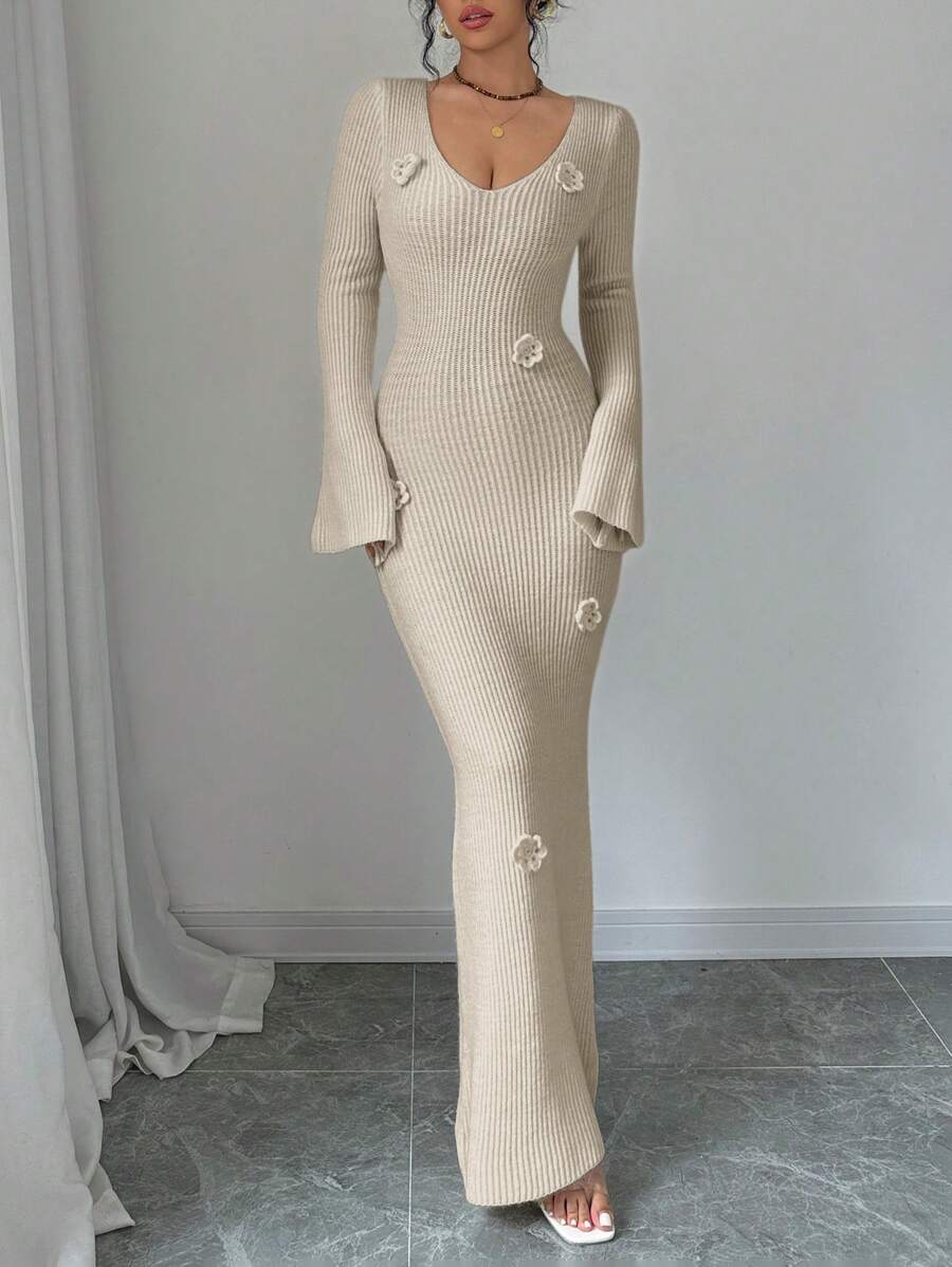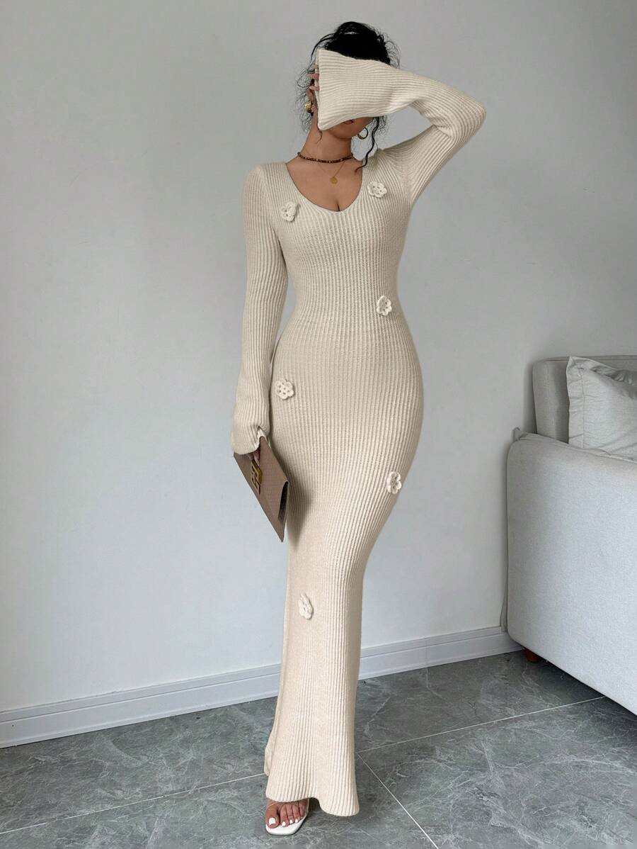 Abito maglione lungo a maniche lunghe con decorazione floreale 3D per donne