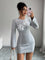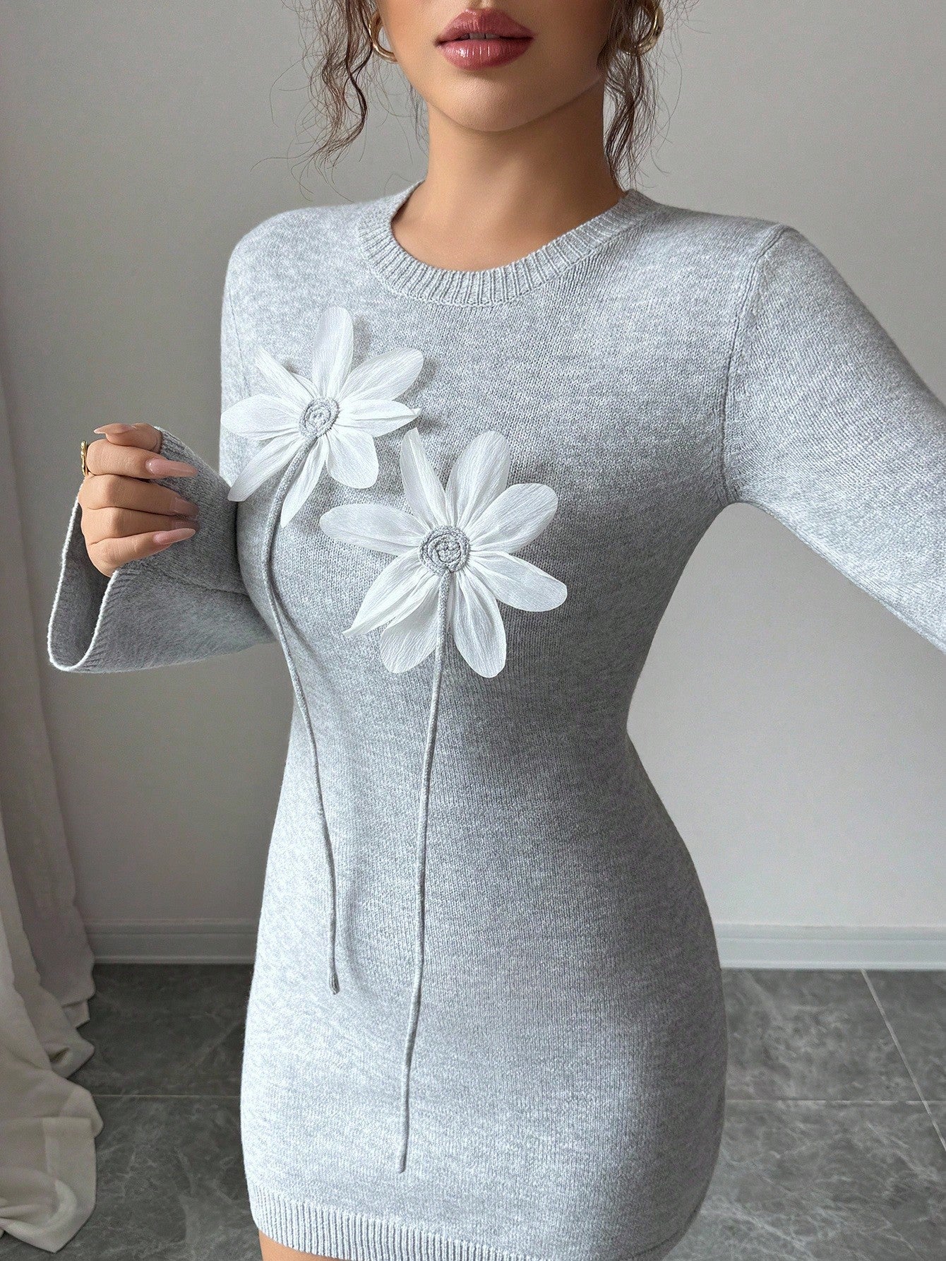 Elegante abito a maglia aderente con maniche a campana grigio ricamato