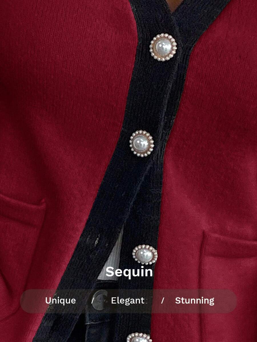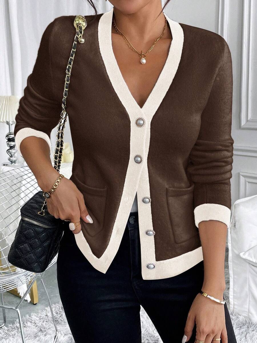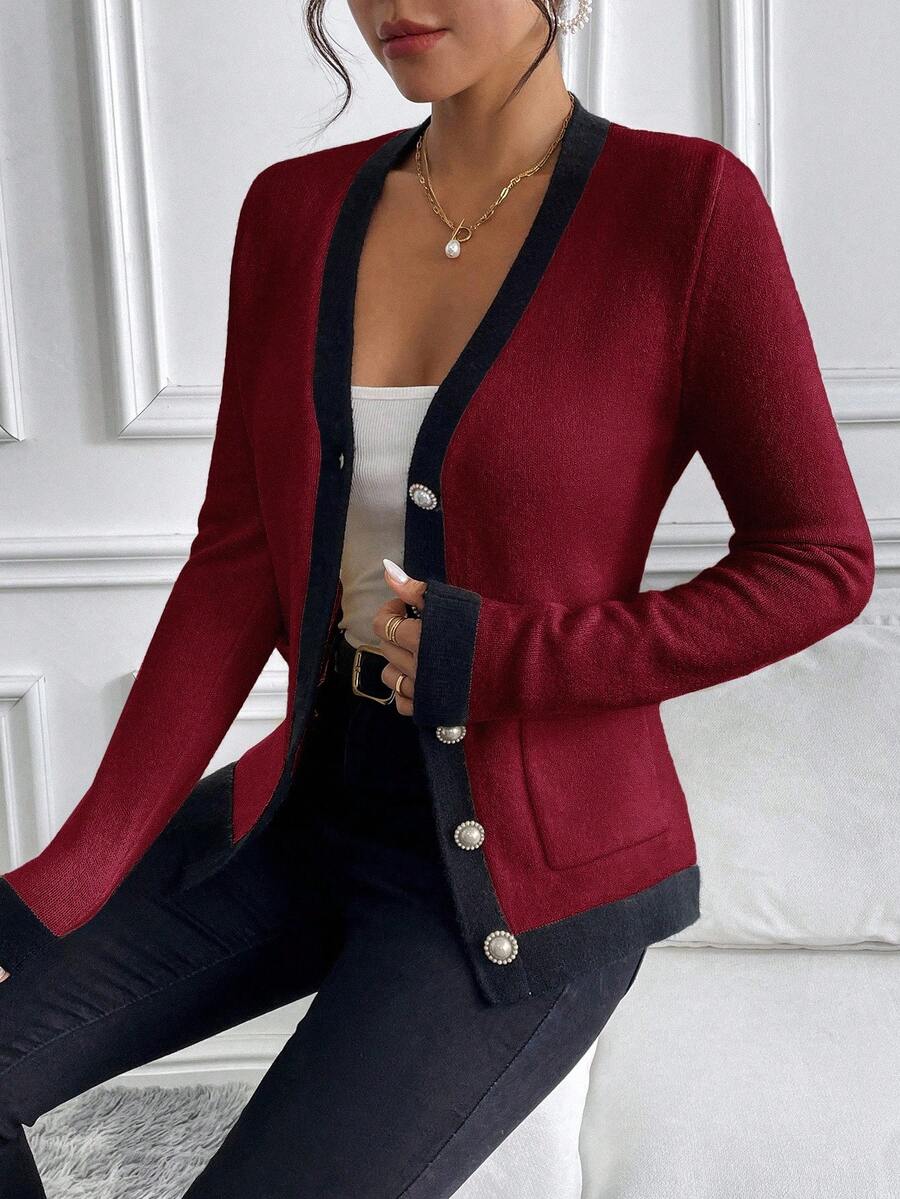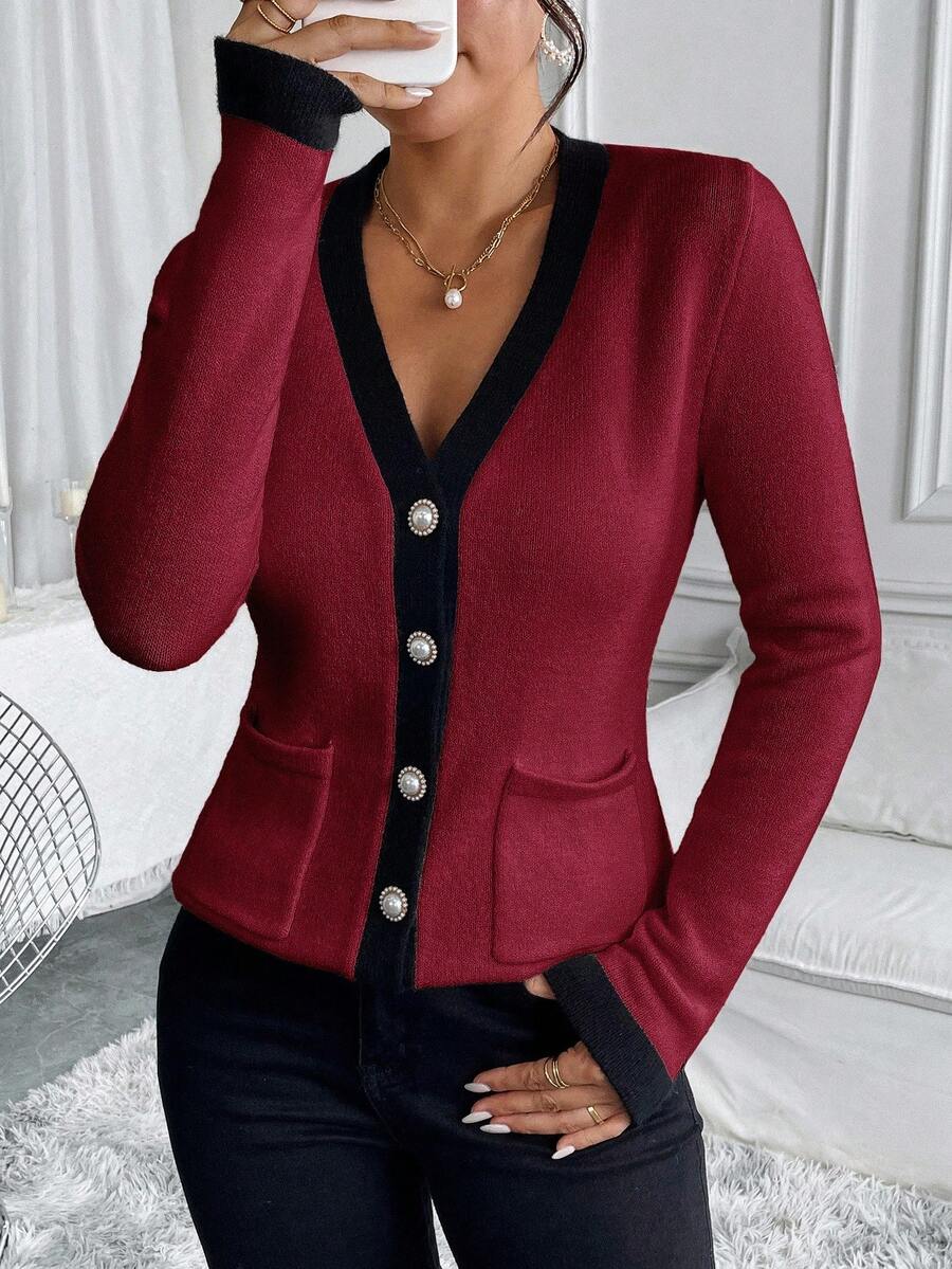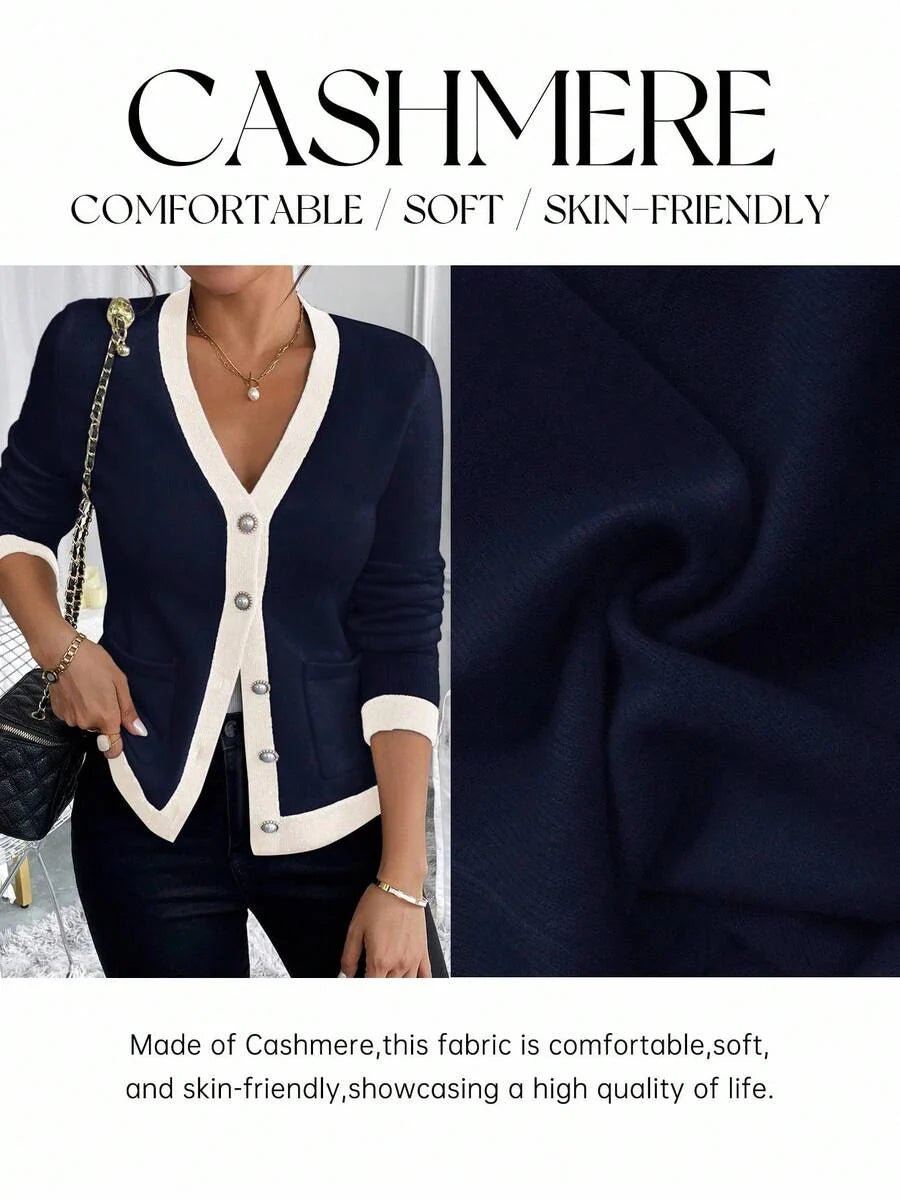 Cardigan elegante donna invernale con blocchi di colore decorazione in finta perla sui bottoni, scollo a V e vestibilitˆ aderente