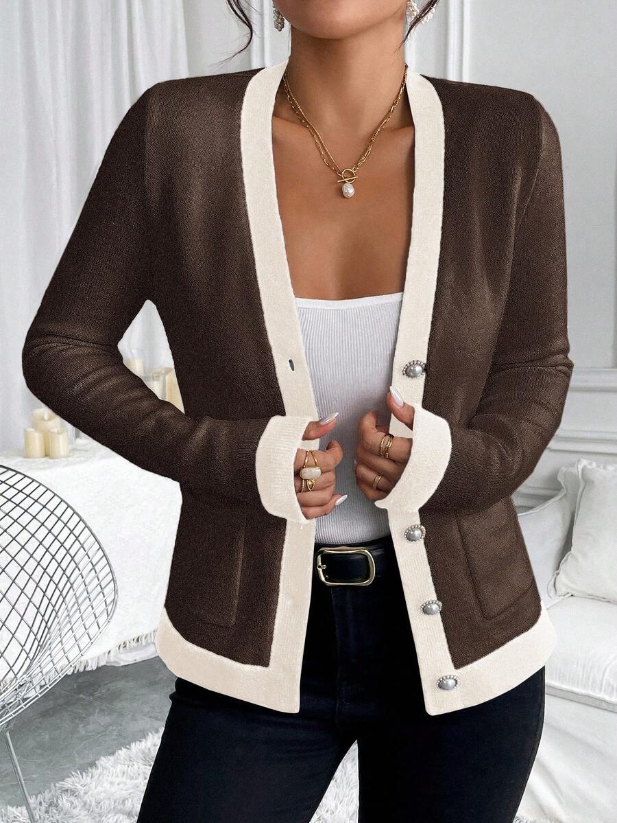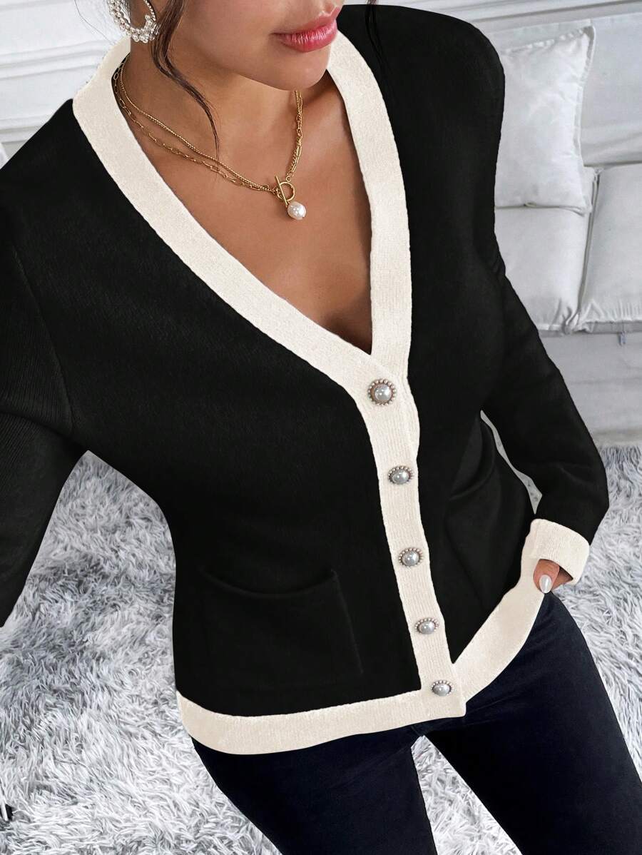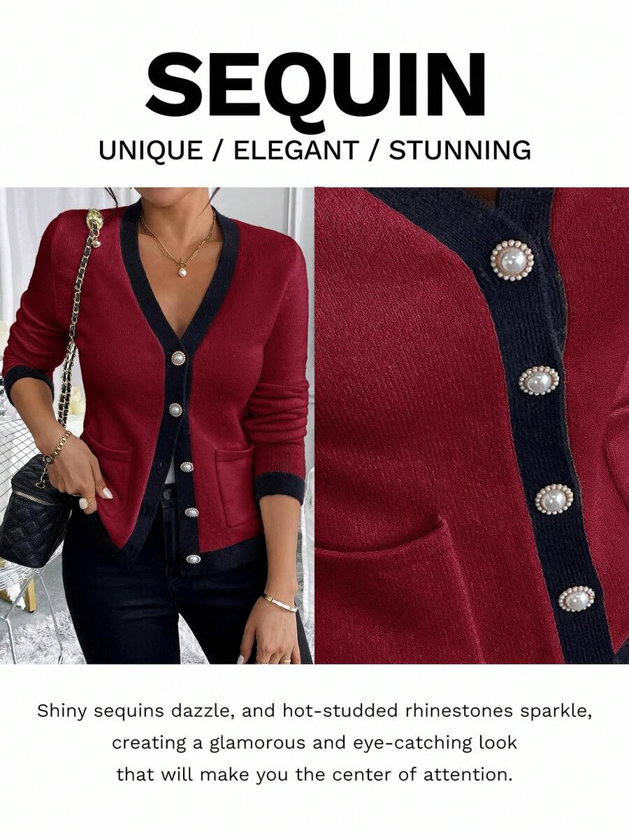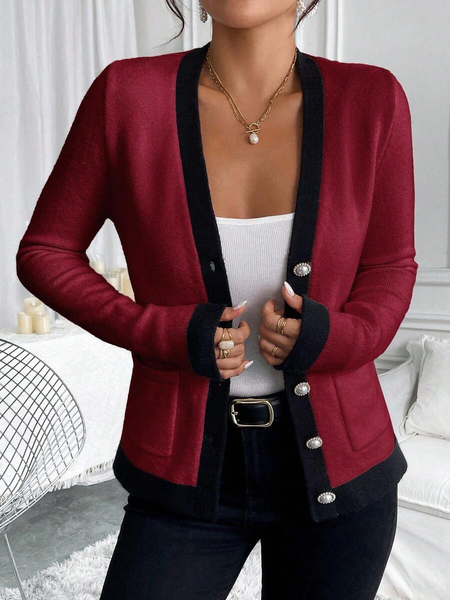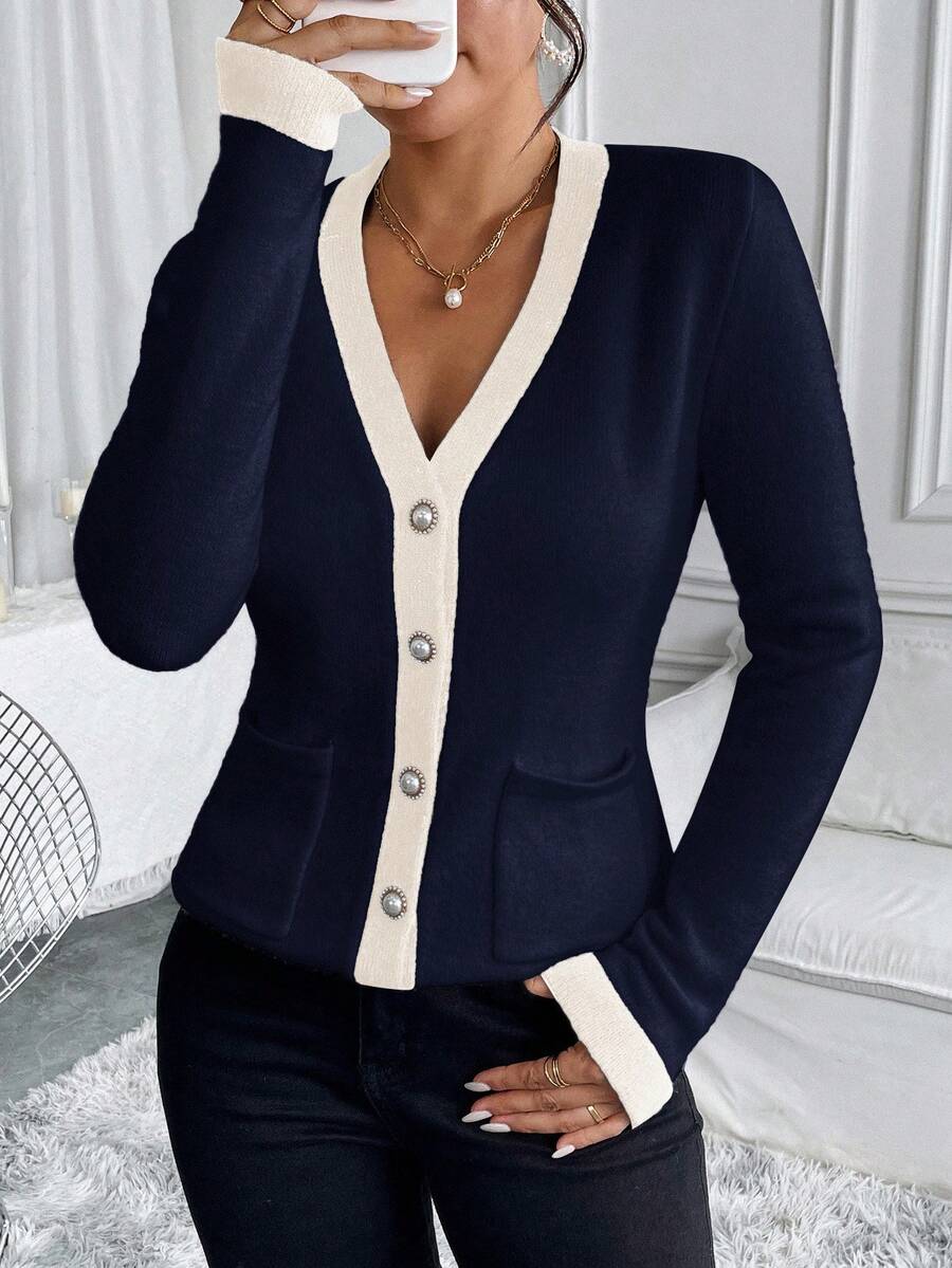 Cardigan elegante donna invernale con blocchi di colore decorazione in finta perla sui bottoni, scollo a V e vestibilitˆ aderente