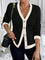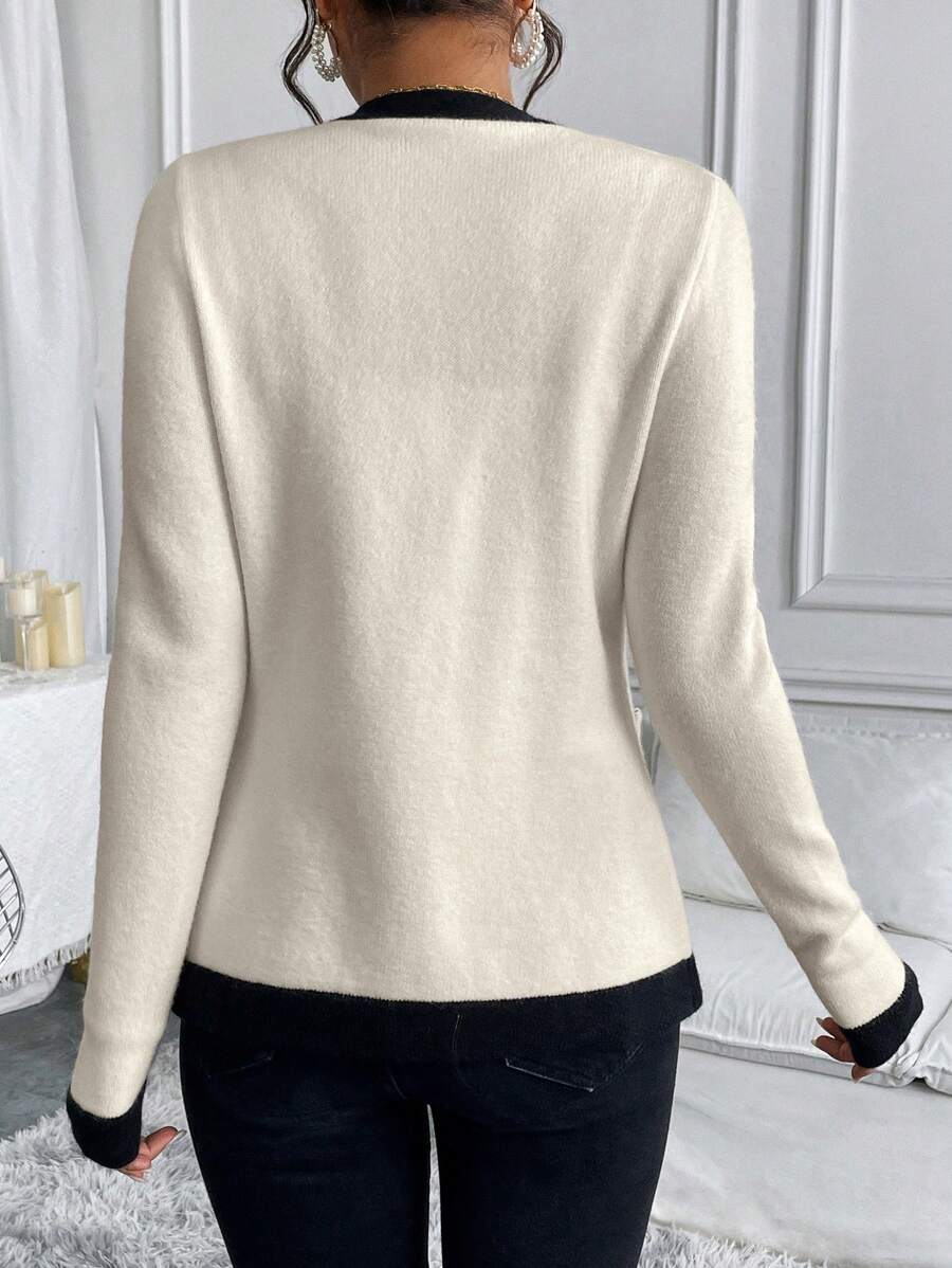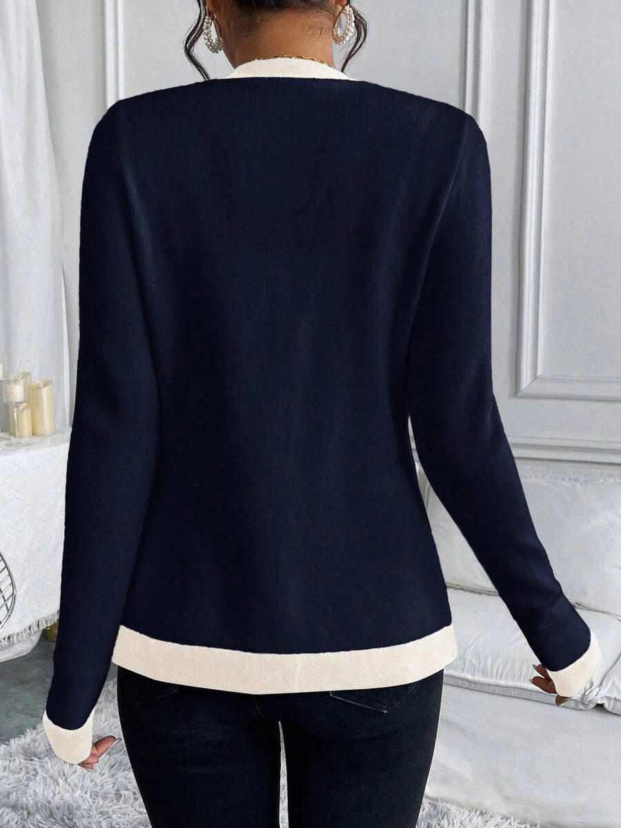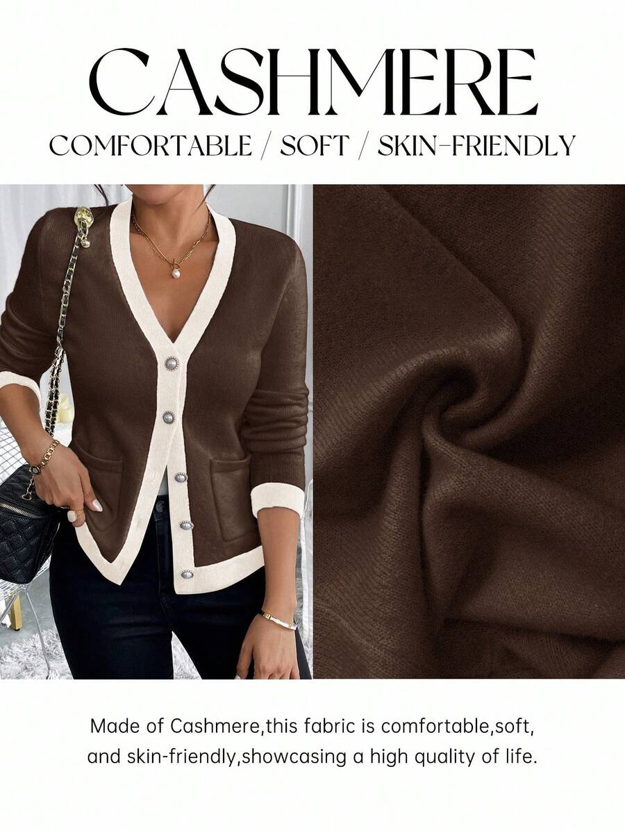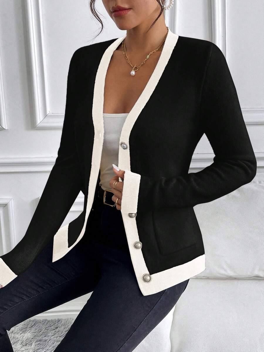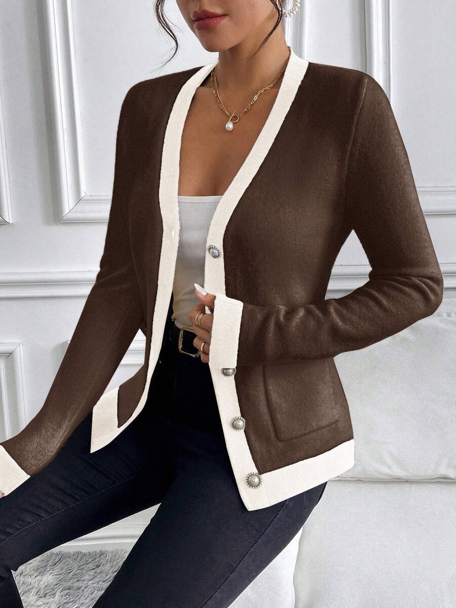 Cardigan elegante donna invernale con blocchi di colore decorazione in finta perla sui bottoni, scollo a V e vestibilitˆ aderente