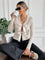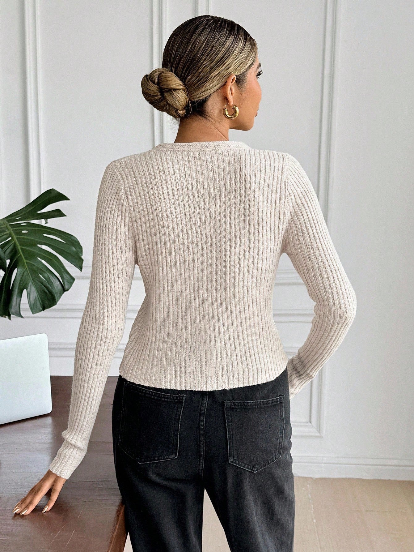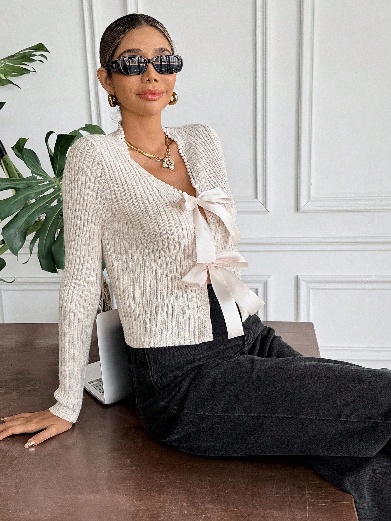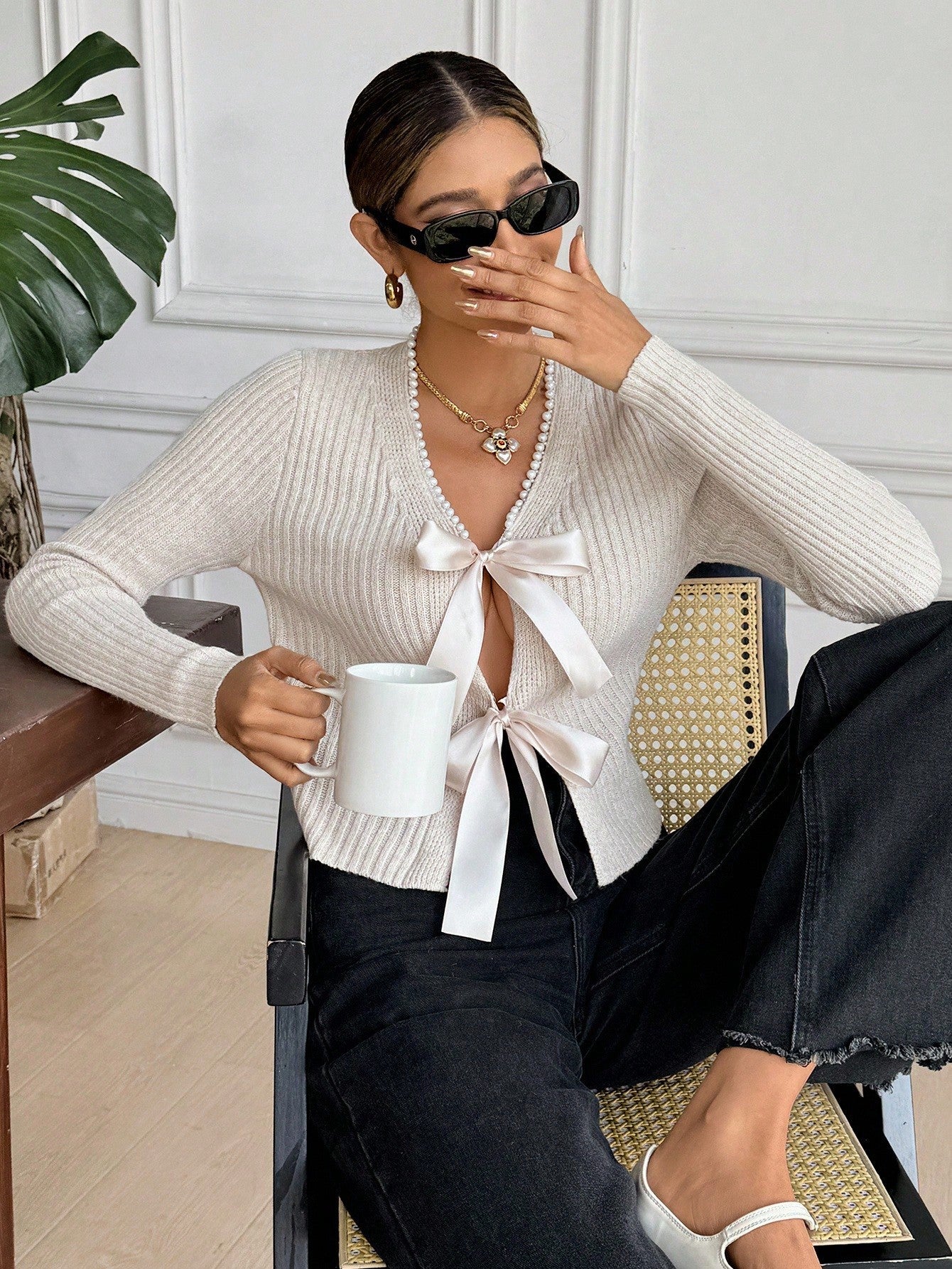 Cardigan elegante in maglia a coste con maniche lunghe e decorazione a fiocco
