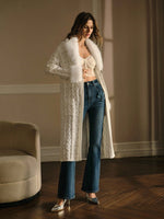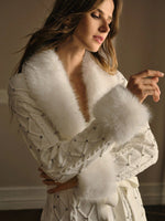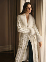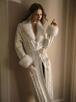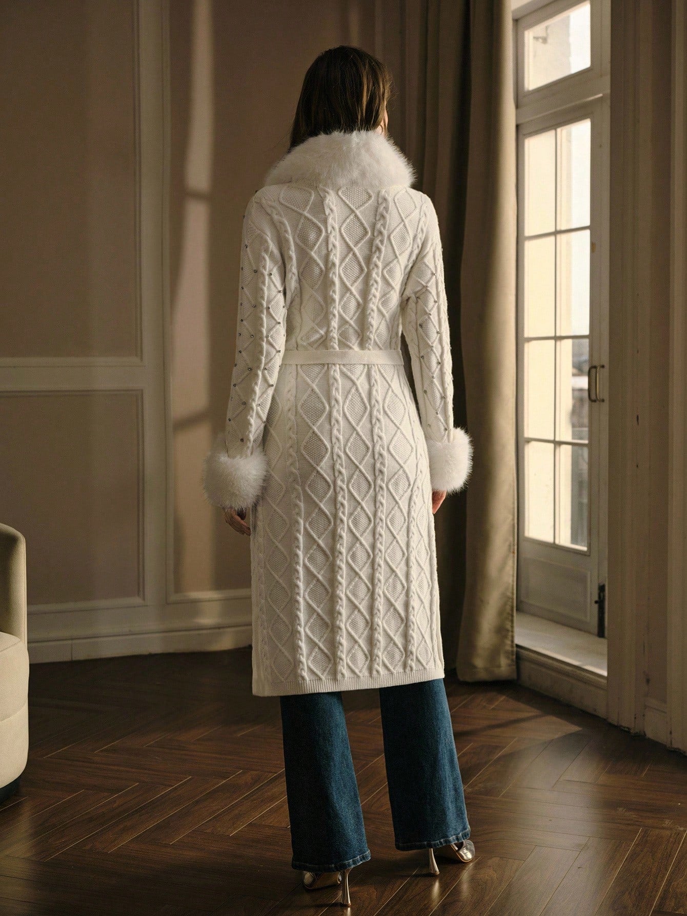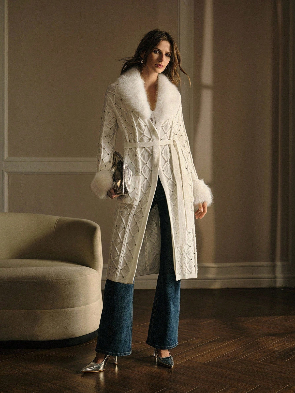 Cardigan lavorato a maglia con cintura, colletto in pelliccia e strass