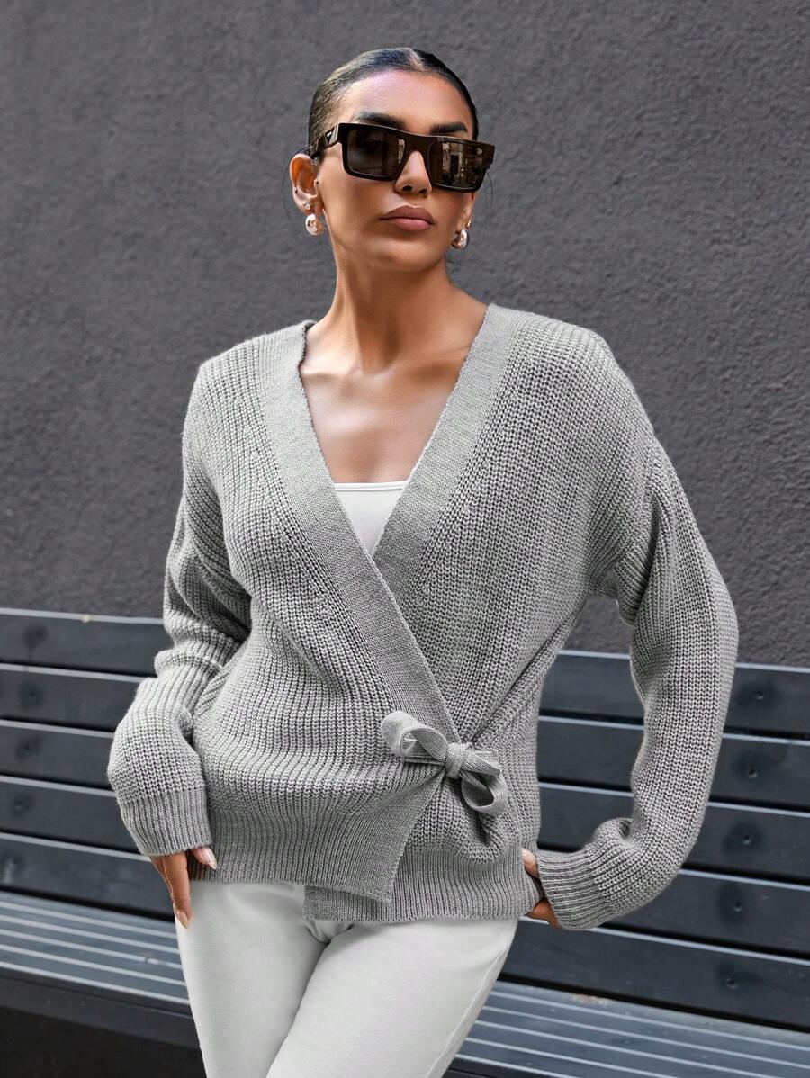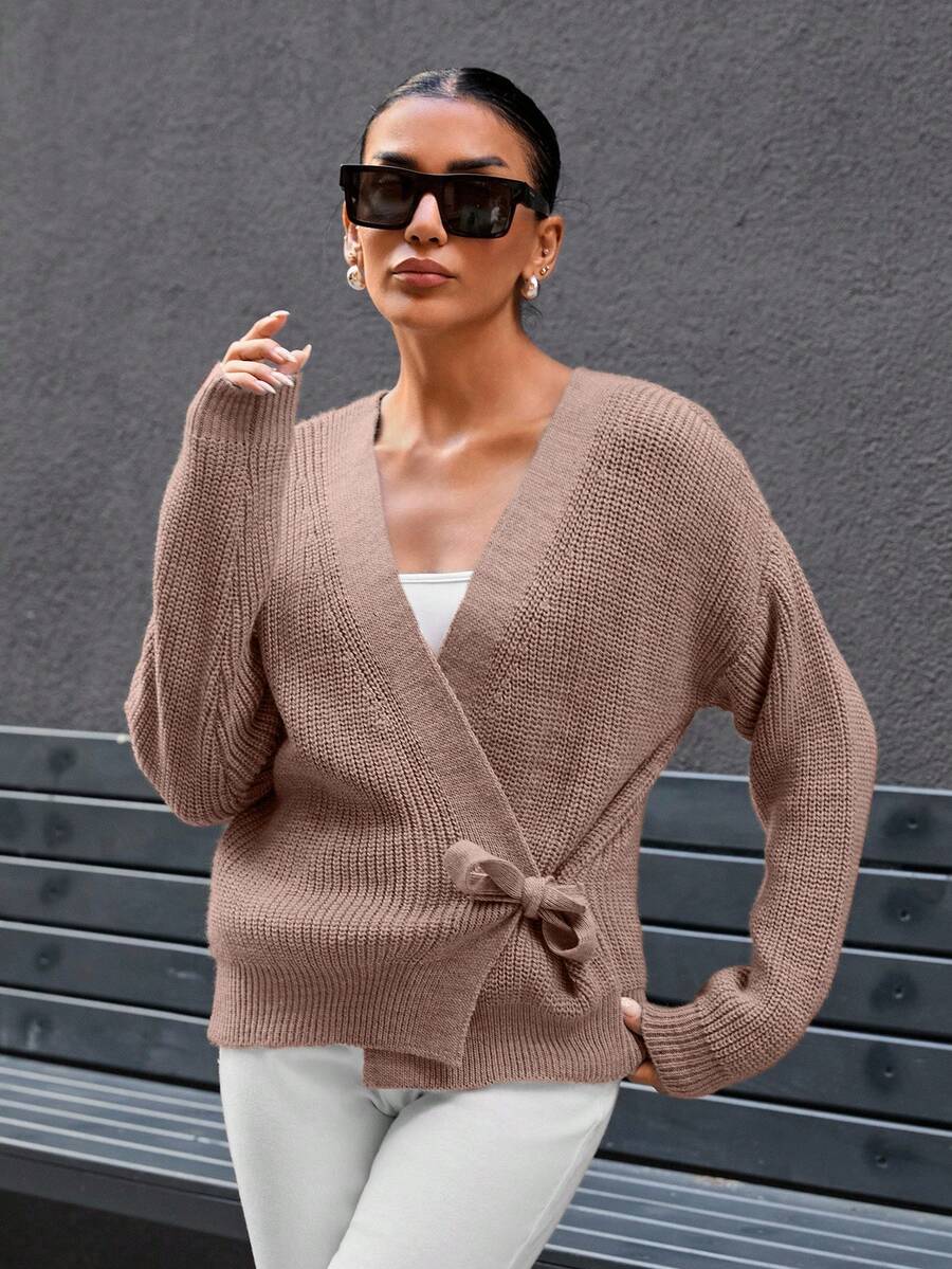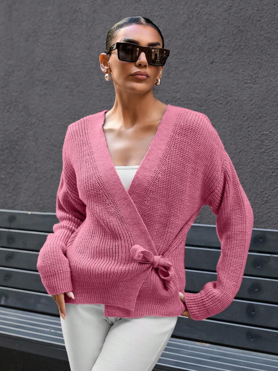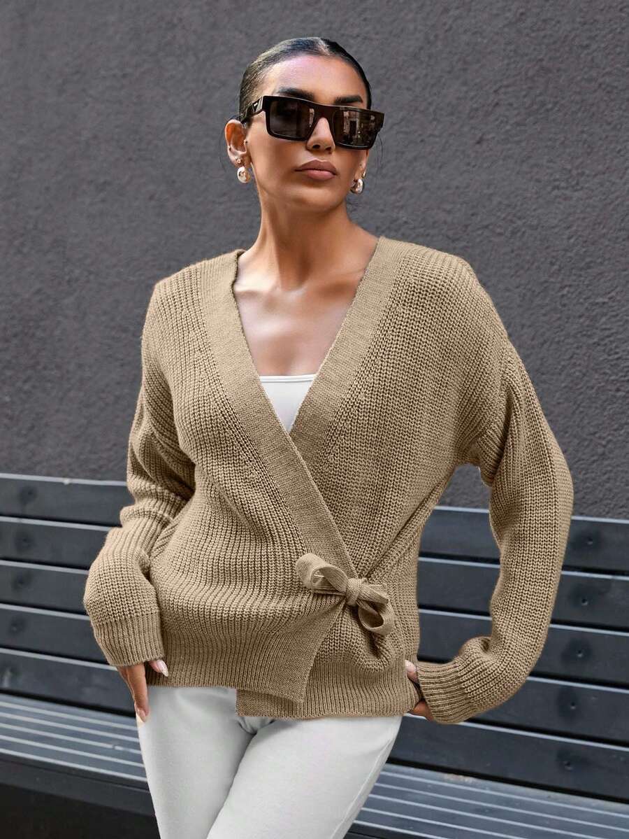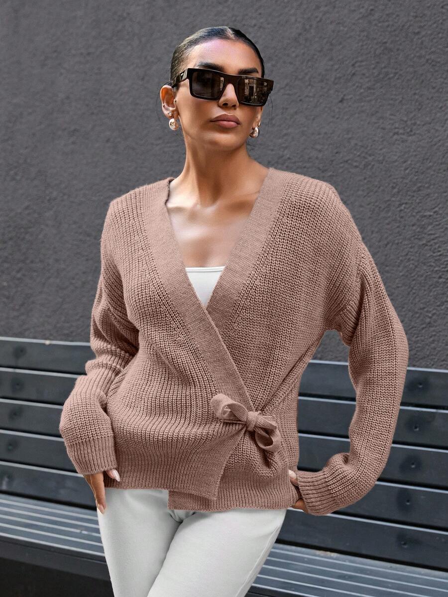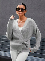 Cardigan oversize da donna con scollo a V, dettaglio fiocco e maniche a palloncino