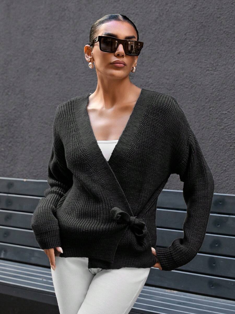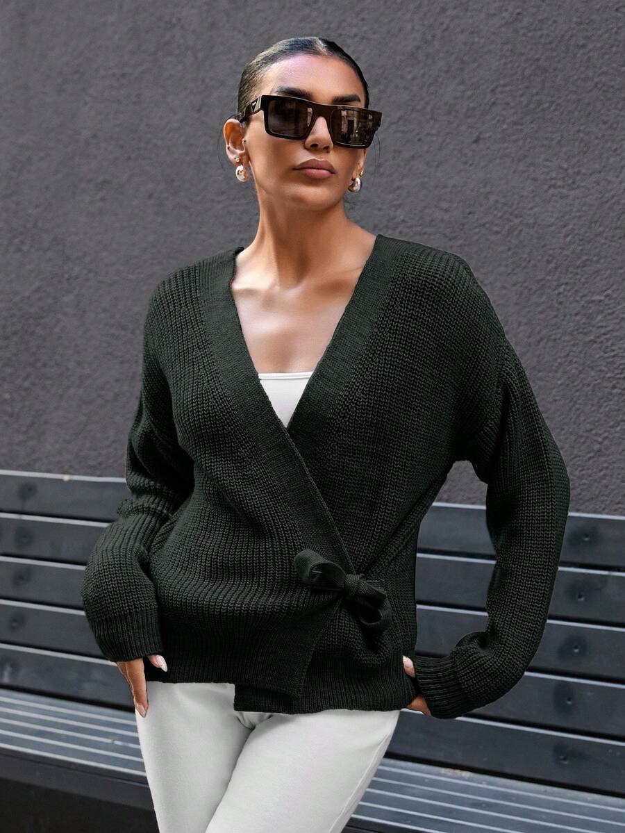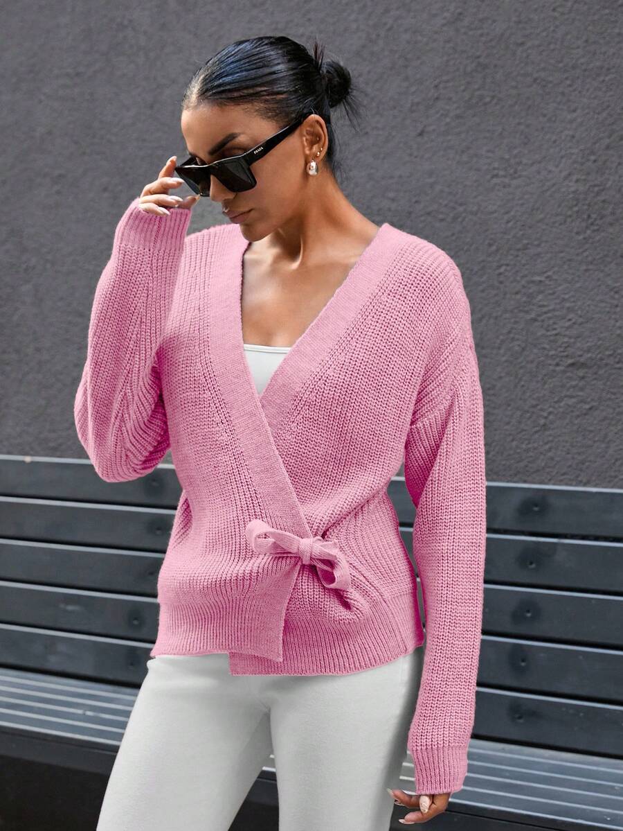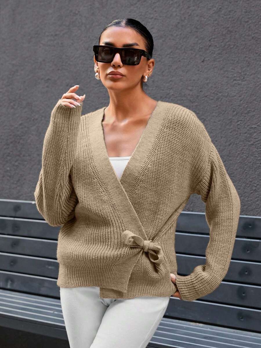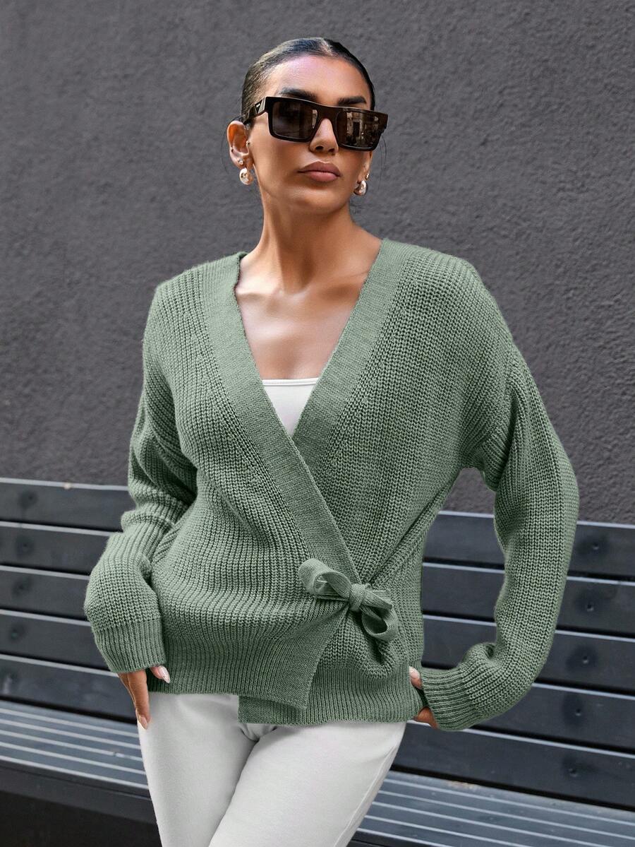 Cardigan oversize da donna con scollo a V, dettaglio fiocco e maniche a palloncino
