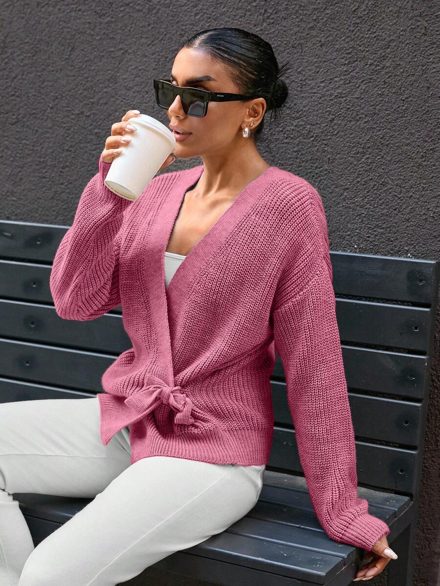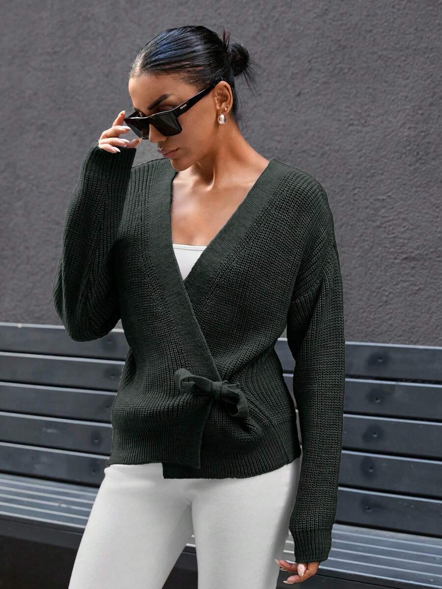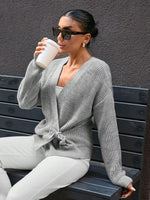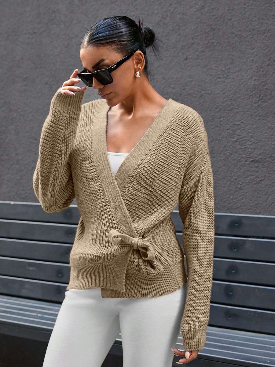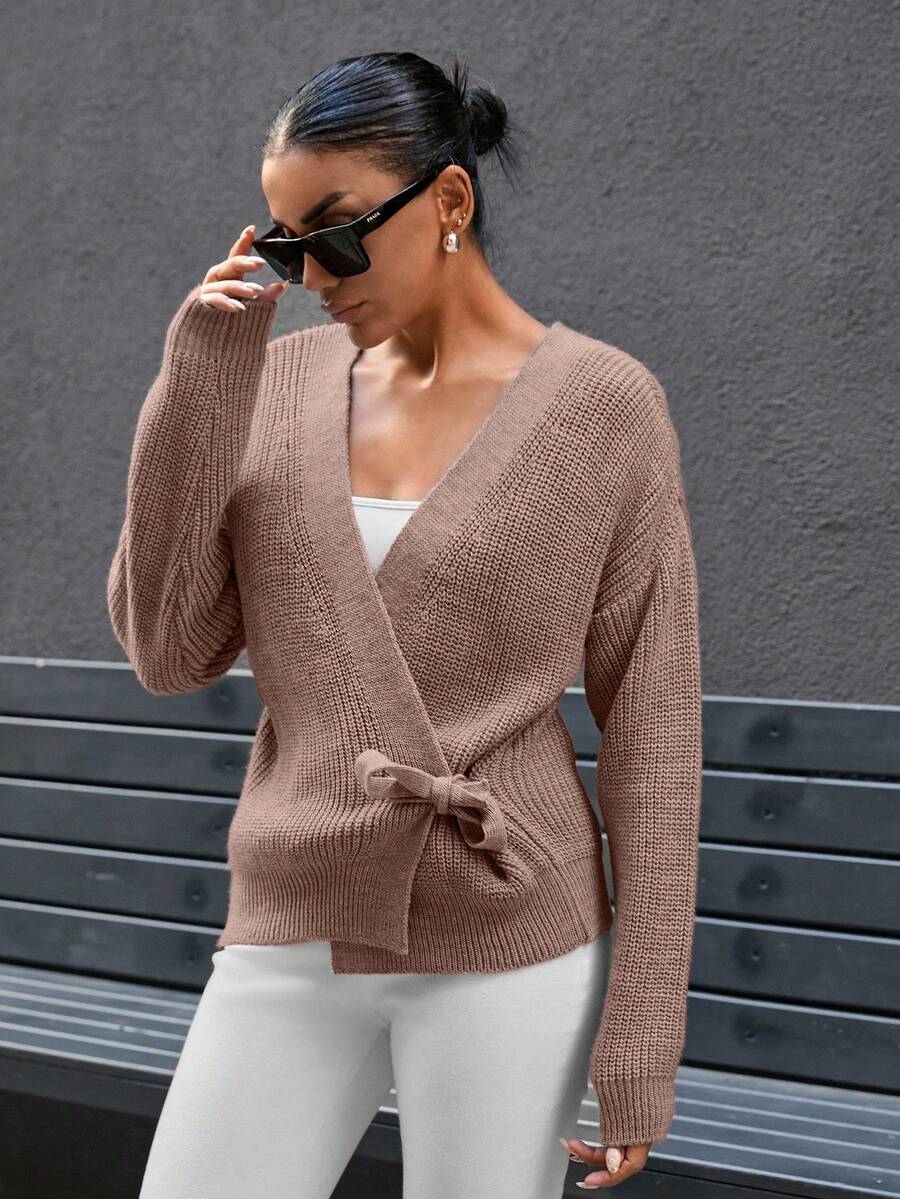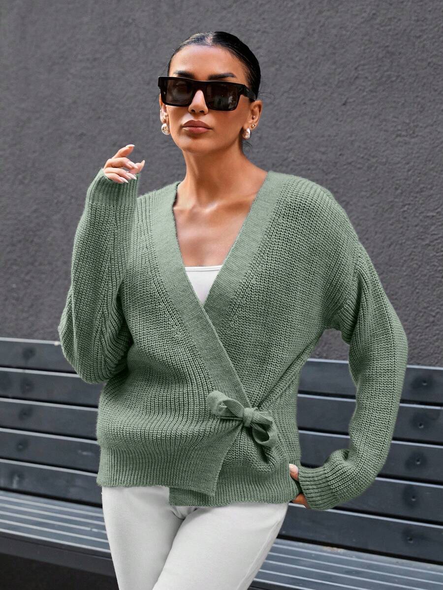 Cardigan oversize da donna con scollo a V, dettaglio fiocco e maniche a palloncino