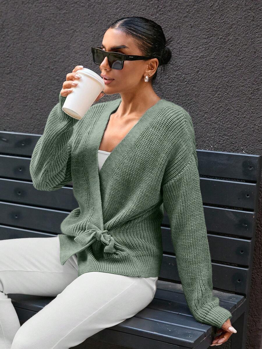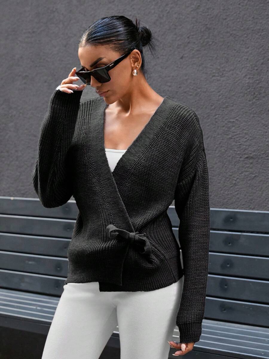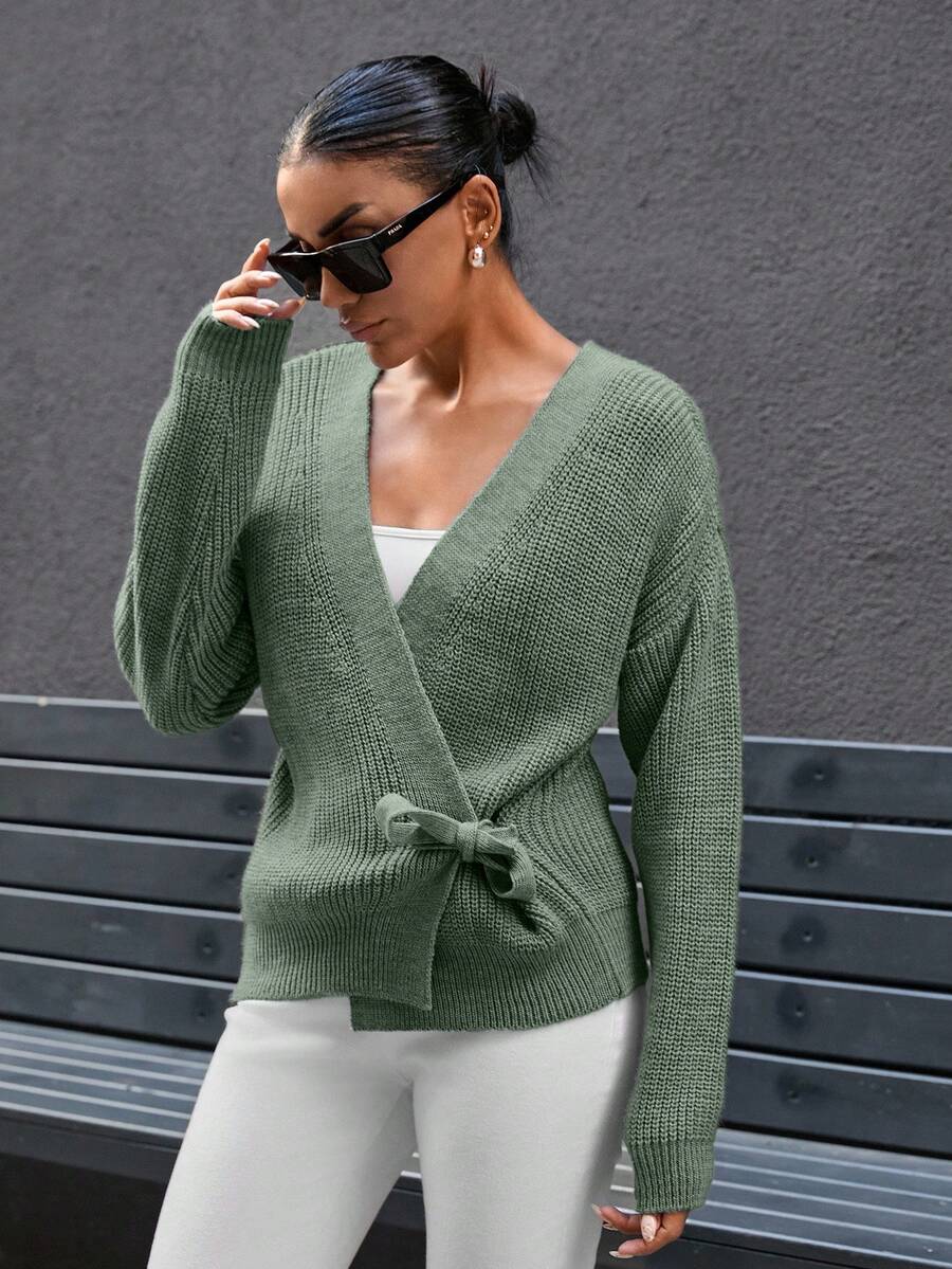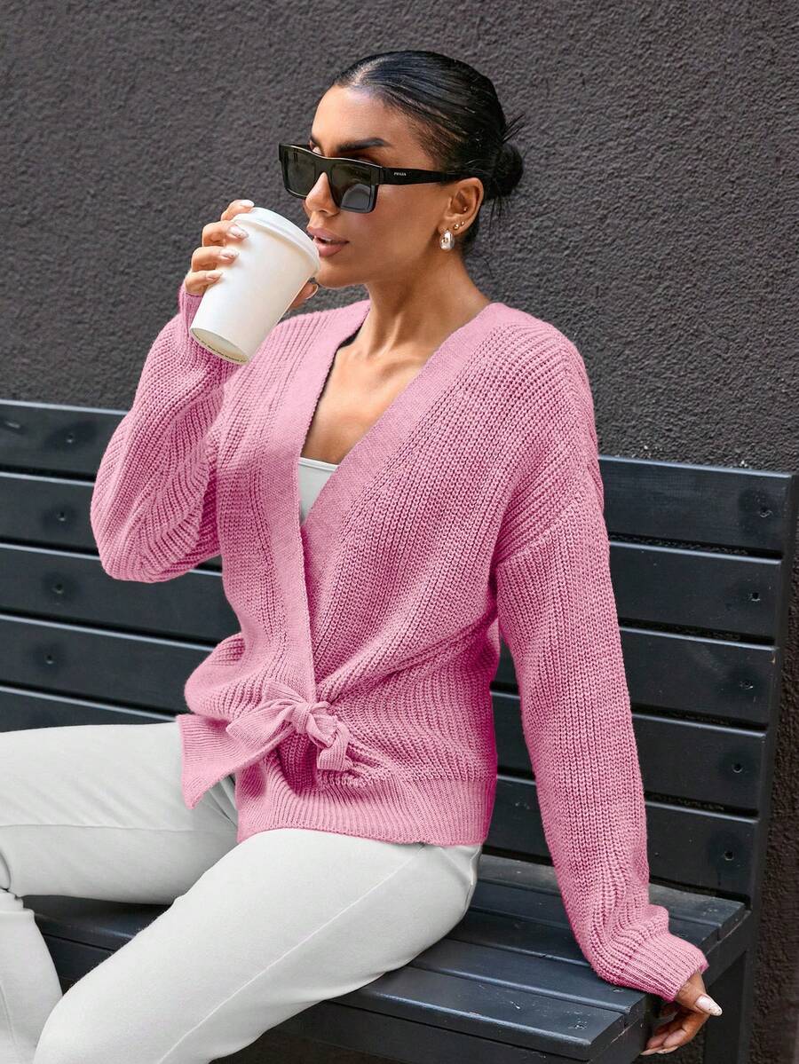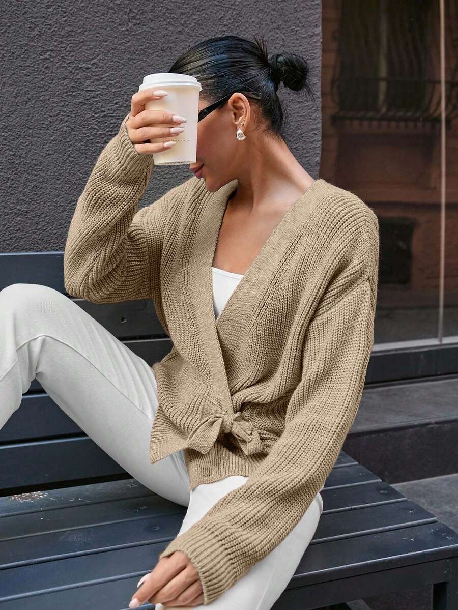 Cardigan oversize da donna con scollo a V, dettaglio fiocco e maniche a palloncino