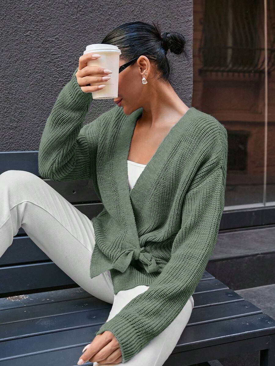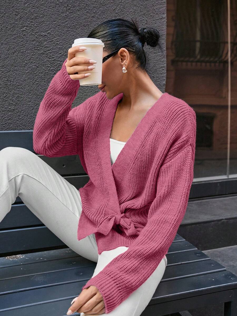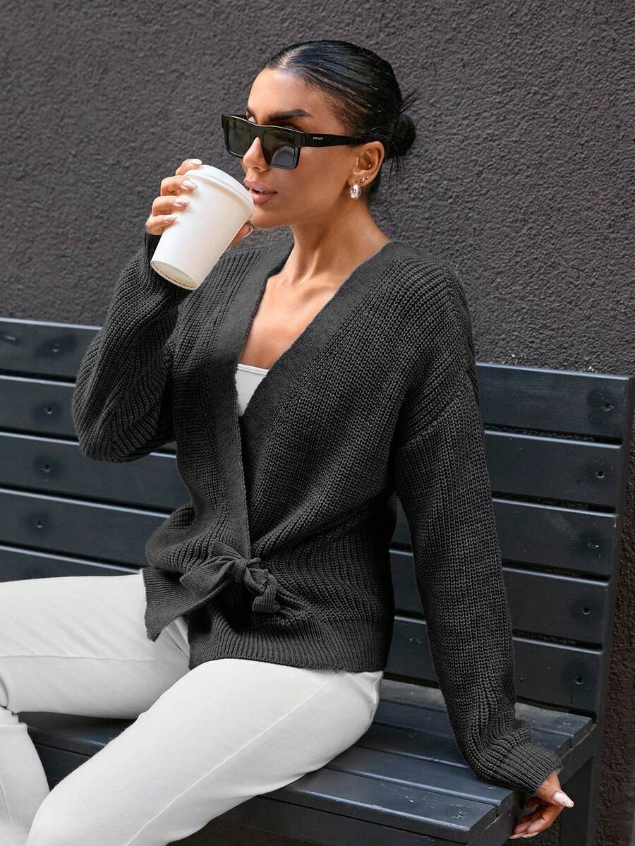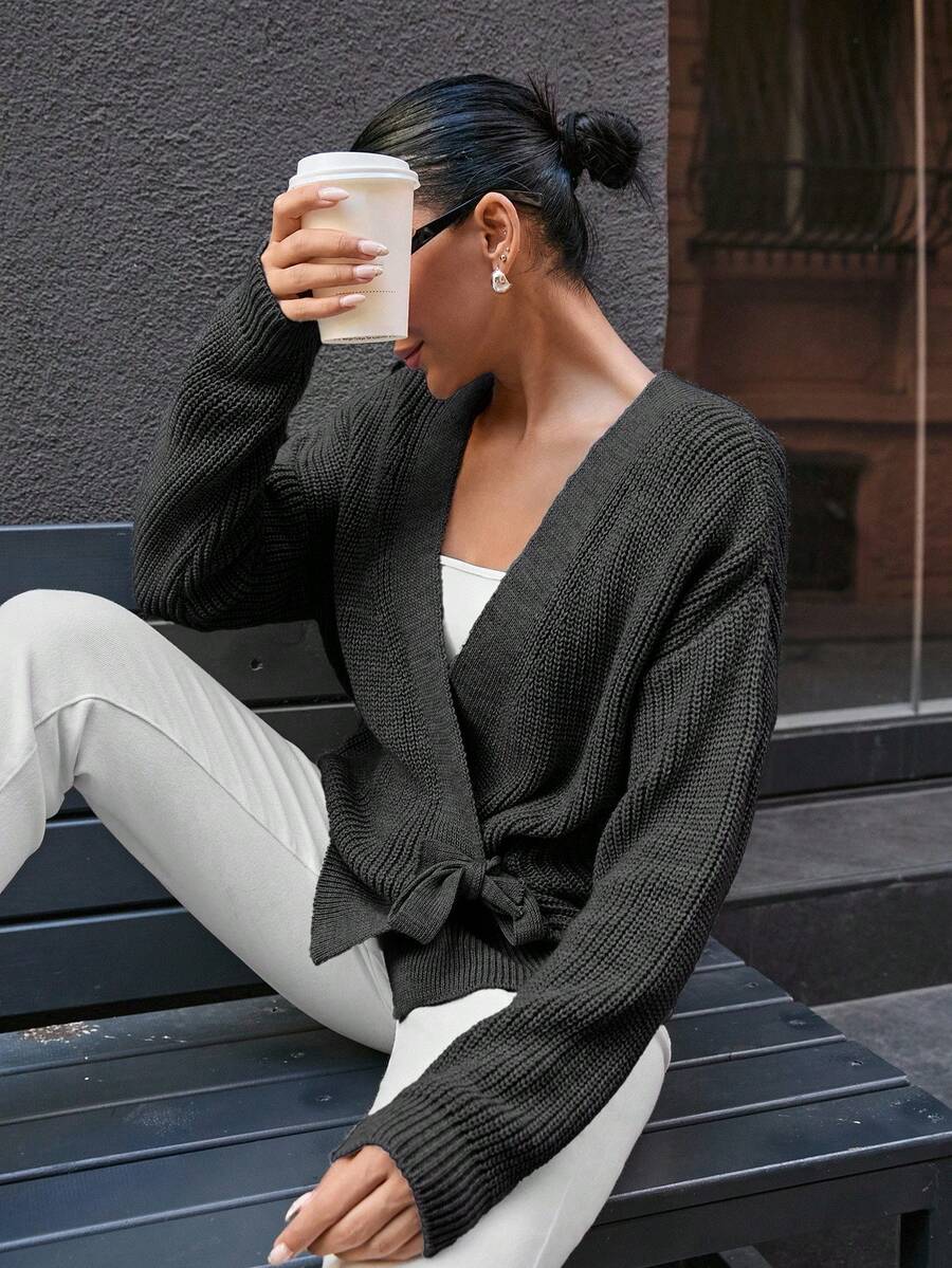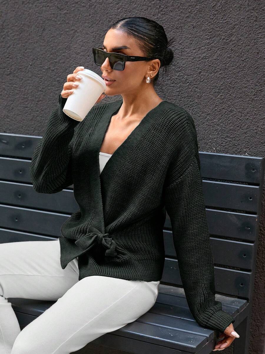 Cardigan oversize da donna con scollo a V, dettaglio fiocco e maniche a palloncino