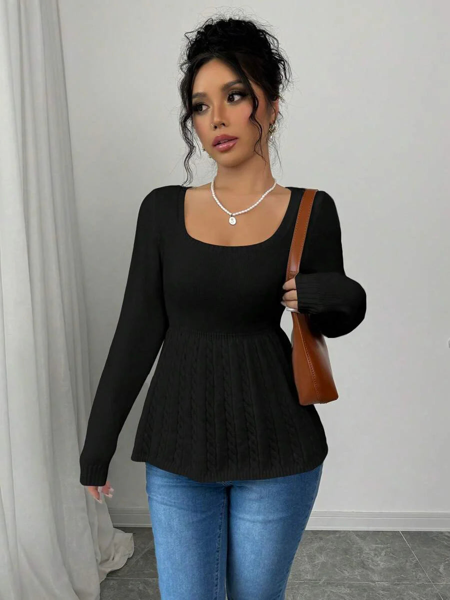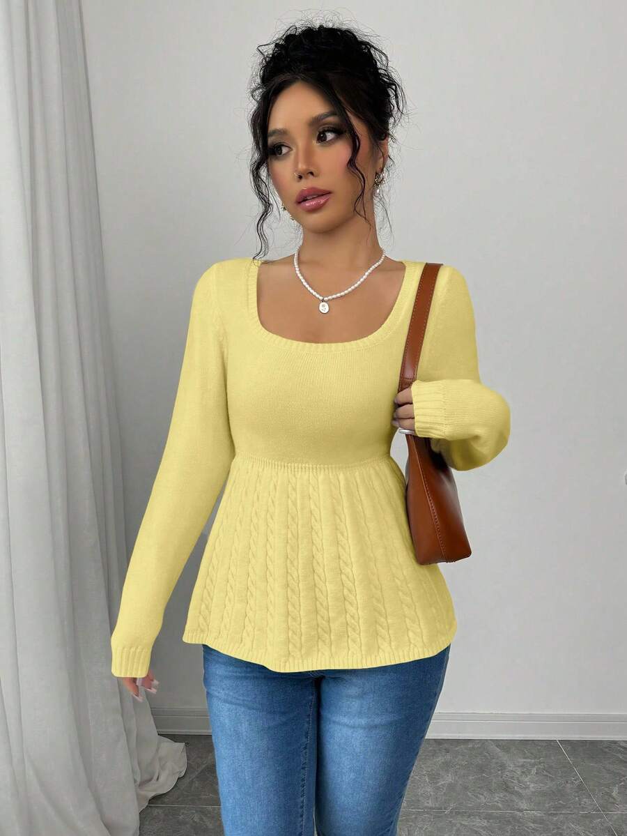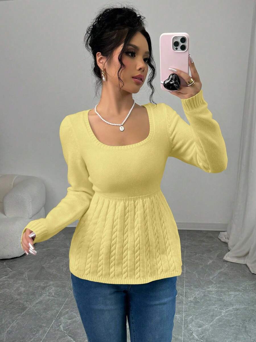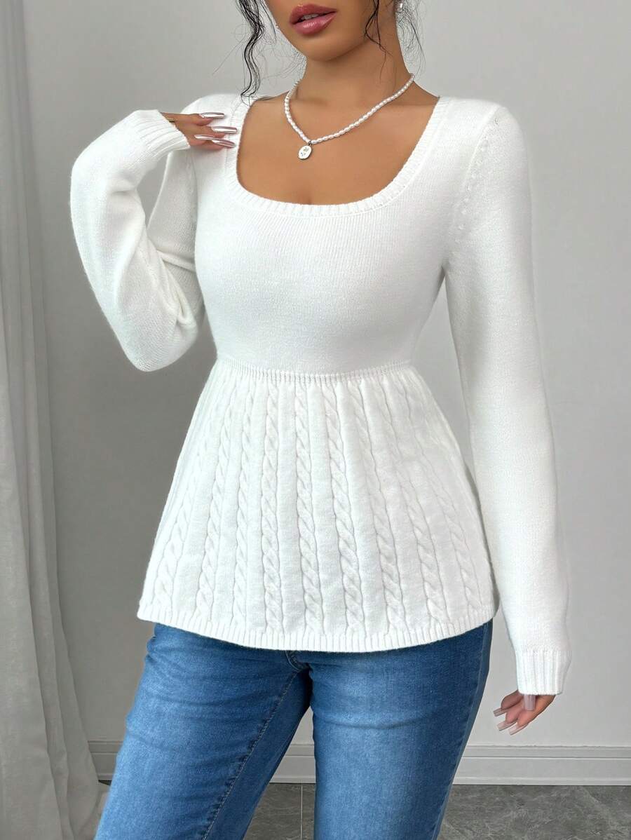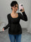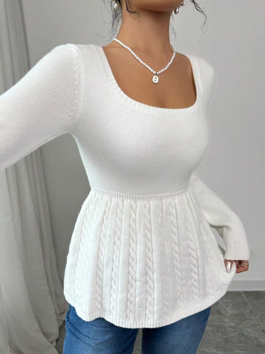 Maglietta corta bianca casual da donna con collo quadrato, maniche lunghe, colore unito
