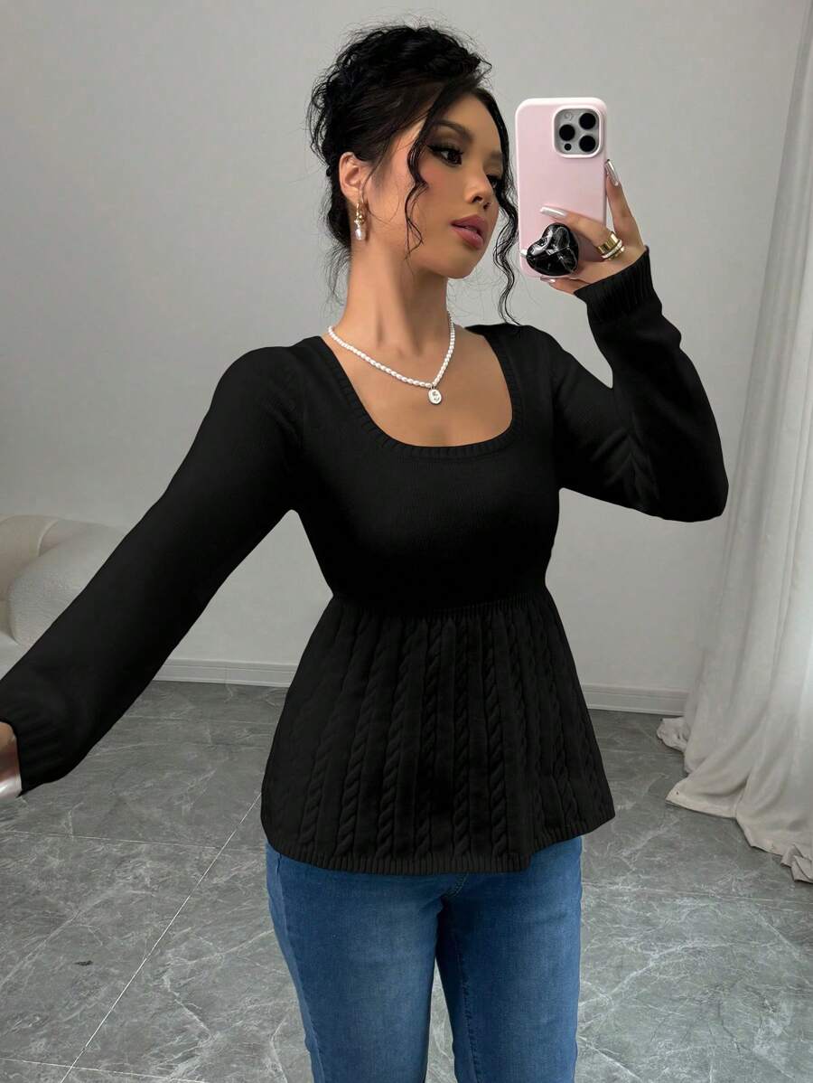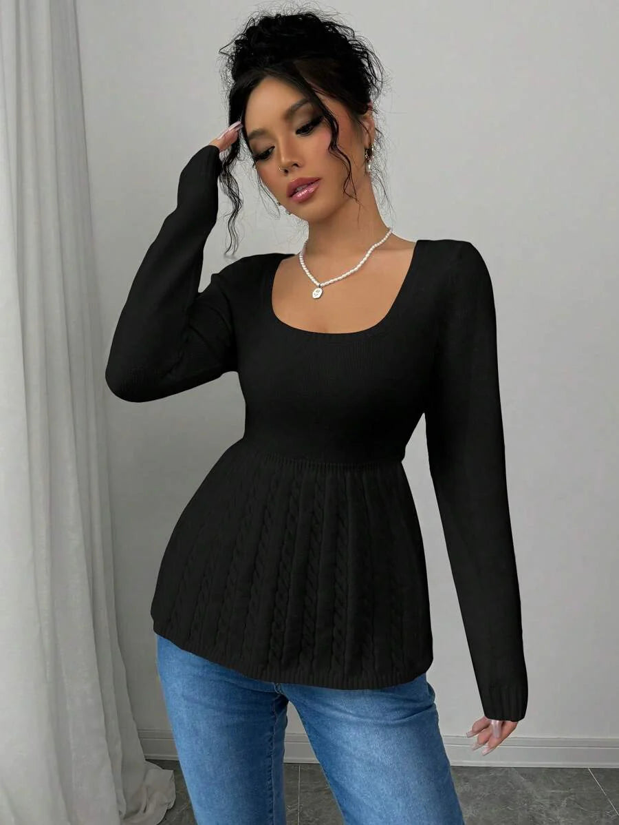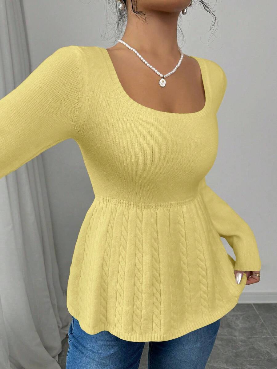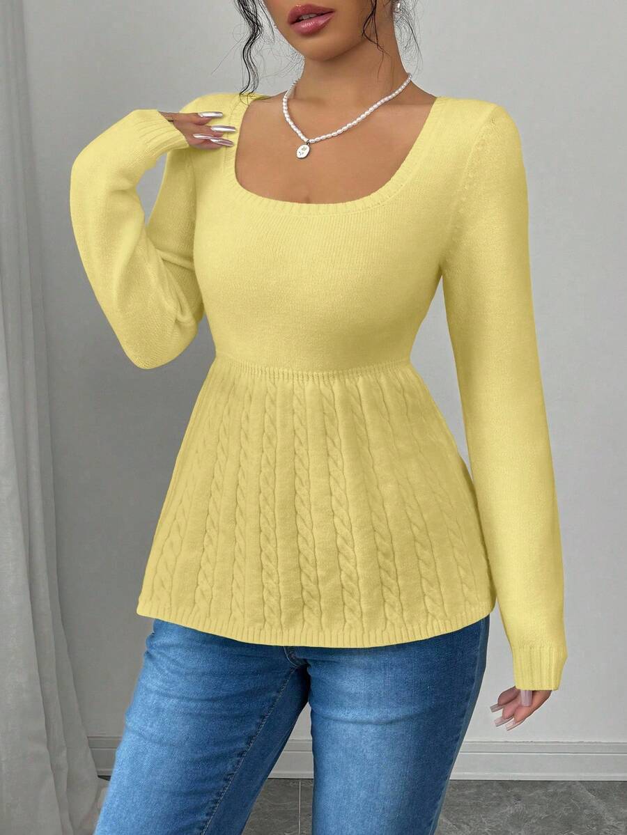 Maglietta corta bianca casual da donna con collo quadrato, maniche lunghe, colore unito