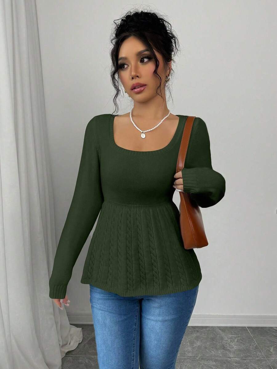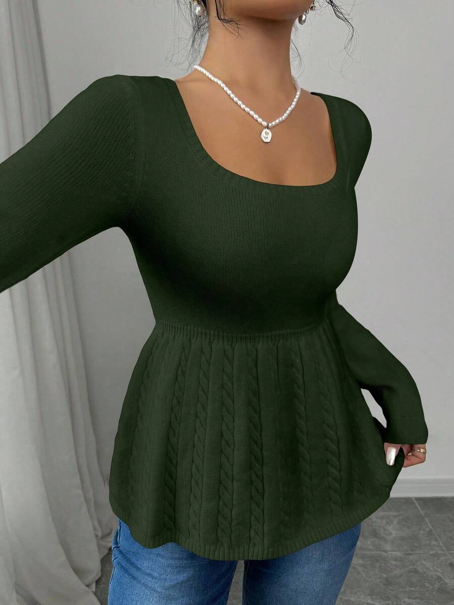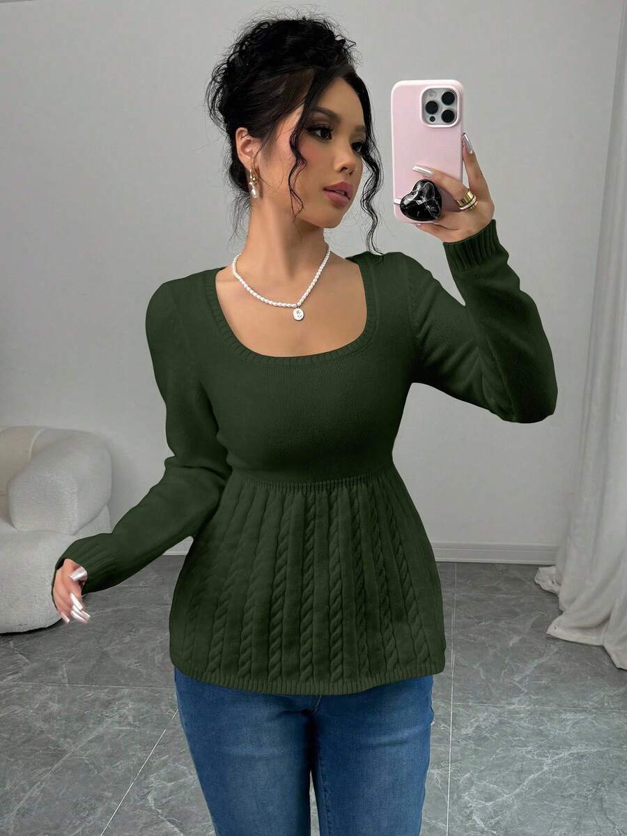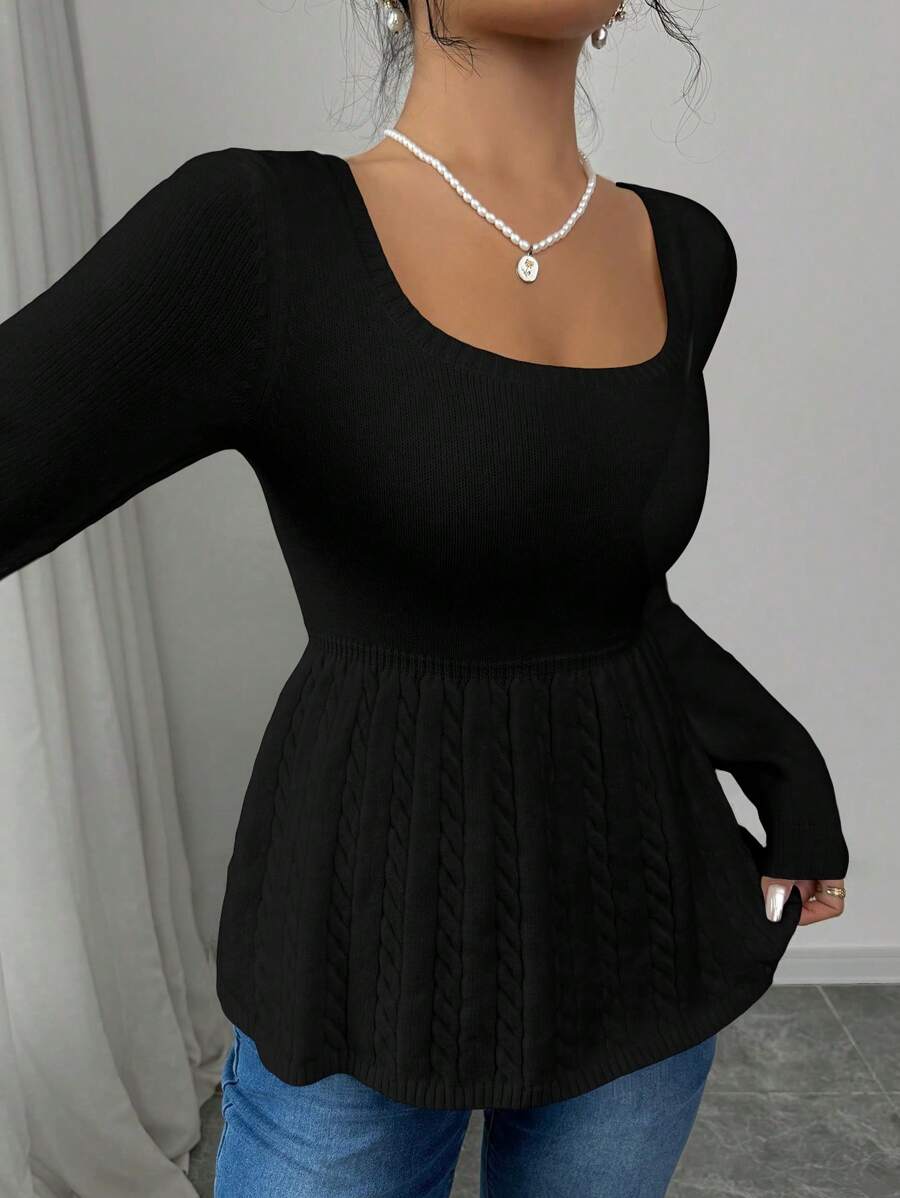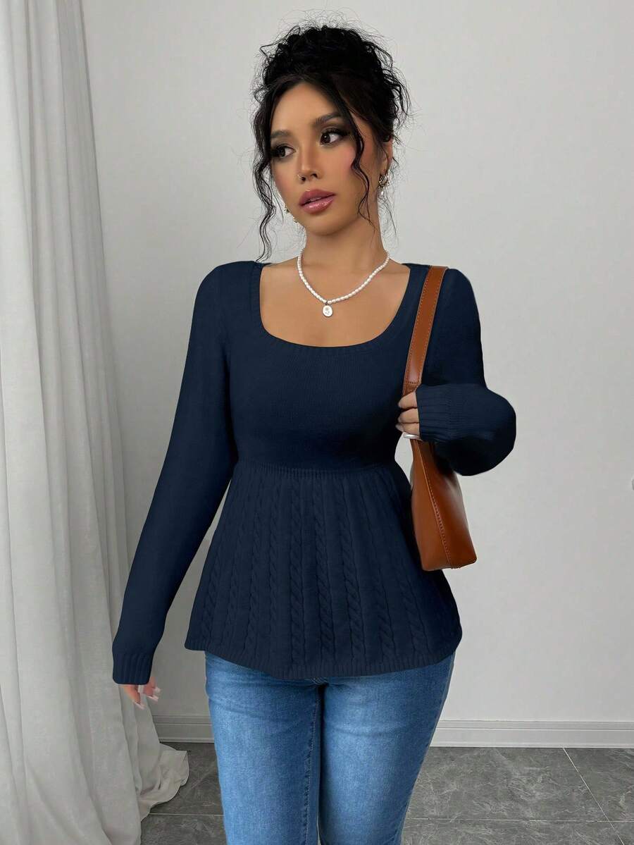 Maglietta corta bianca casual da donna con collo quadrato, maniche lunghe, colore unito