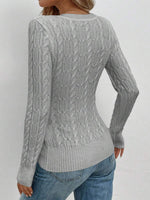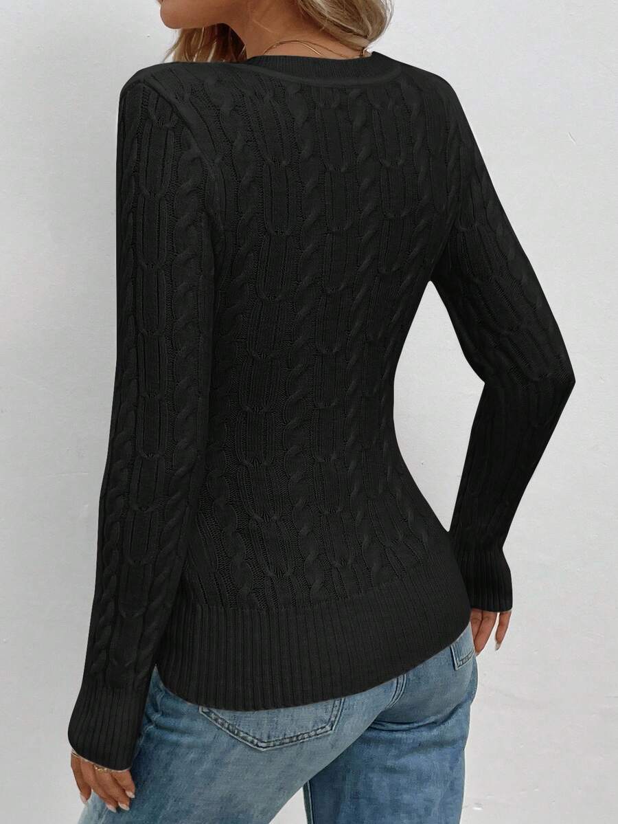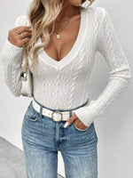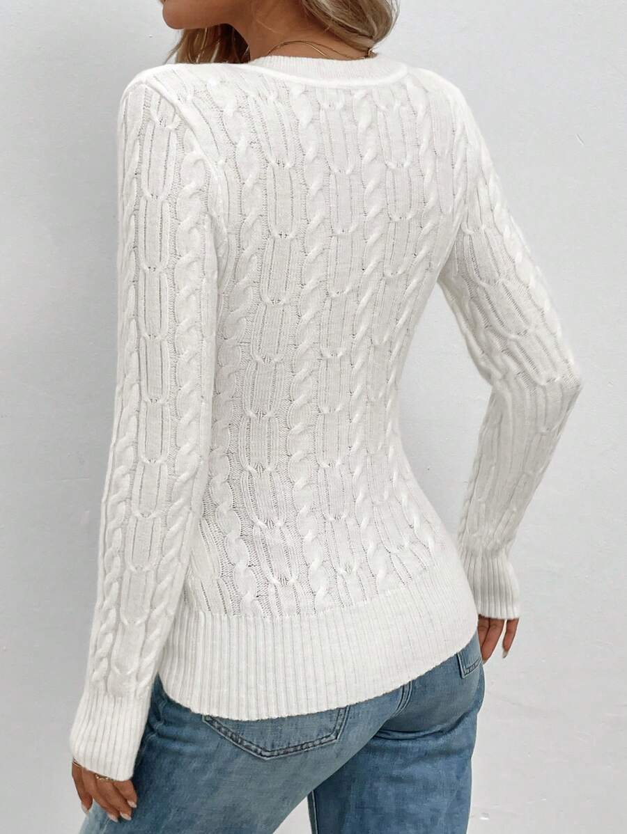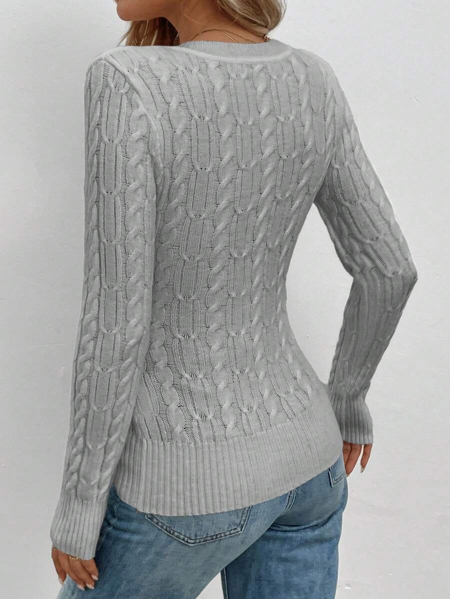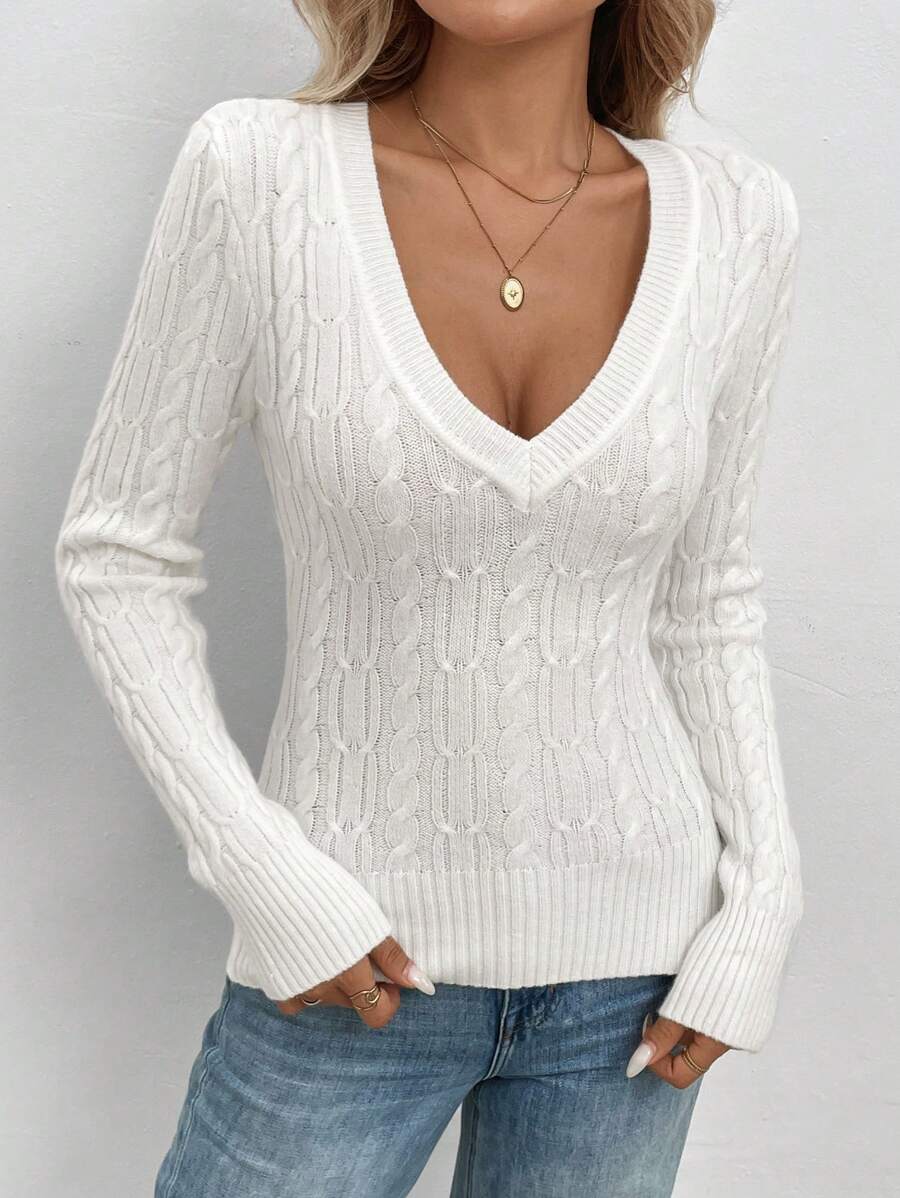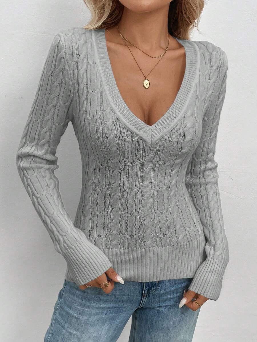 Maglione aderente a collo a V lavorato a trecce per donna, stile casual vintage