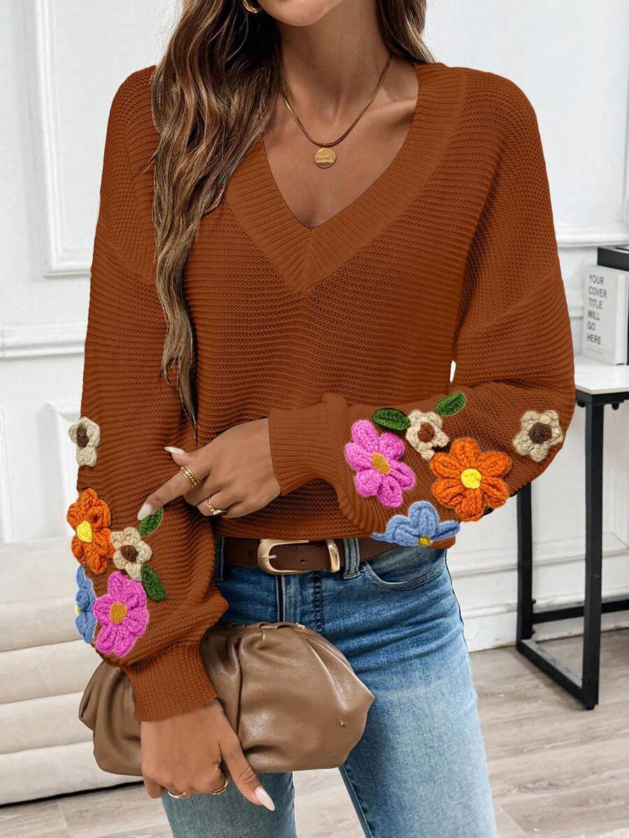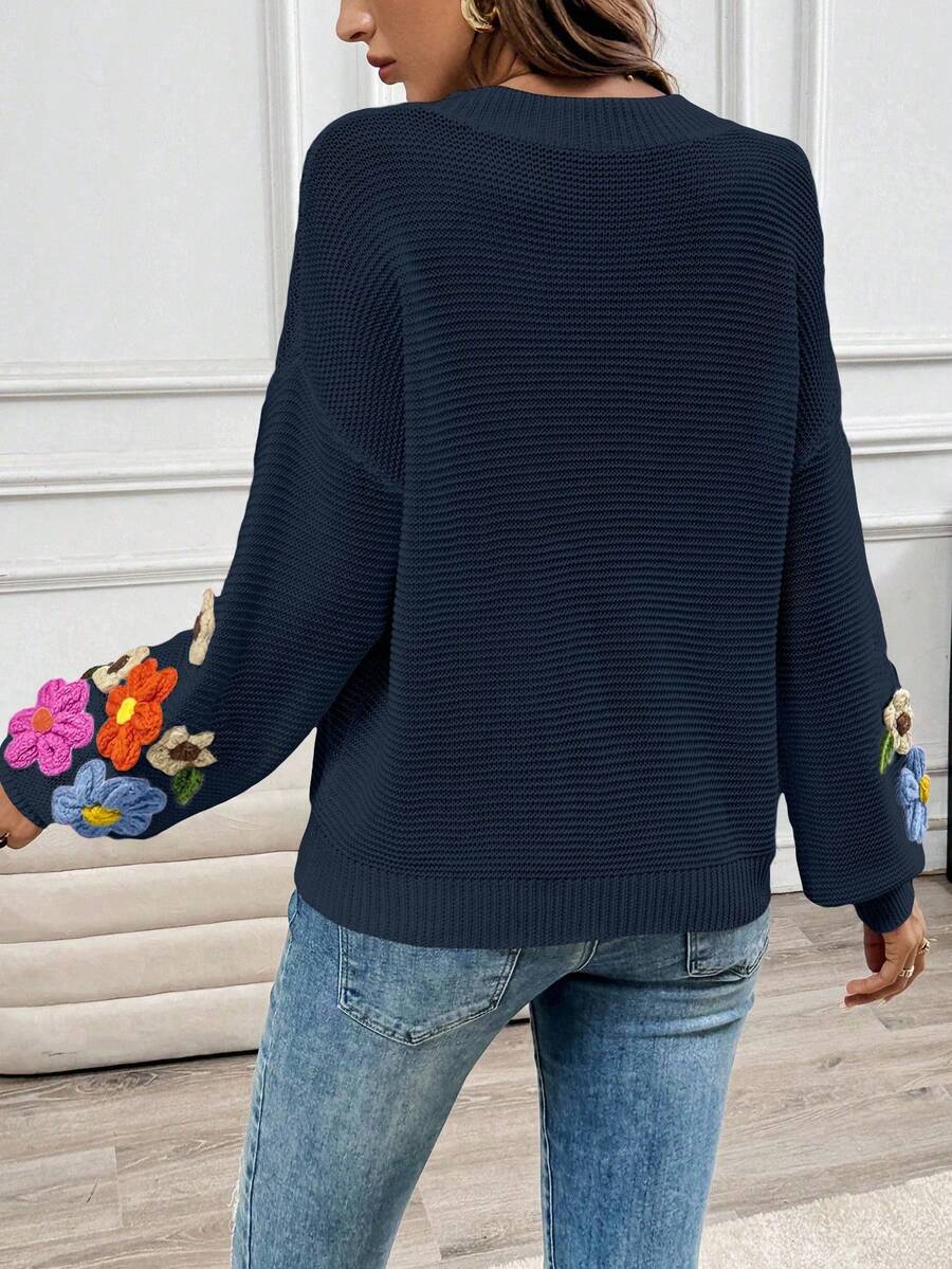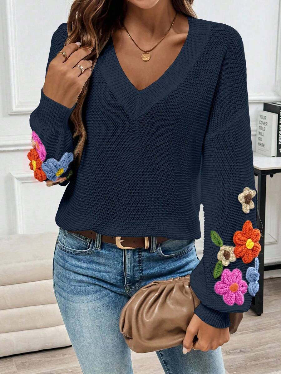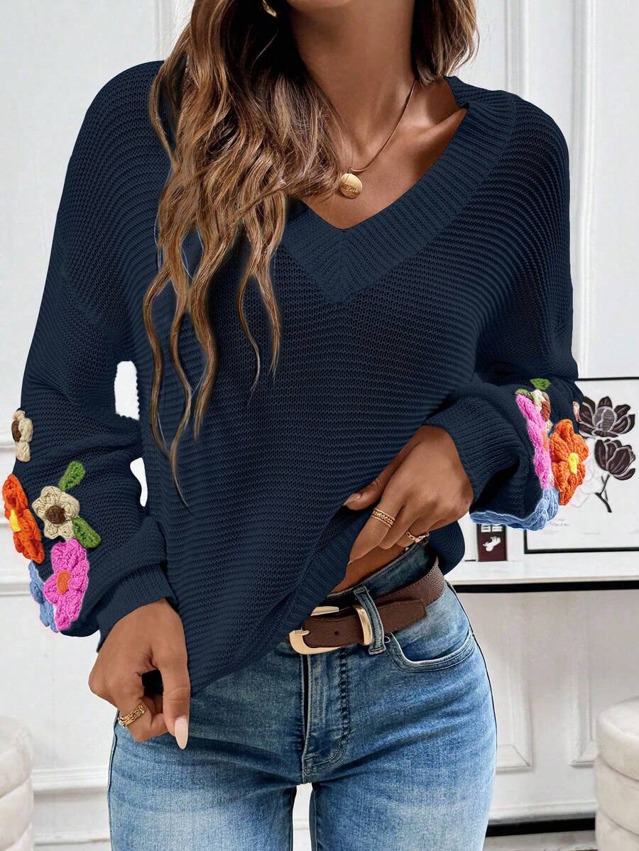 Maglione casual da donna con scollo a V, maniche a lanterna a uncinetto, manica lunga