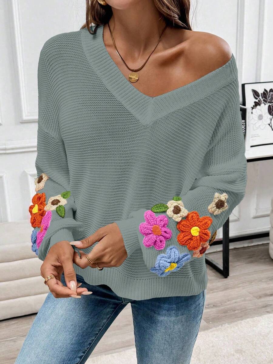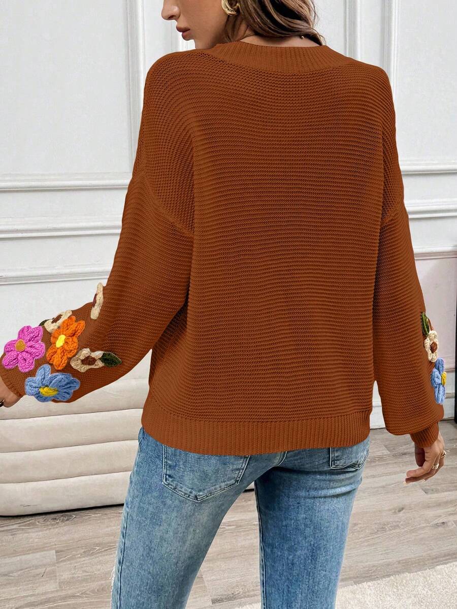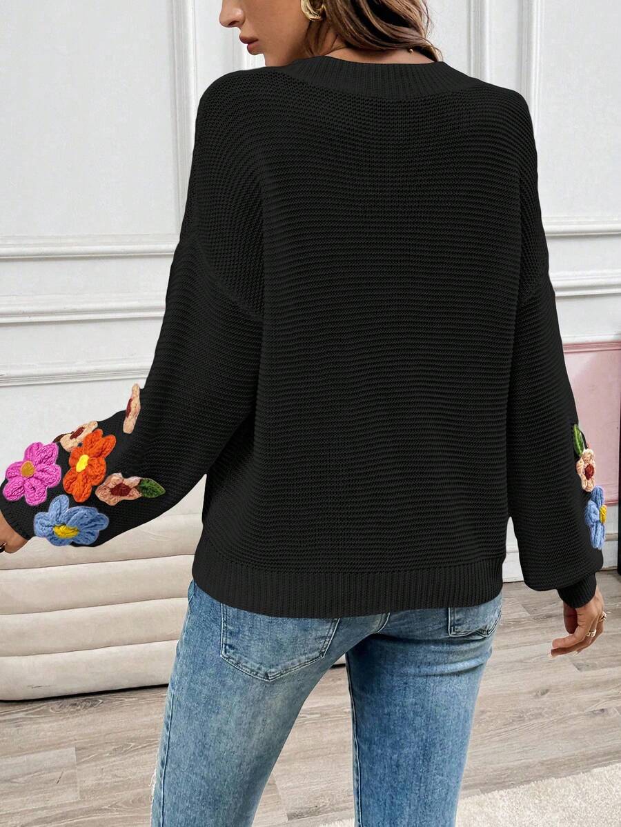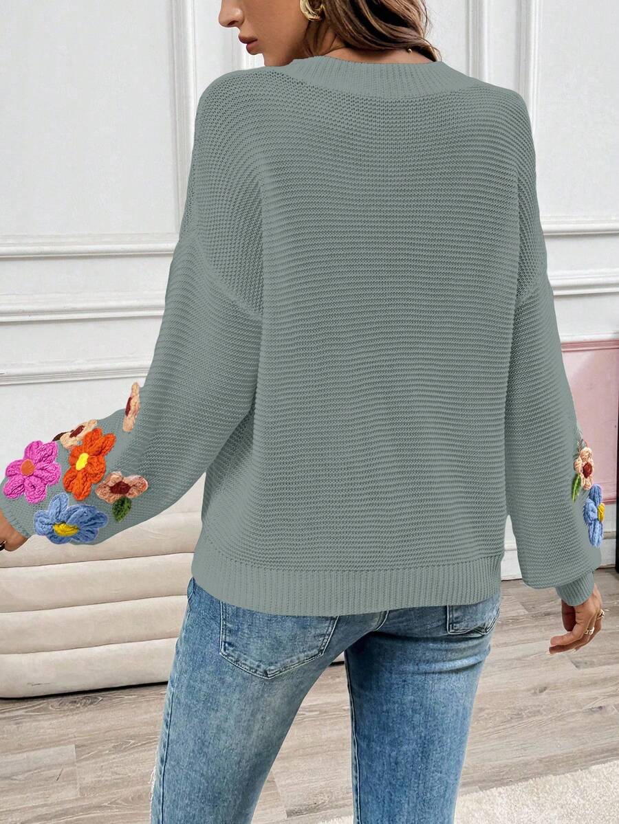 Maglione casual da donna con scollo a V, maniche a lanterna a uncinetto, manica lunga
