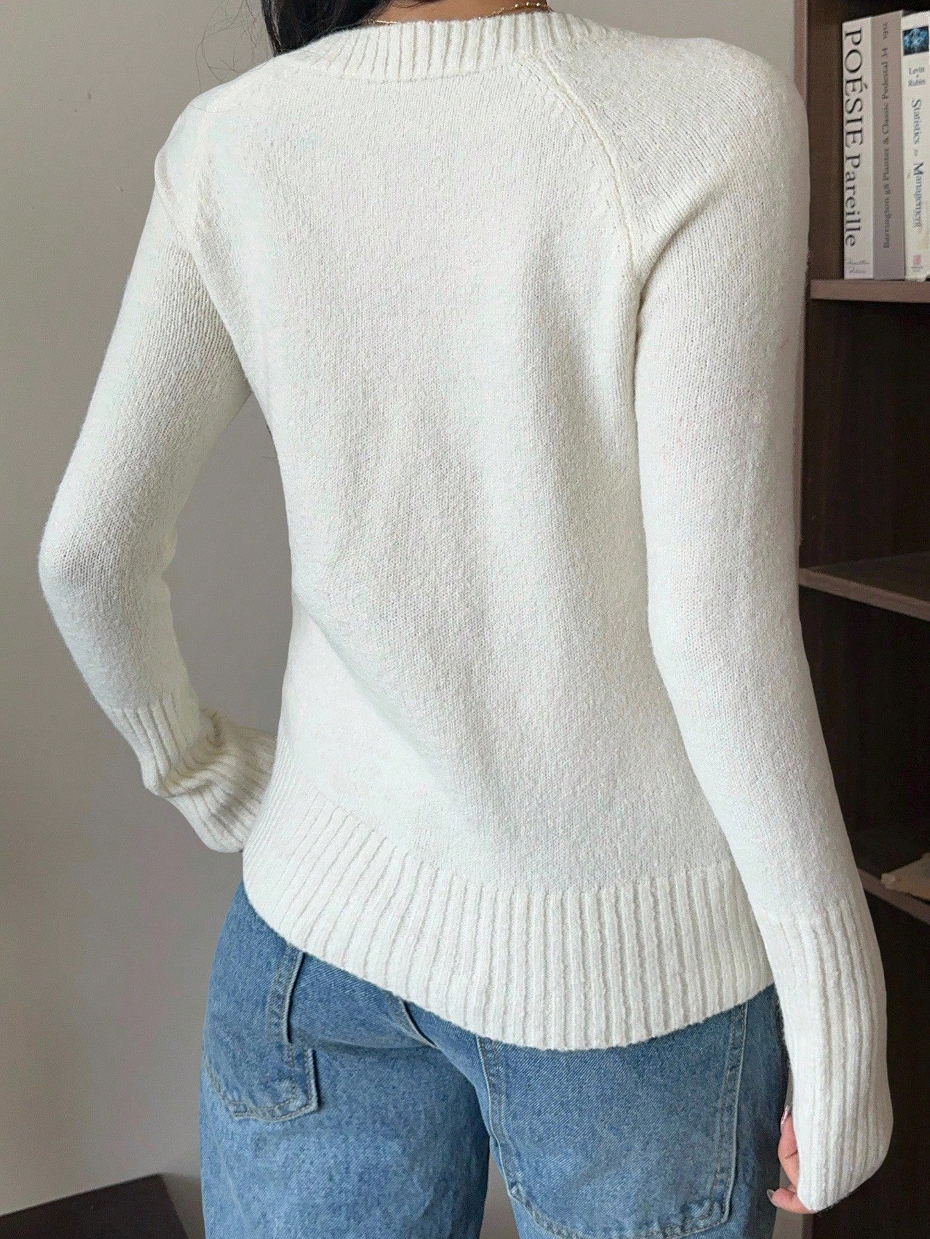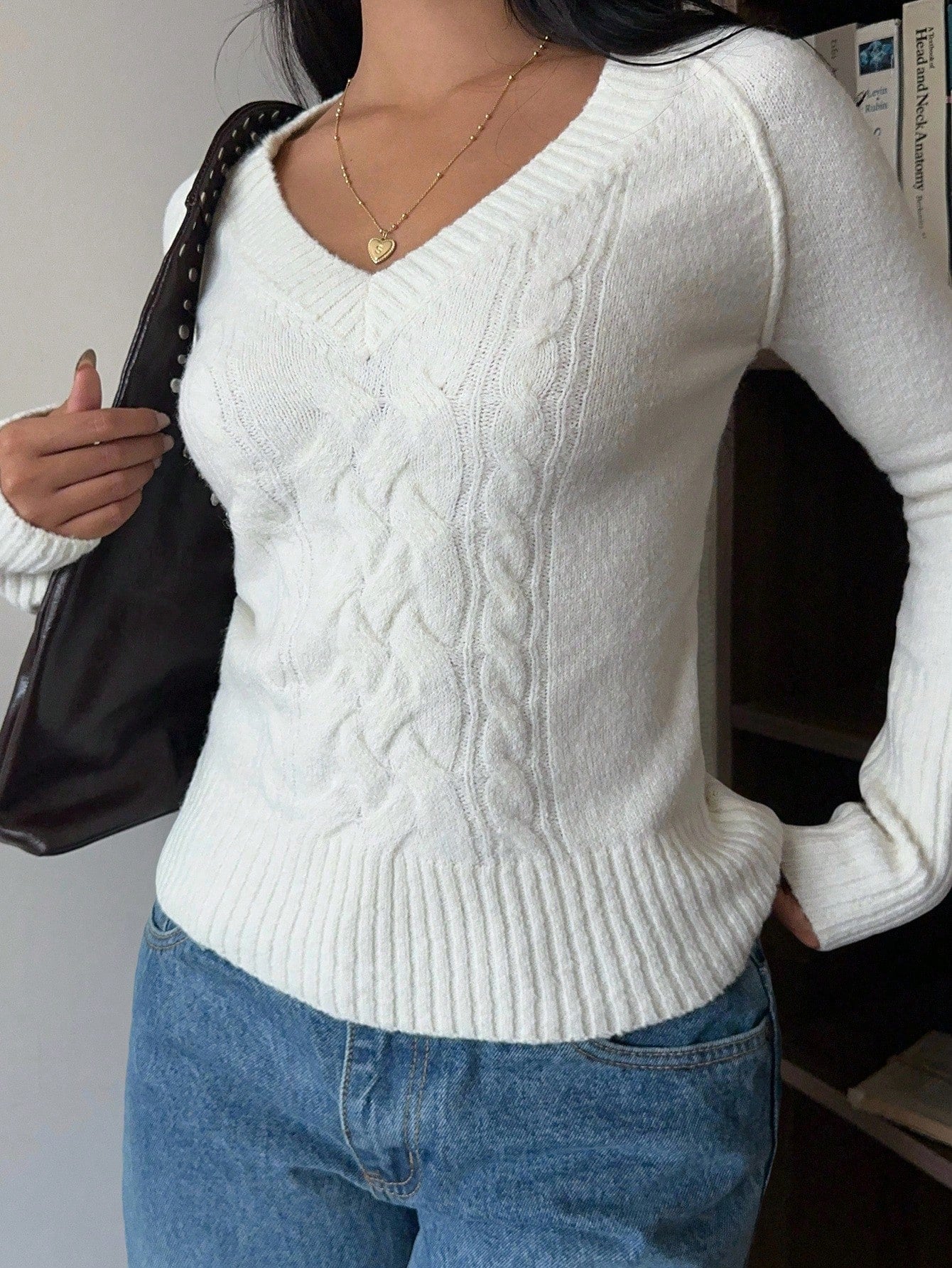 Maglione da donna con scollo a V, maniche a raglan, motivo a trecce attorcigliate
