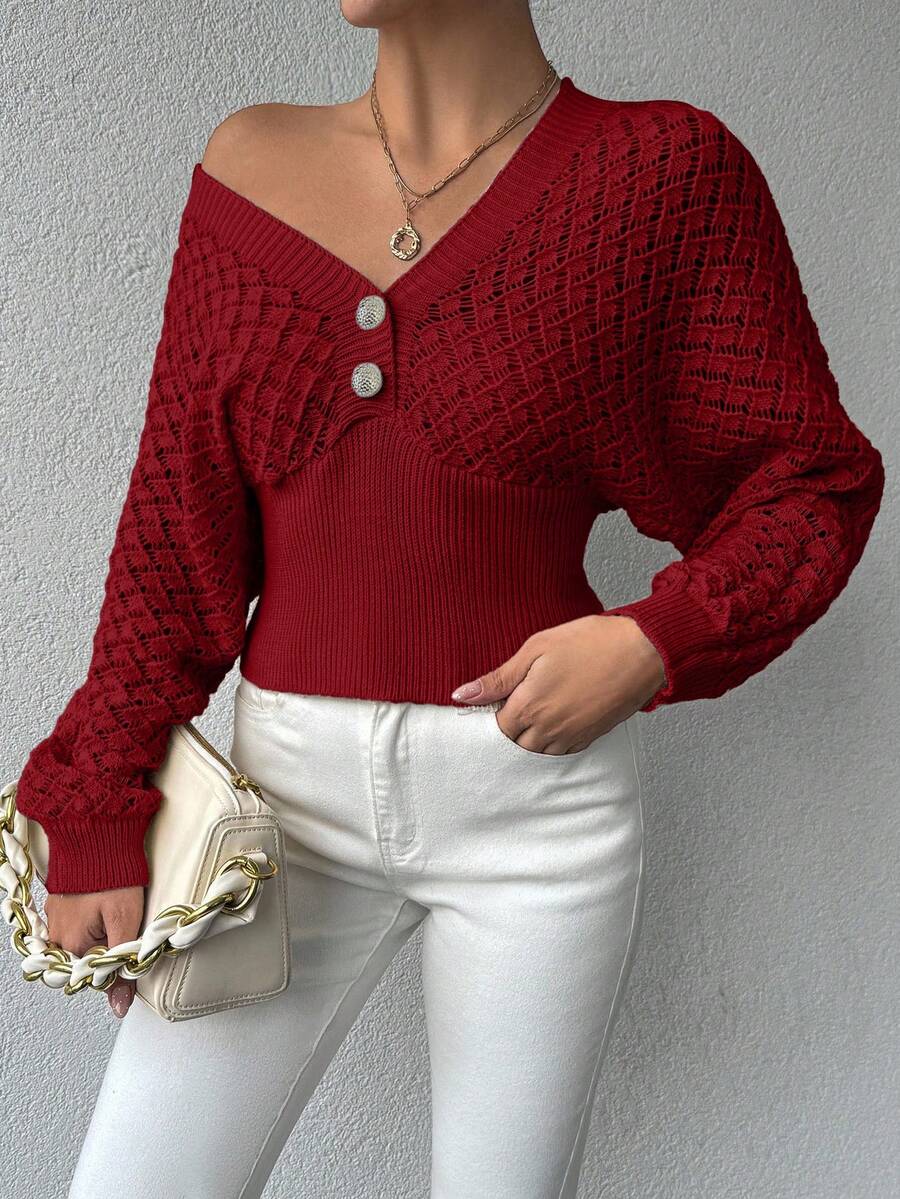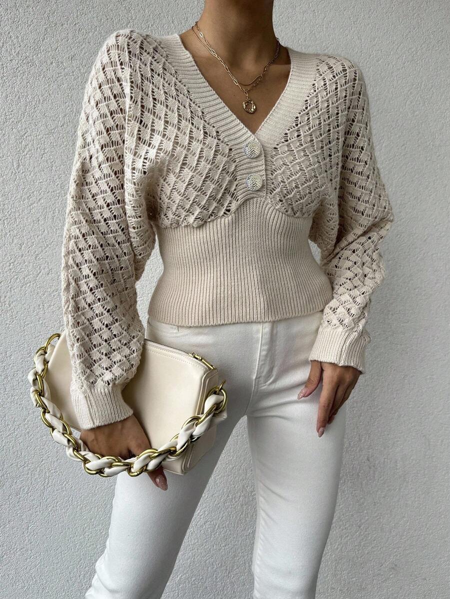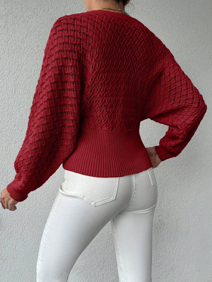 Maglione da donna con scollo a V, vita stretta e maniche a pipistrello