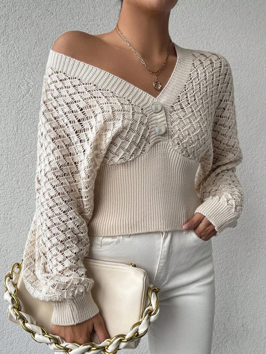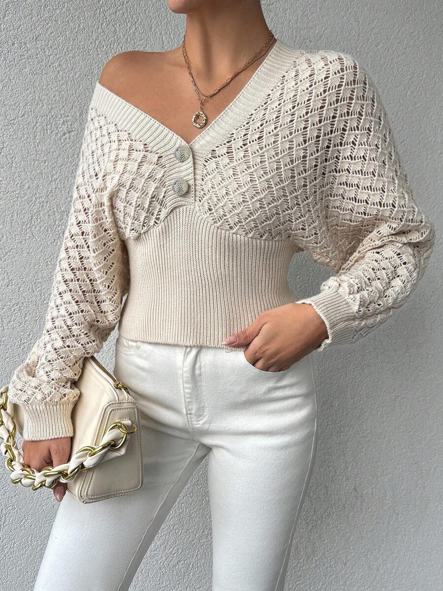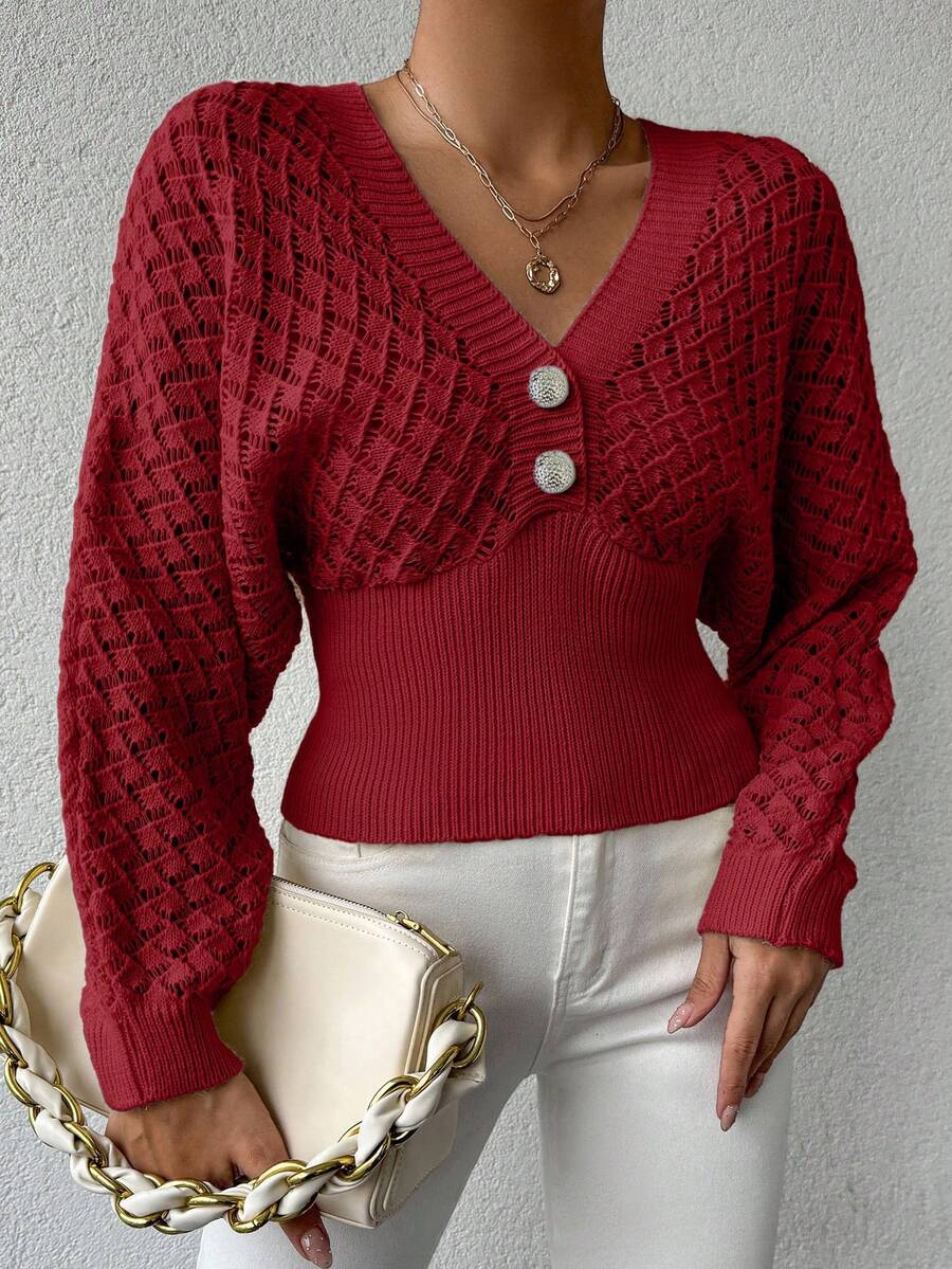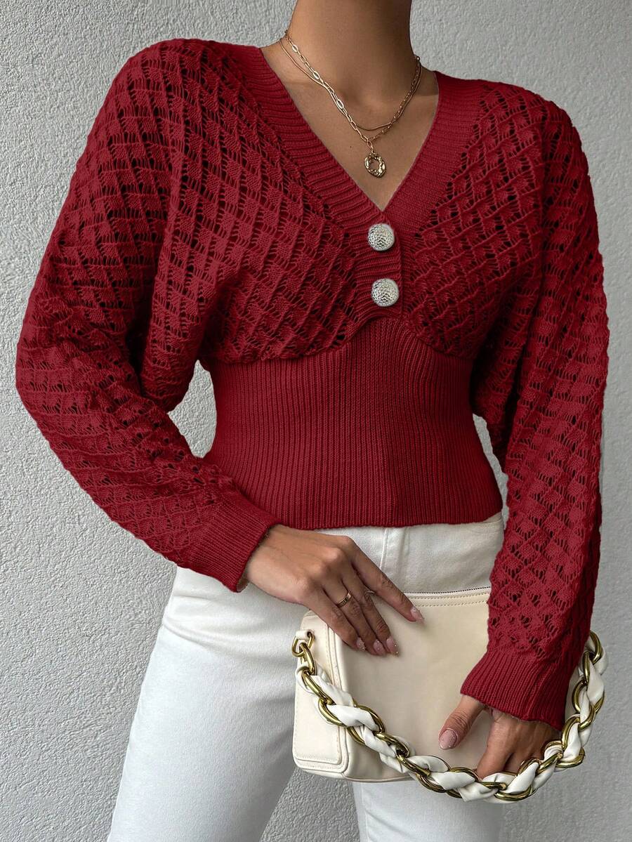 Maglione da donna con scollo a V, vita stretta e maniche a pipistrello