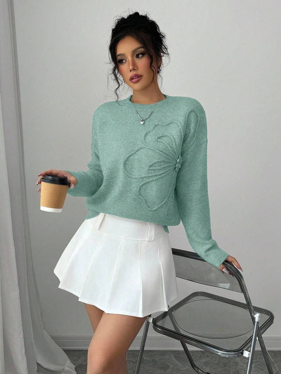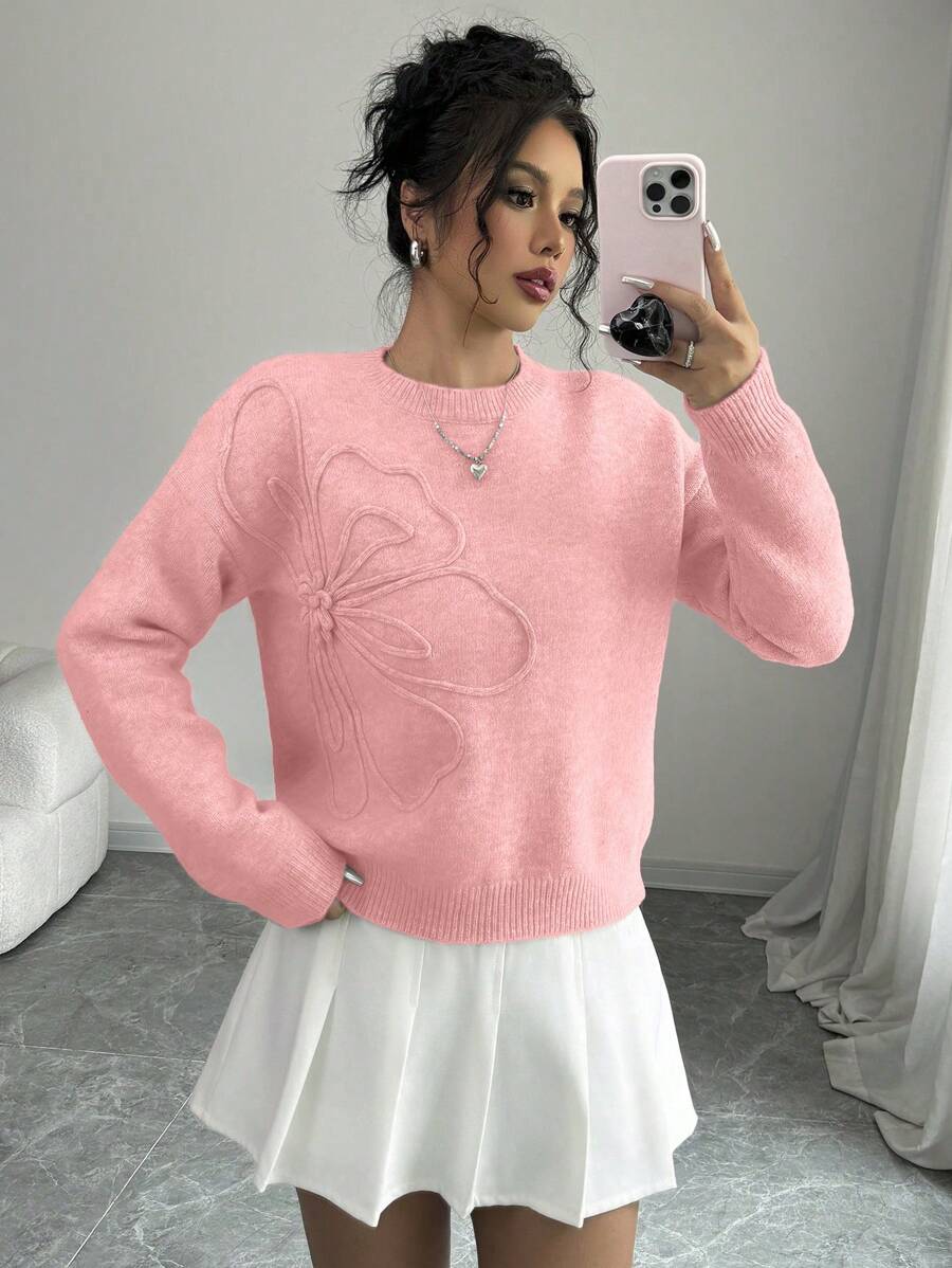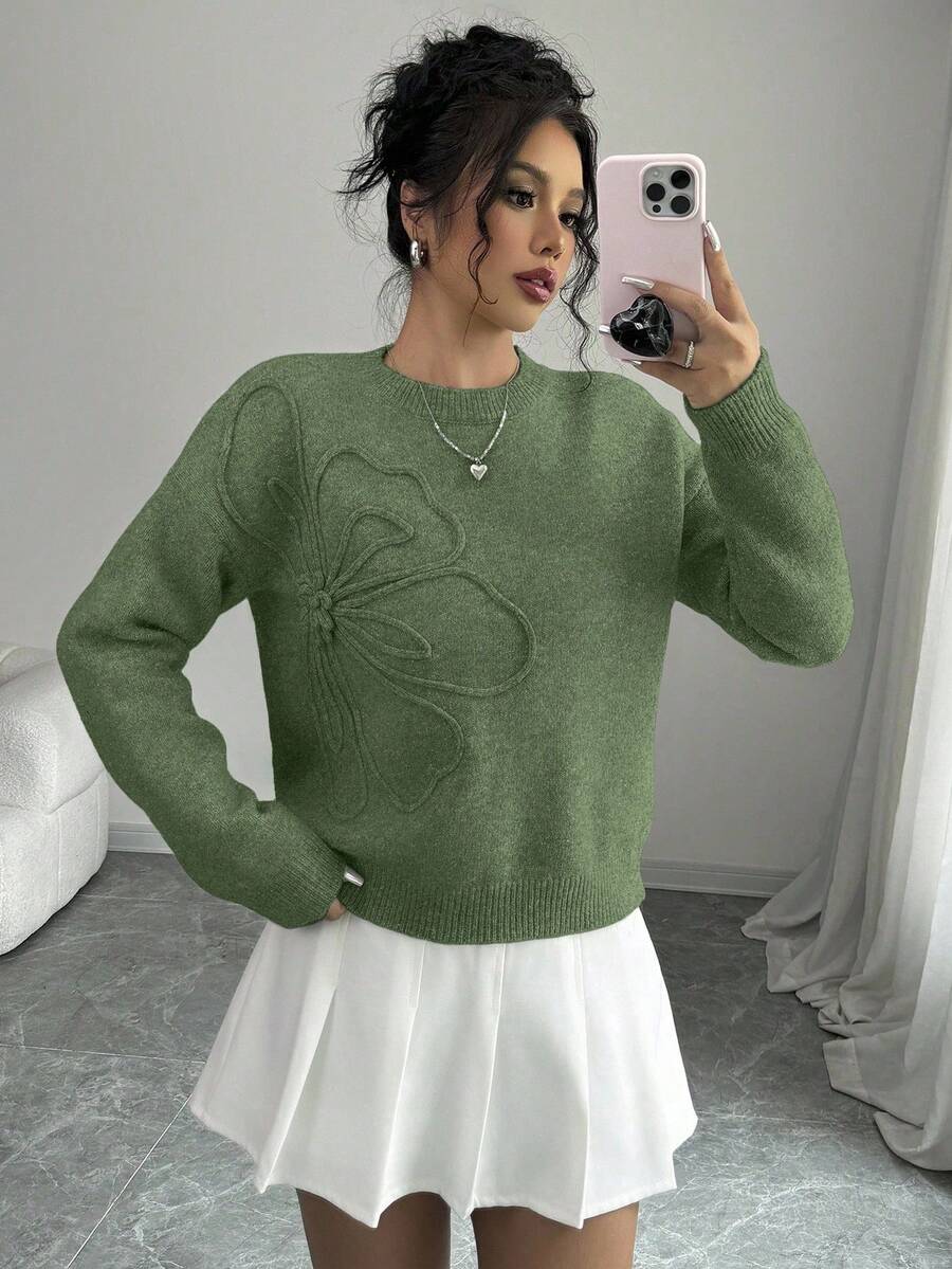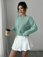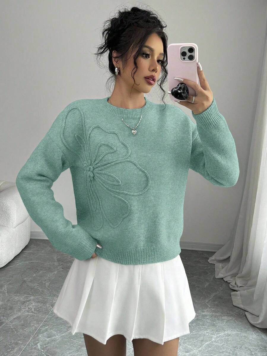 Maglione donna con collo a giro, motivo floreale, tinta unita, maniche lunghe
