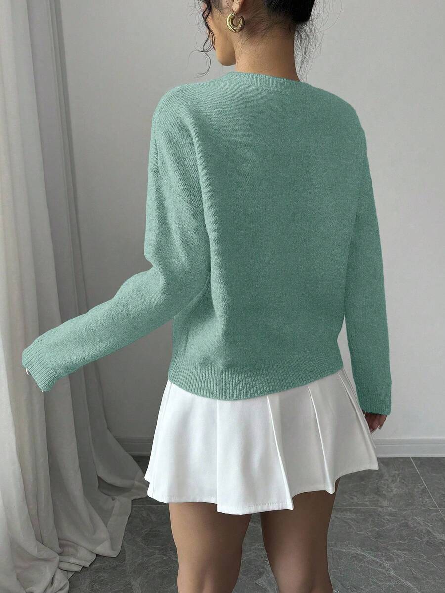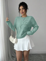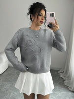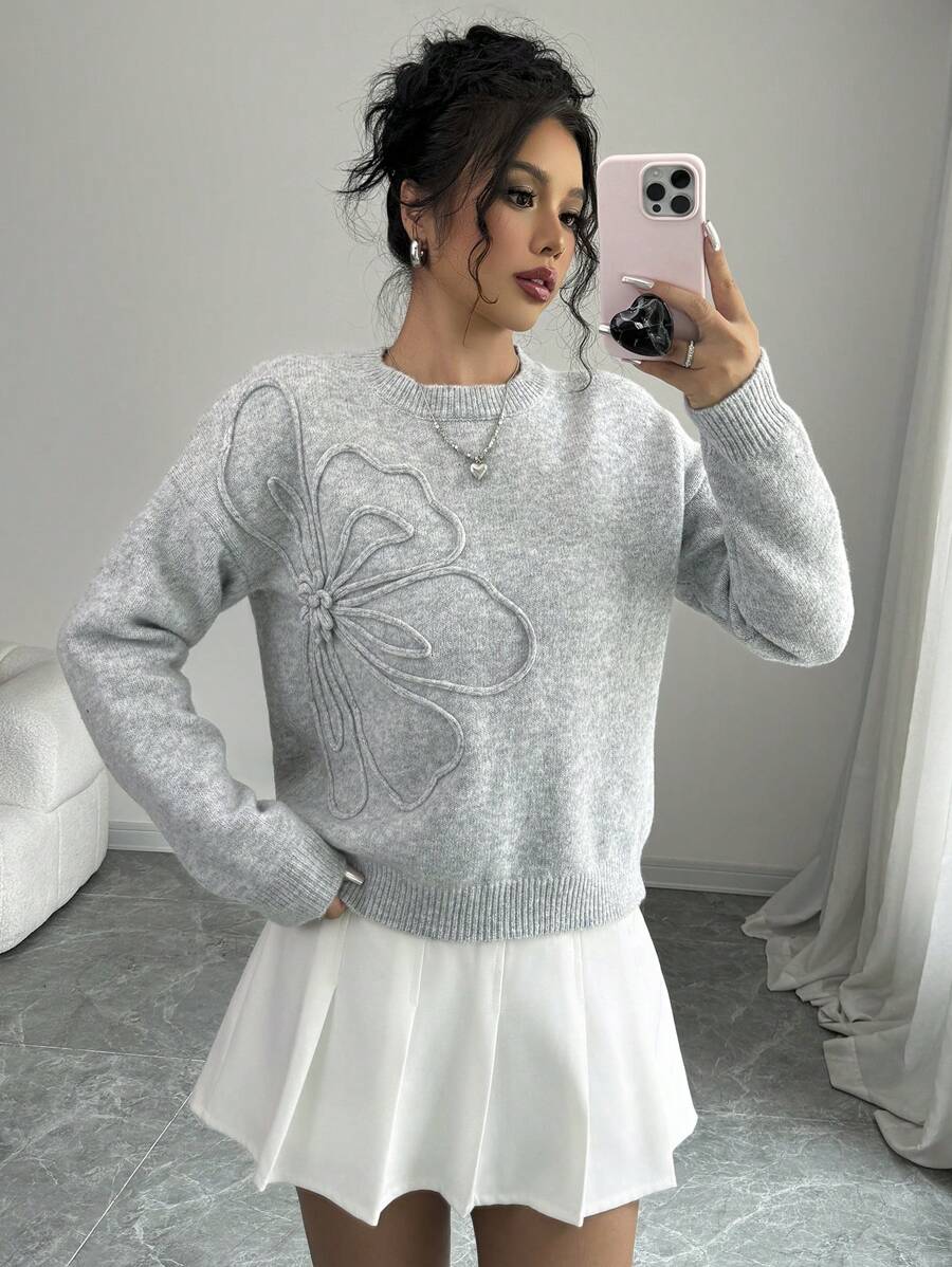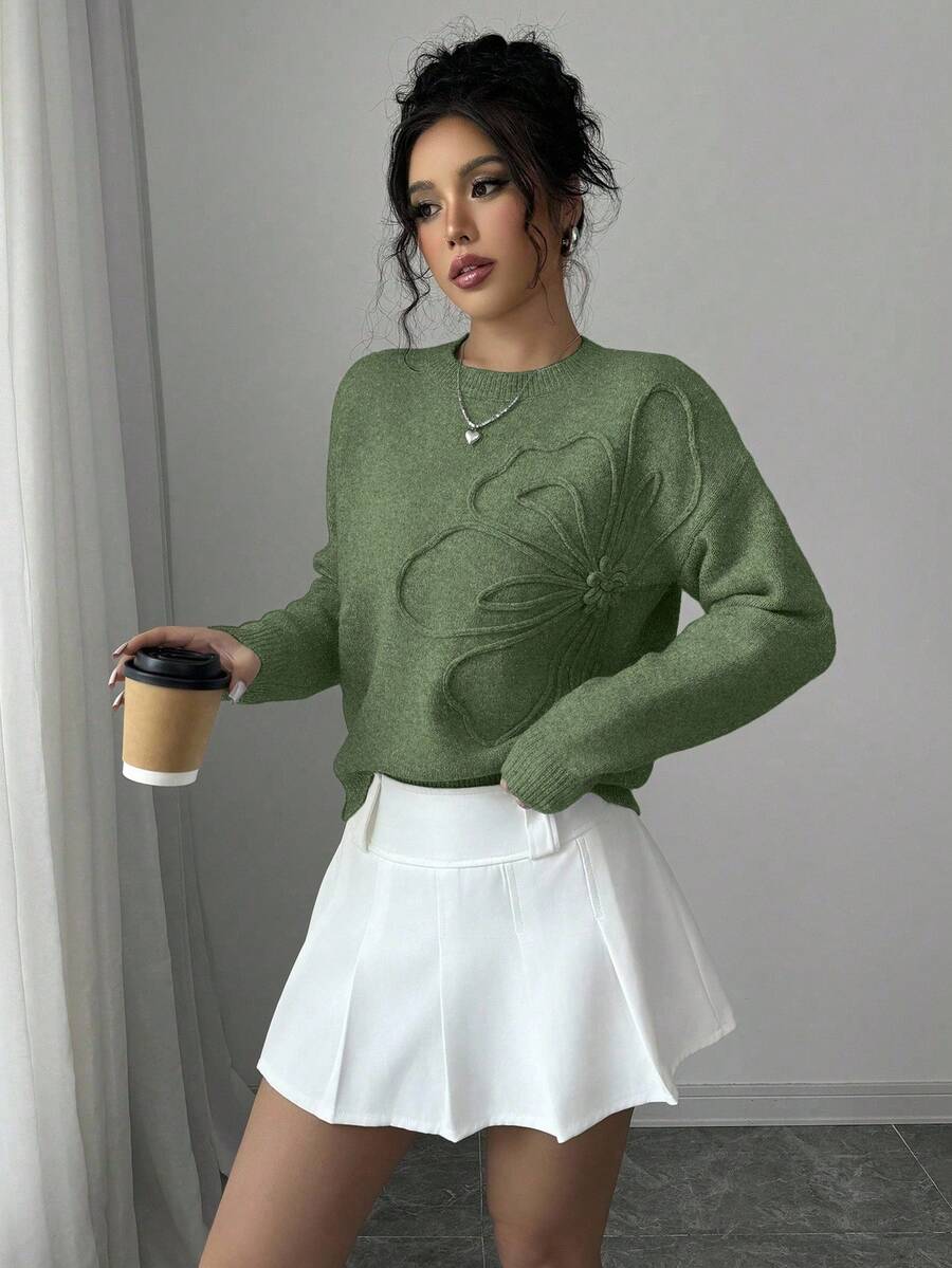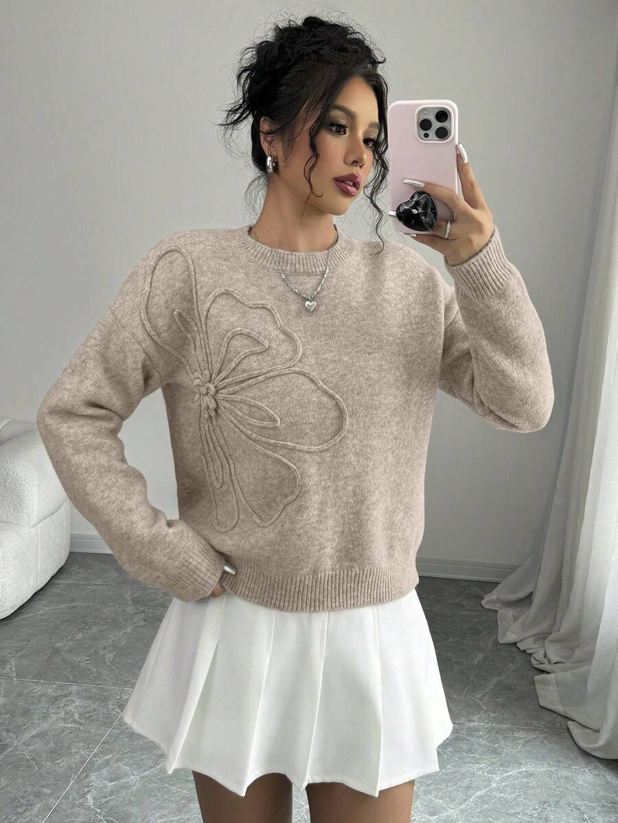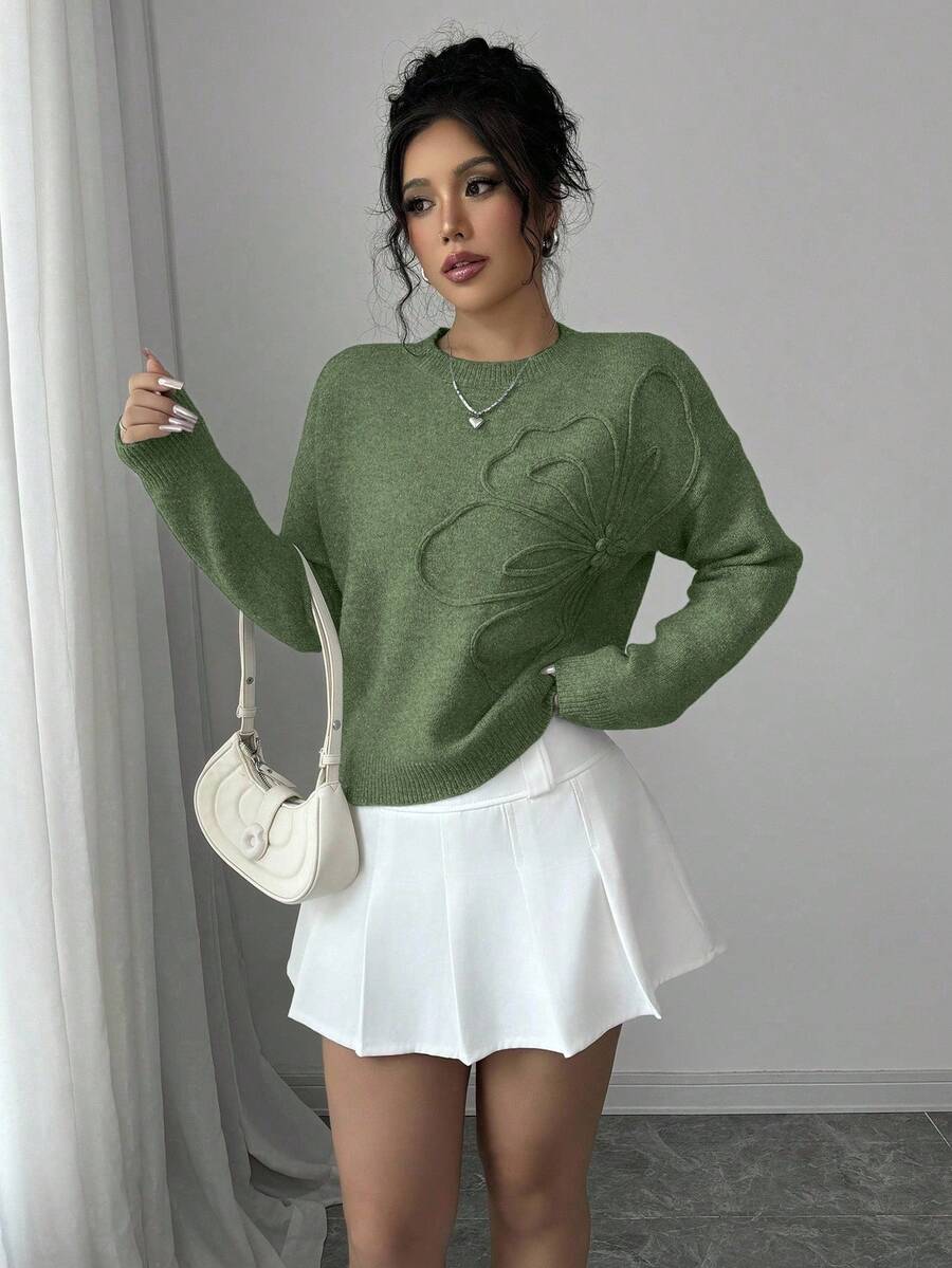 Maglione donna con collo a giro, motivo floreale, tinta unita, maniche lunghe