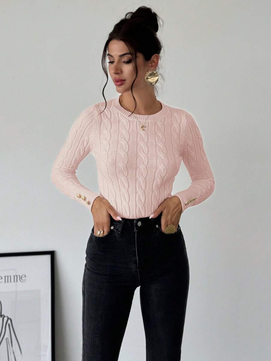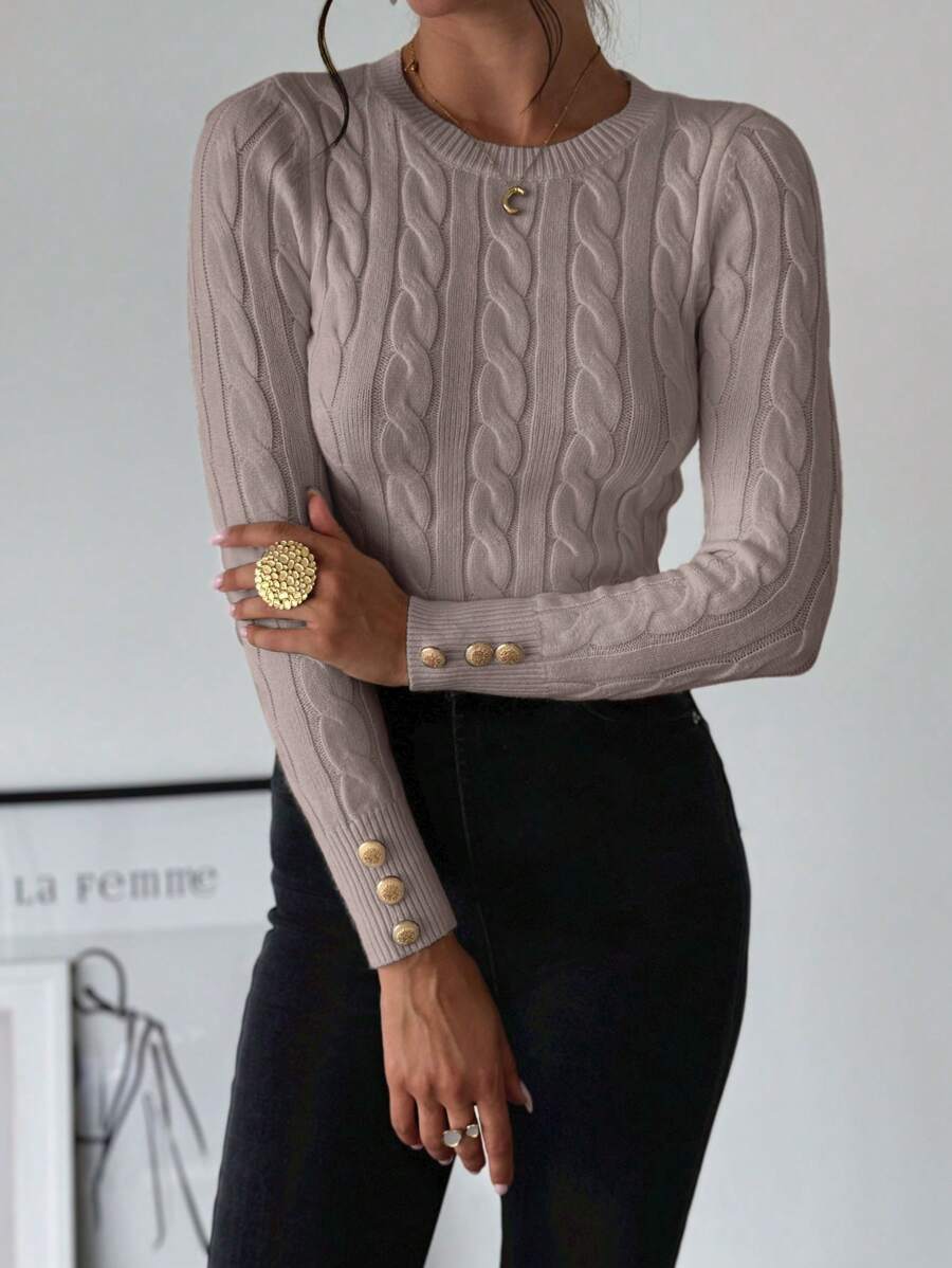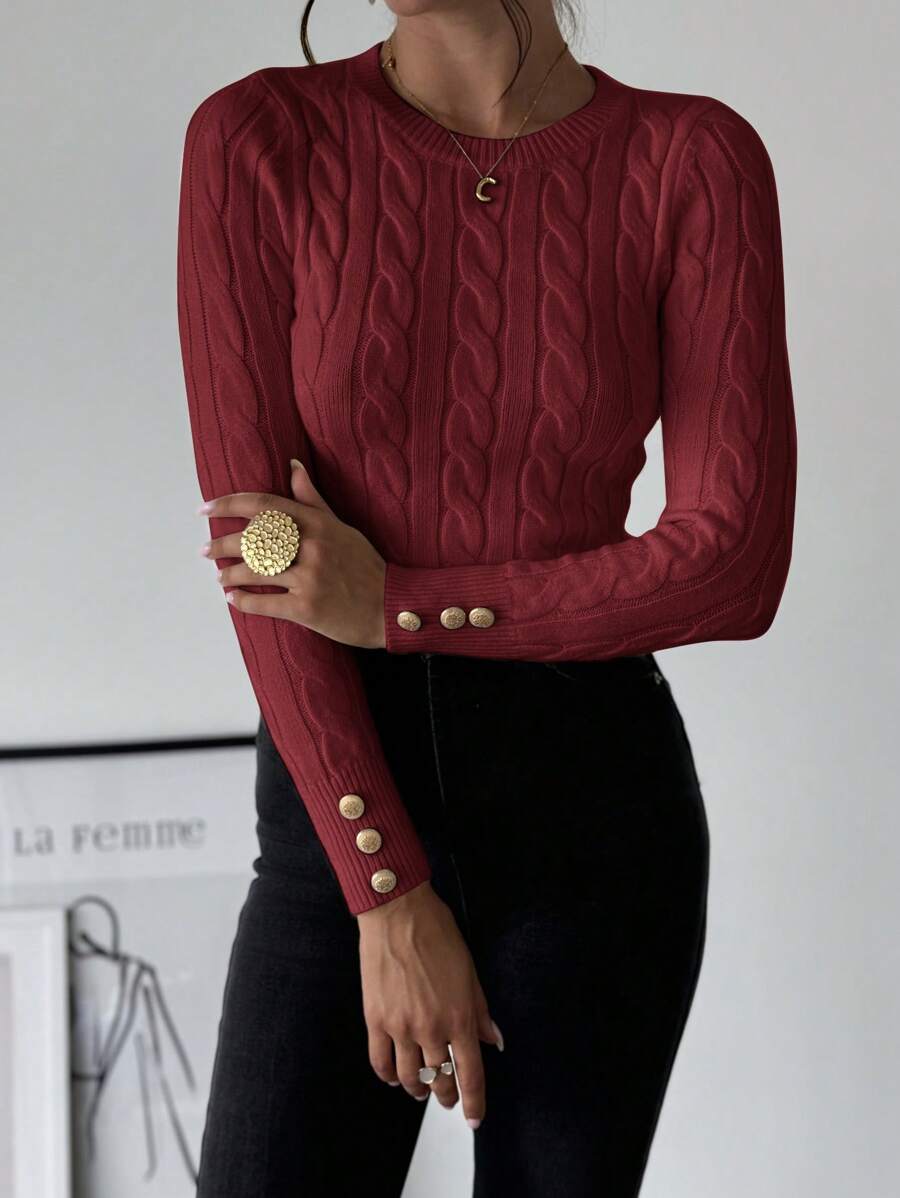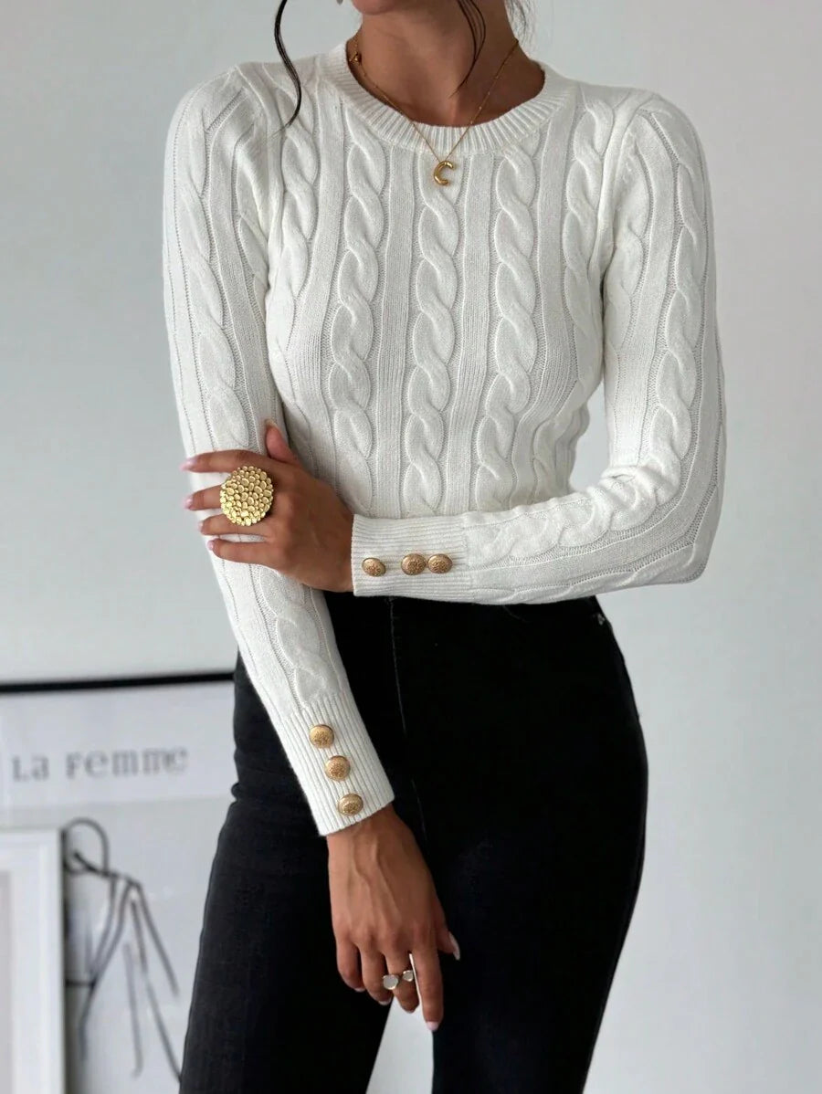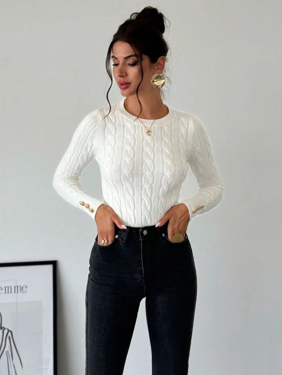 Maglione semplice ed elegante da donna, a collo alto, lavorato a trecce, decorato, aderente, maniche lunghe