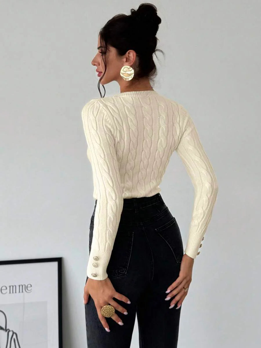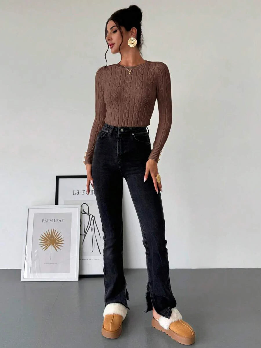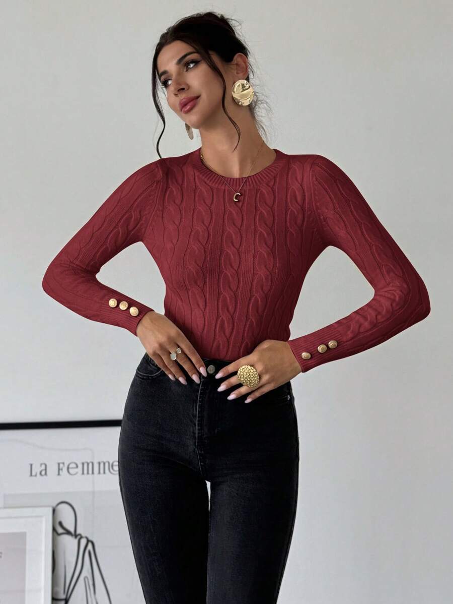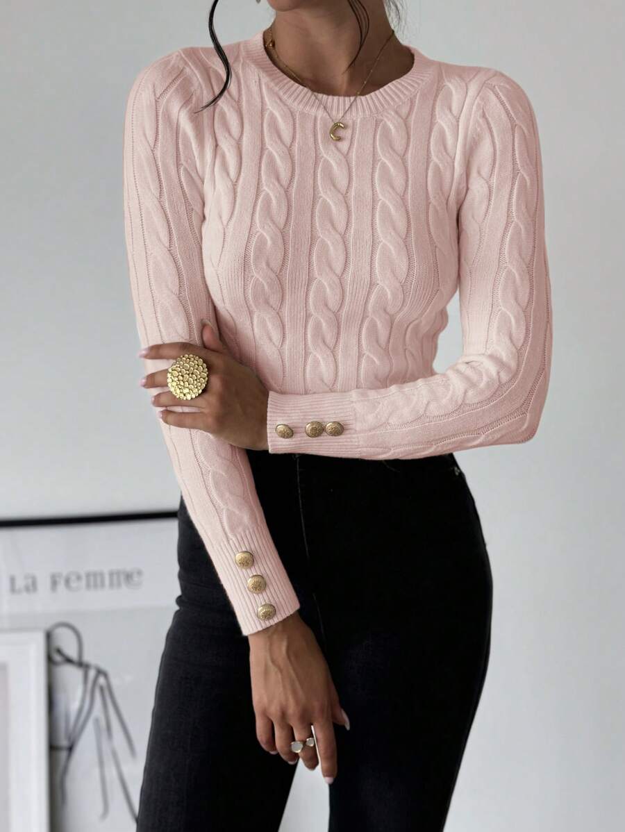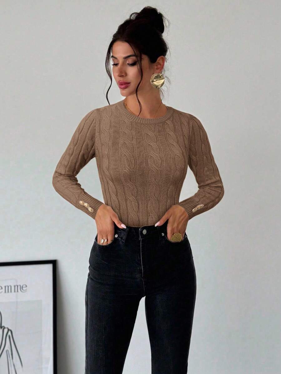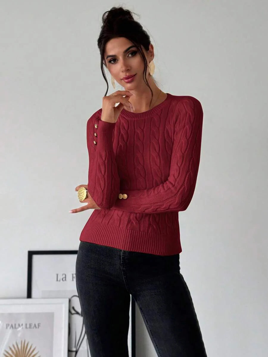 Maglione semplice ed elegante da donna, a collo alto, lavorato a trecce, decorato, aderente, maniche lunghe