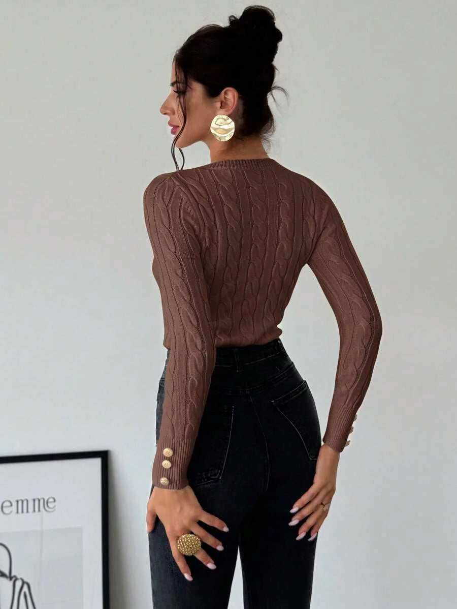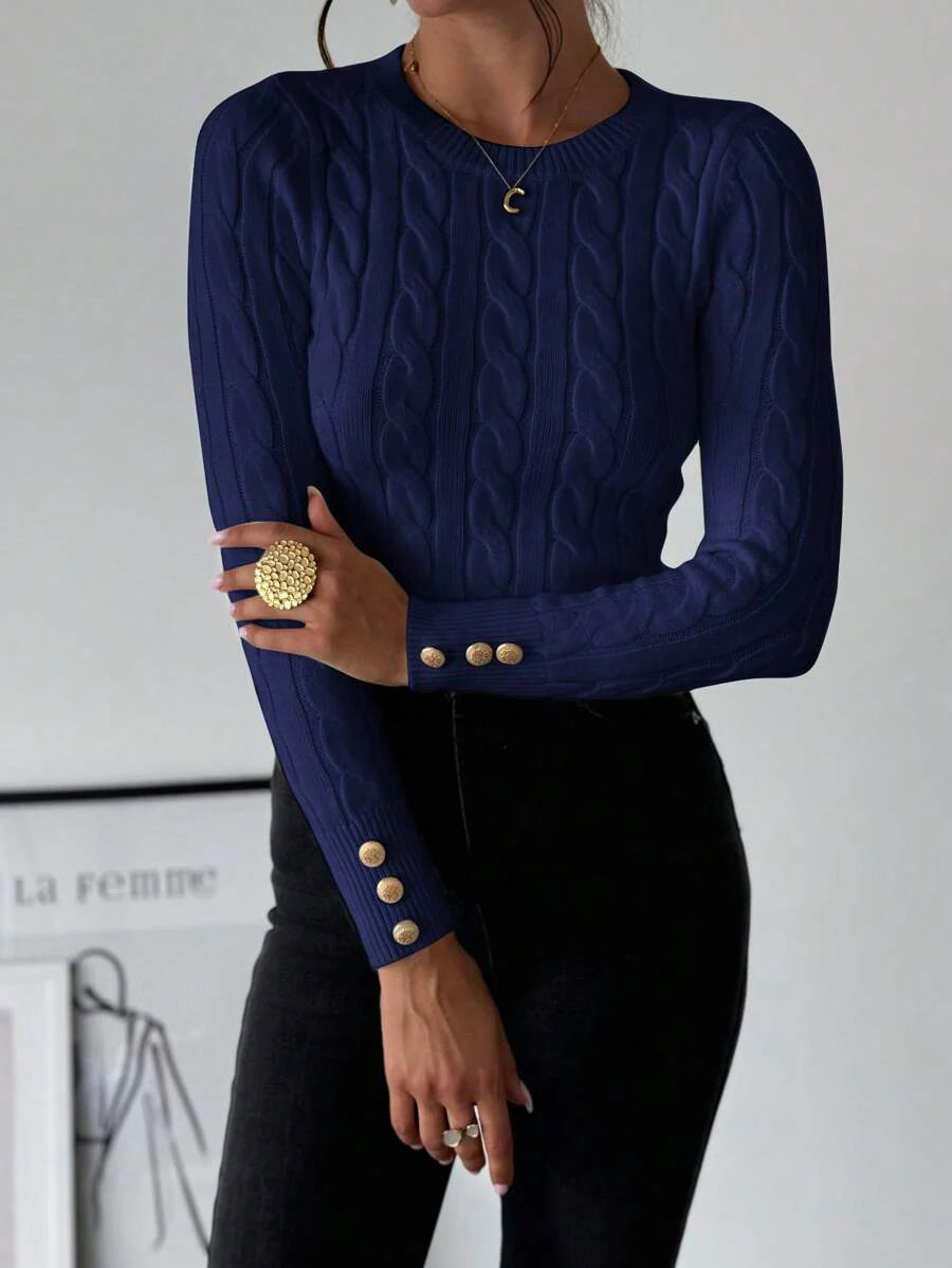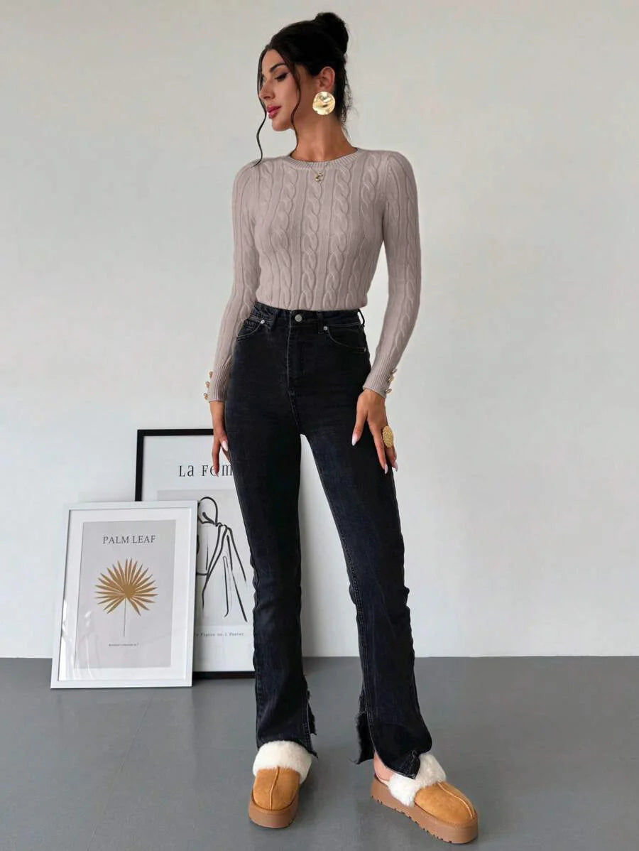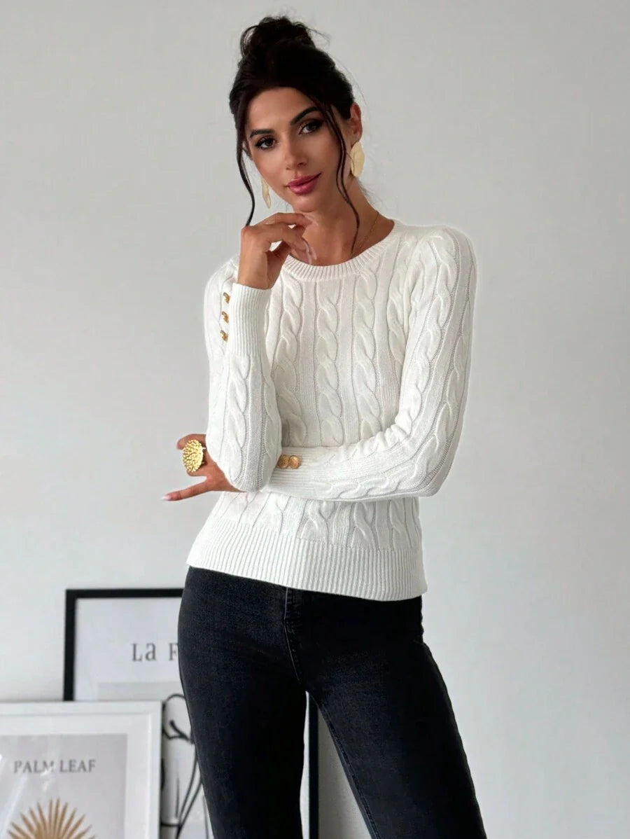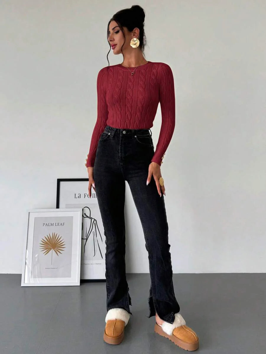 Maglione semplice ed elegante da donna, a collo alto, lavorato a trecce, decorato, aderente, maniche lunghe