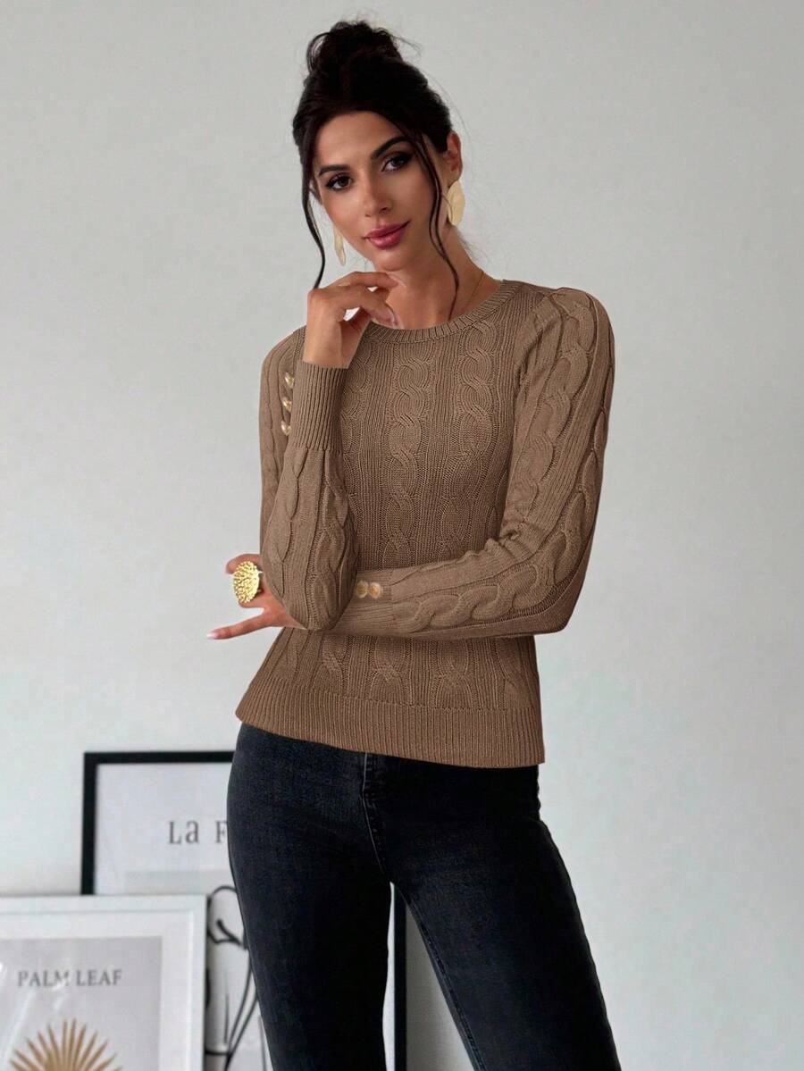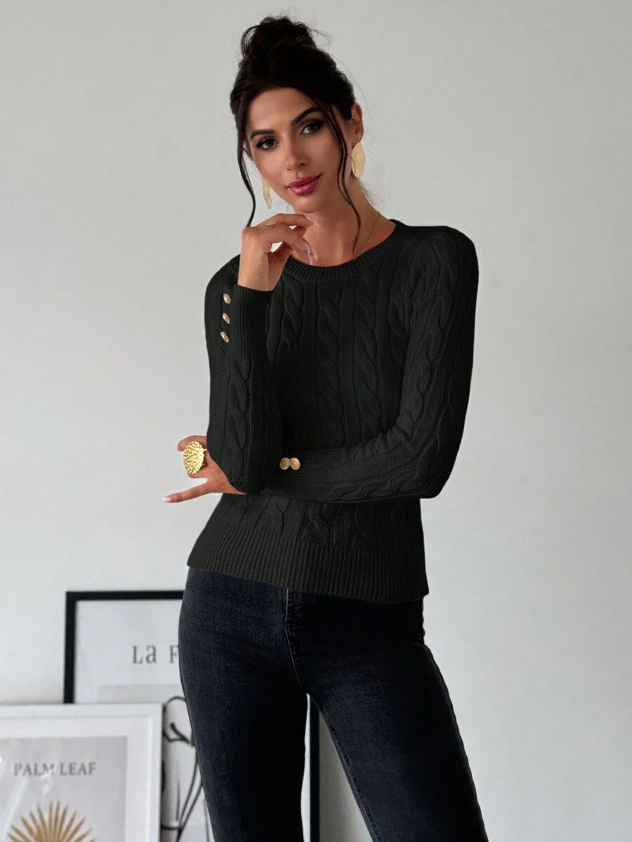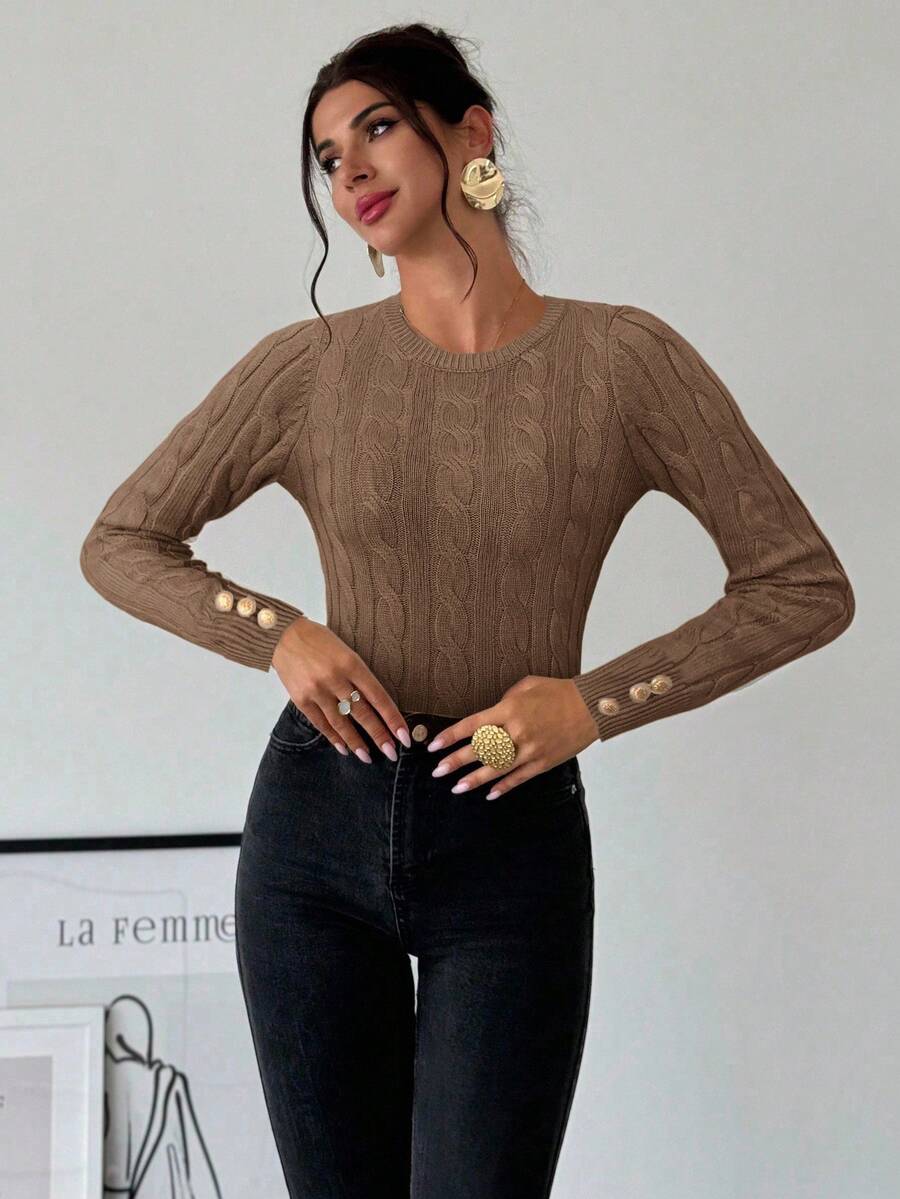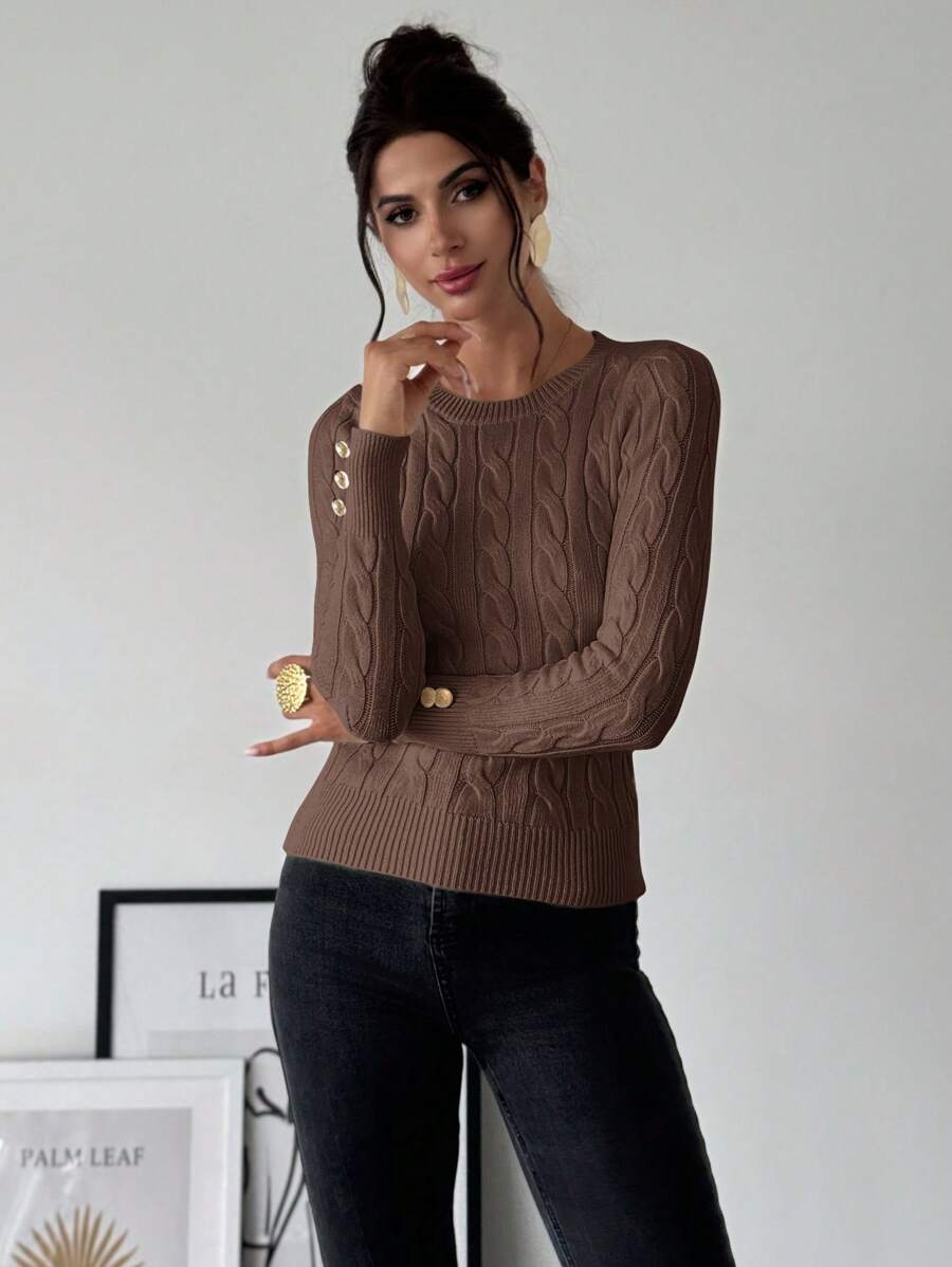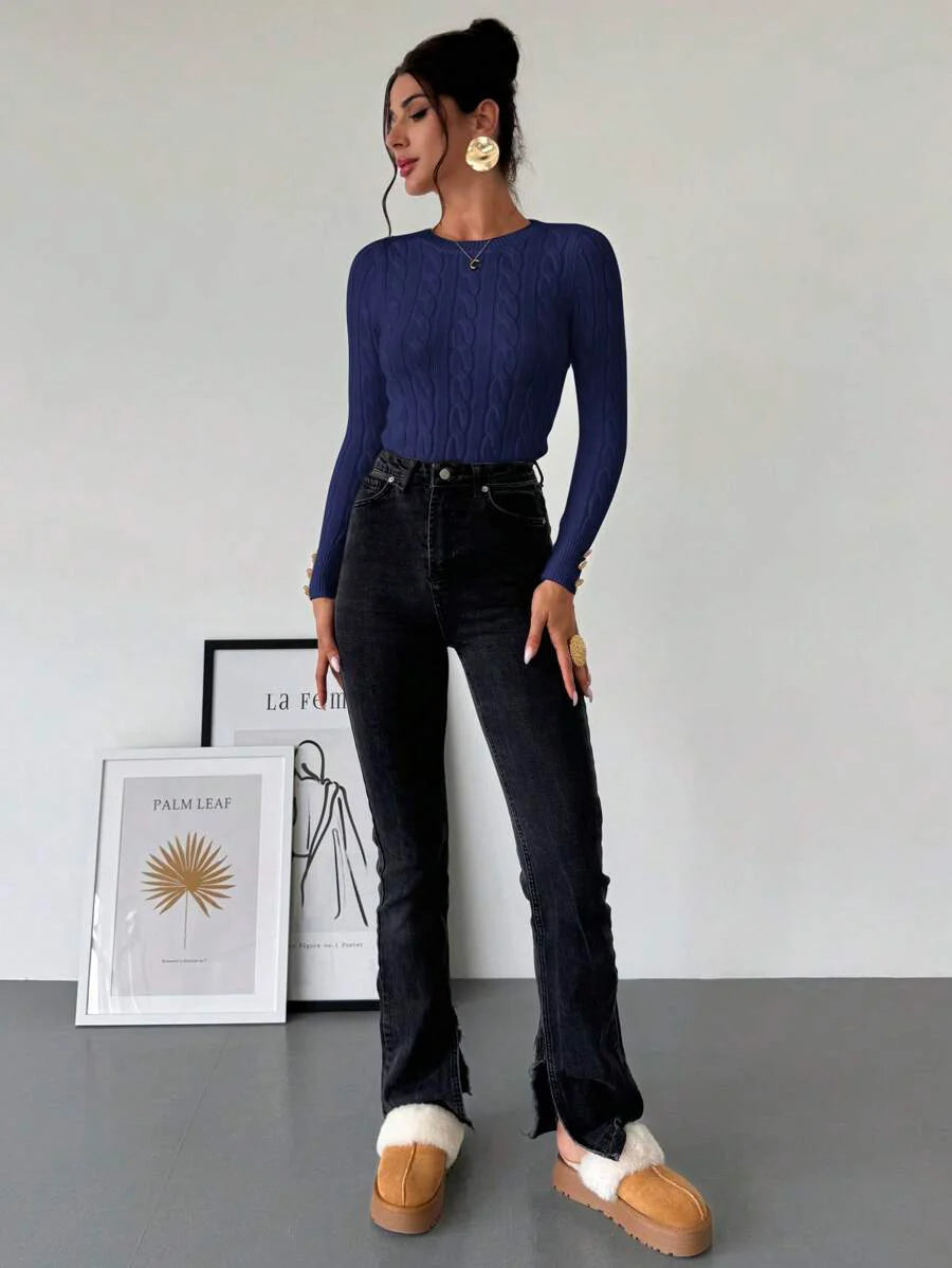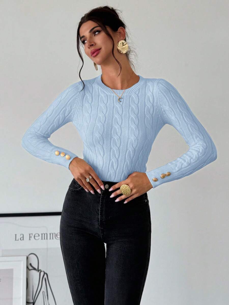 Maglione semplice ed elegante da donna, a collo alto, lavorato a trecce, decorato, aderente, maniche lunghe