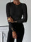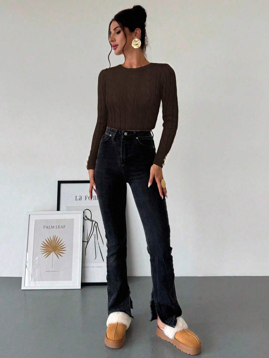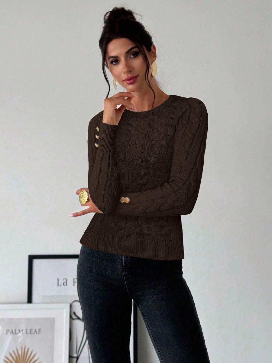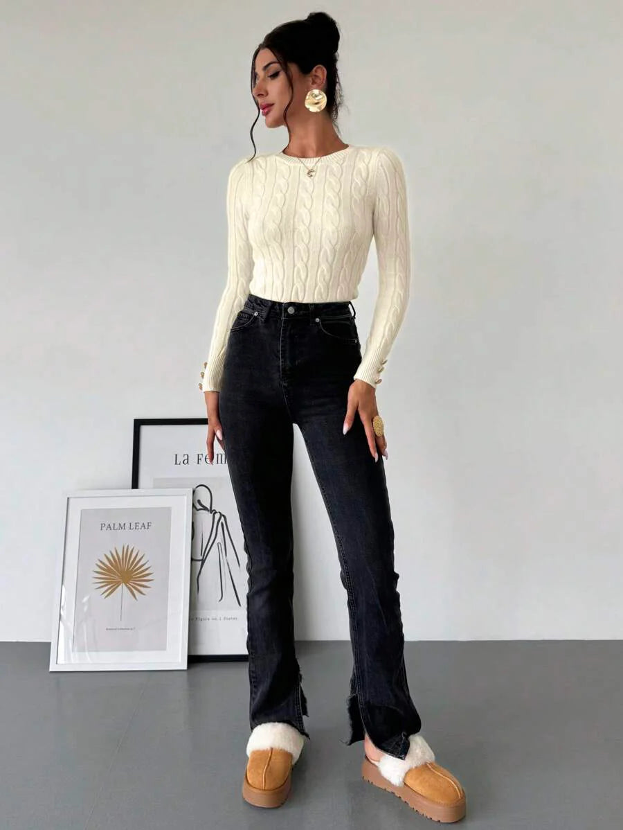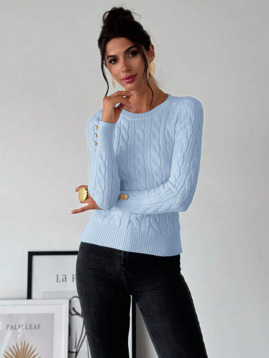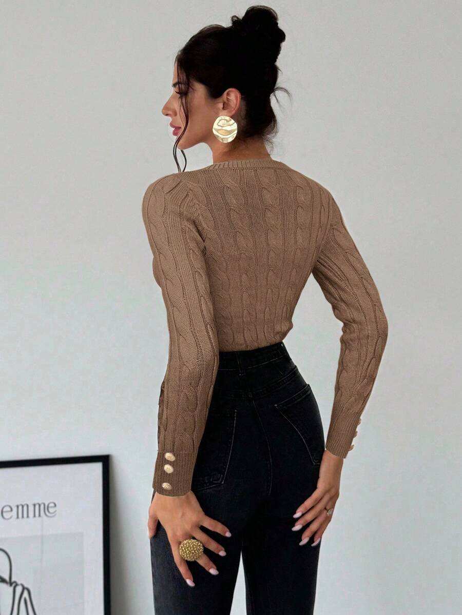 Maglione semplice ed elegante da donna, a collo alto, lavorato a trecce, decorato, aderente, maniche lunghe
